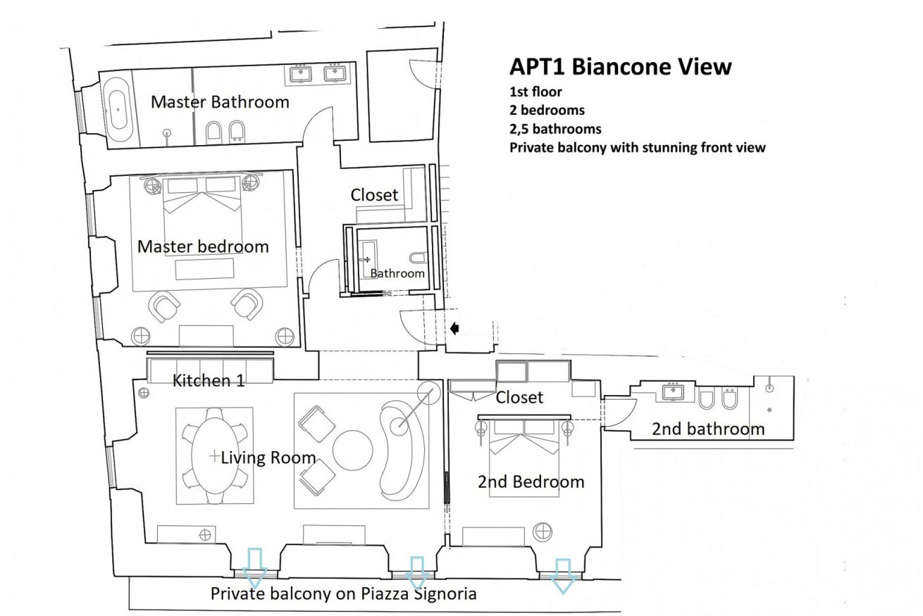 Magnificent apartment overlooking the Piazza della Signoria. It sleeps up to 9 people. Biancone is the jewel in the crown of Palazzo Signoria Luxury Apartments.