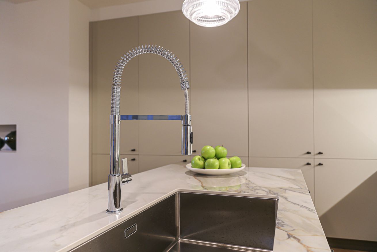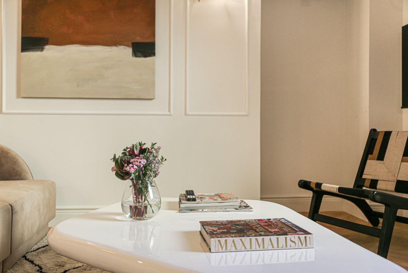 L’appartamento unisce eleganza contemporanea, comfort e funzionalità. Un divano in velluto, lampade di design e un tavolino dalle linee organiche creano un ambiente living chic e accogliente. La zona giorno include un ampio salotto con TV, una sala da pranzo ideale per momenti conviviali e un angolo studio perfetto per chi ha bisogno di restare connesso.