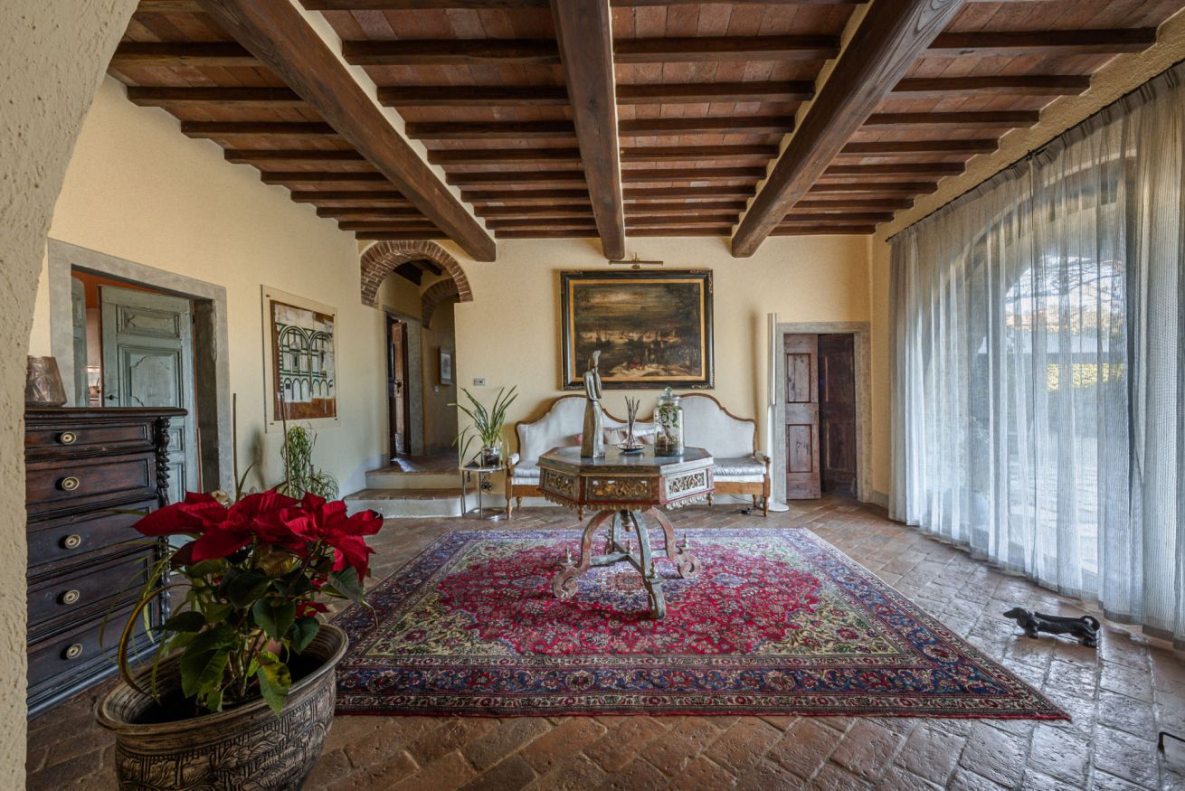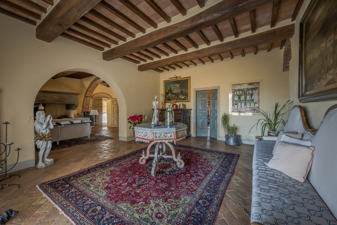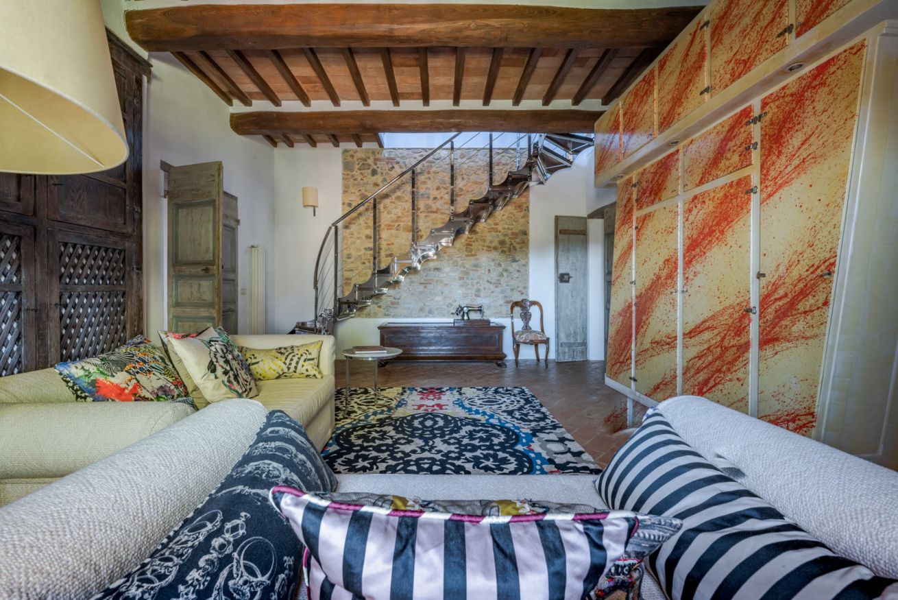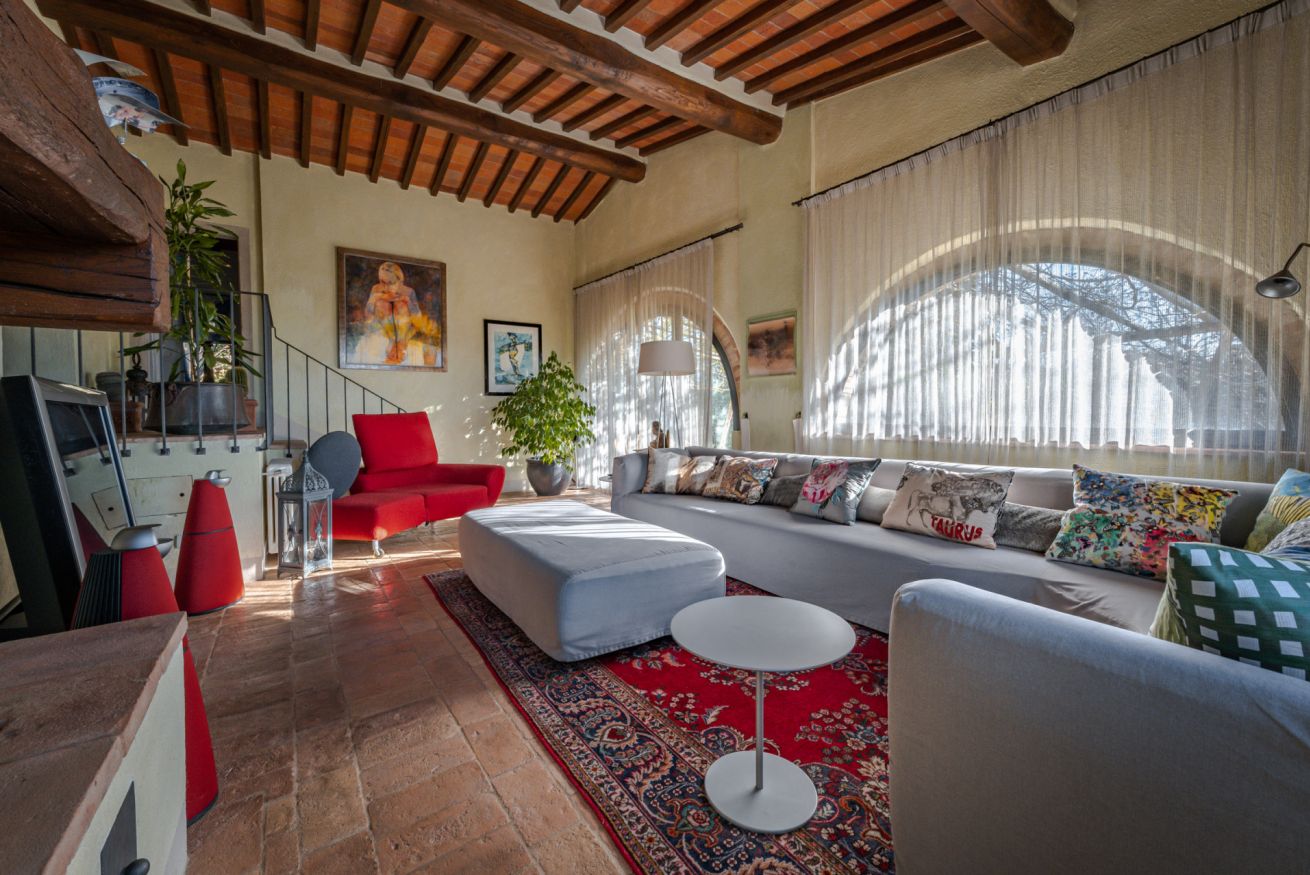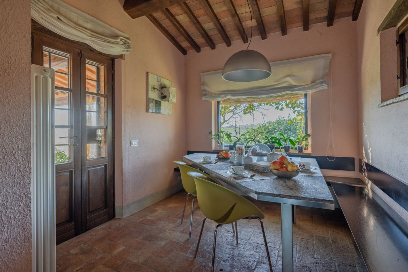 Al piano terra si trova un'elegante anticamera che introduce ad un'area giorno incorniciata da un imponente camino in pietra serena. Questa zona dall'atmosfera calda e familiare, si compone di un salottino e dell'accogliente sala da pranzo, arredata in stile rustico ma con felici incursioni contemporanee. Sia l'atrio che la sala da pranzo confinano con l'ampia e modernissima cucina totalmente attrezzata e dalle dimensioni professionali. Sul retro della cucina si trova anche una piccola area pranzo che accede al giardino, ideale per spuntini leggeri o colazioni.