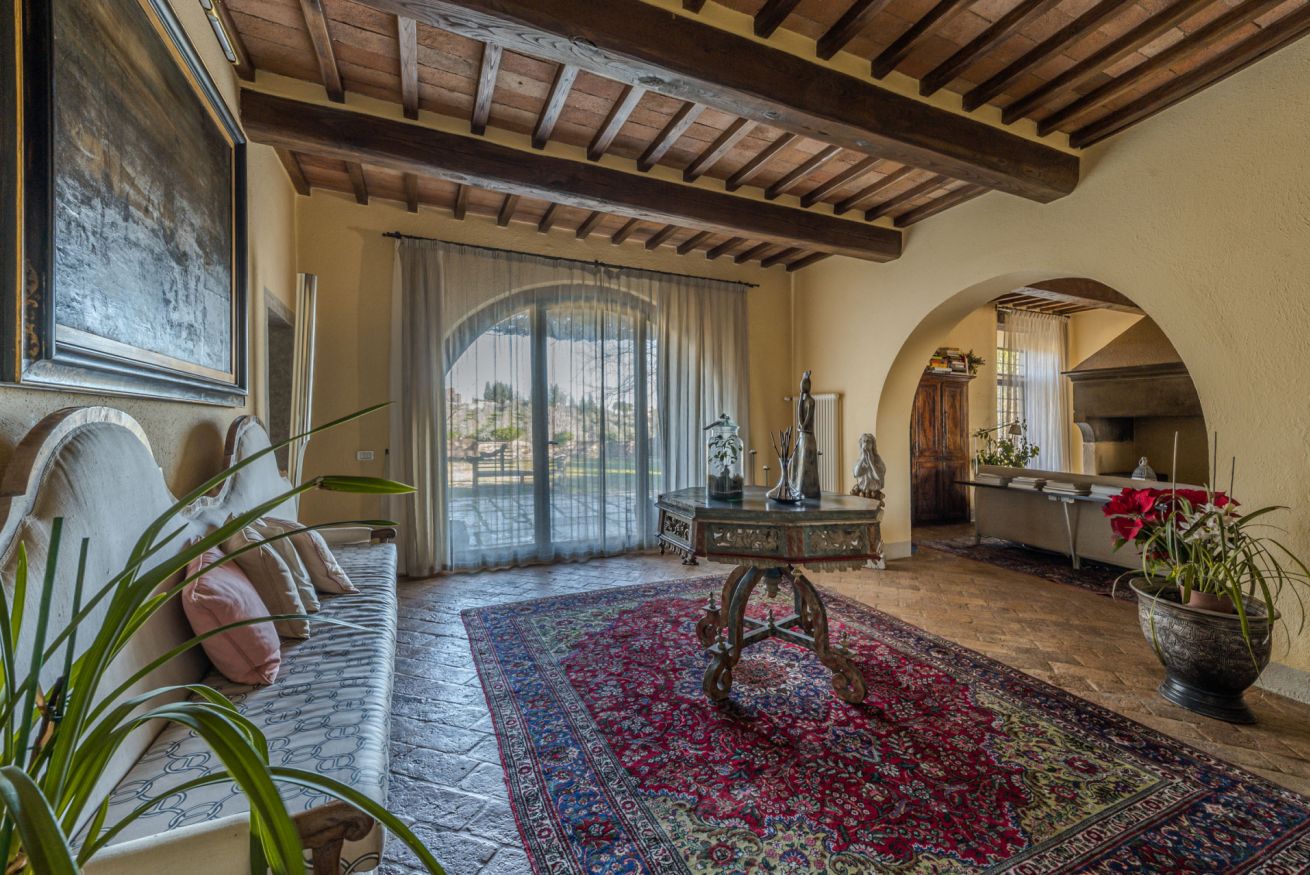 Dalla sala da pranzo principale, scendendo alcuni gradini si accede al salone principale. Questa splendida stanza è inondata di luce naturale grazie alle ampie e numerose porte finestre che si affacciano ed accedono al giardino. L'ambiente è riscaldato e reso accogliente da un grande camino ed ospita un enorme divano e vari altri punti di seduta. Completa il piano una piccola stanza fitness, un bagno completo con doccia ed un ulteriore bagno di servizio.