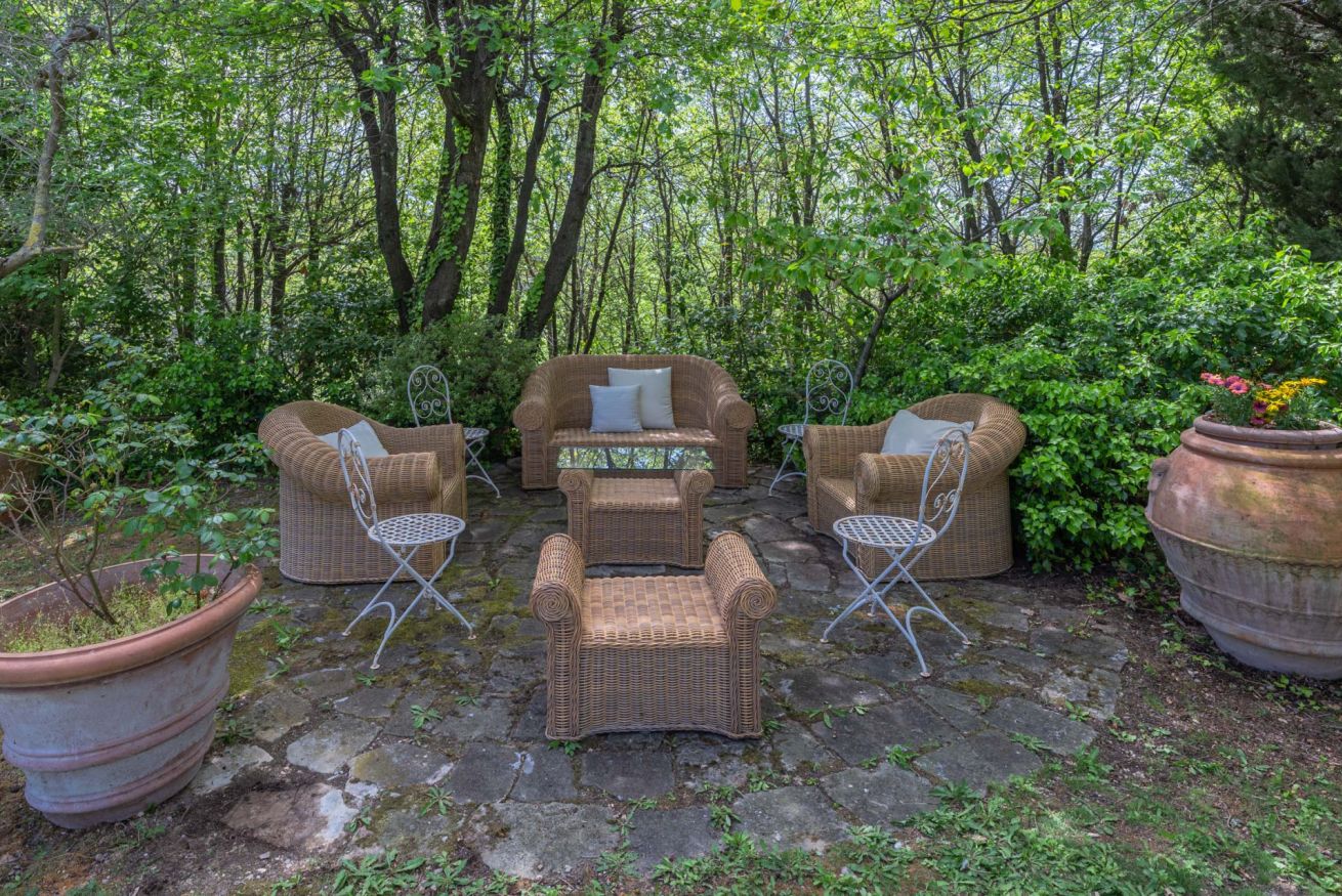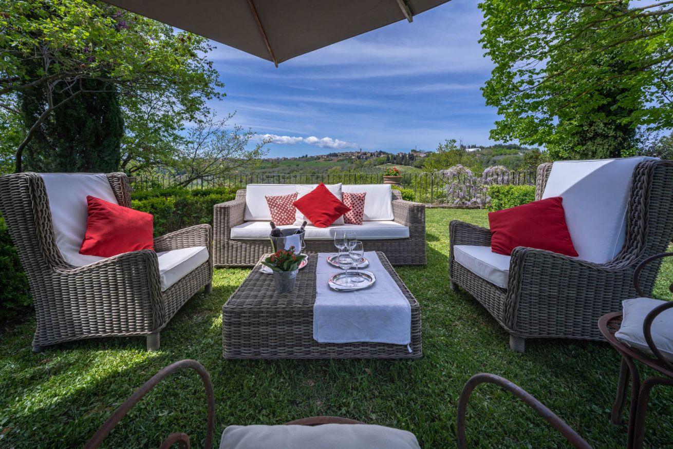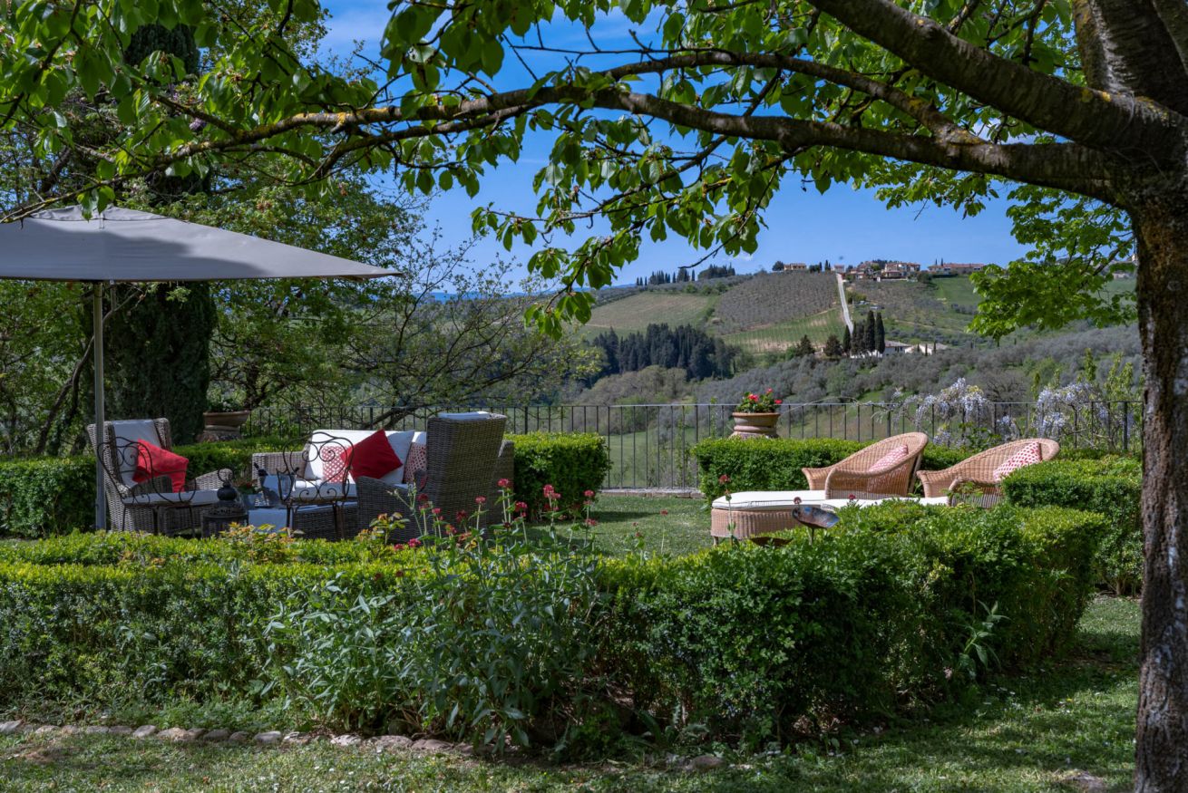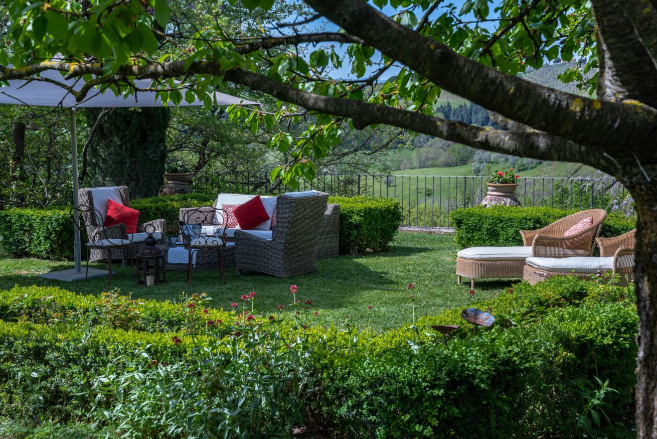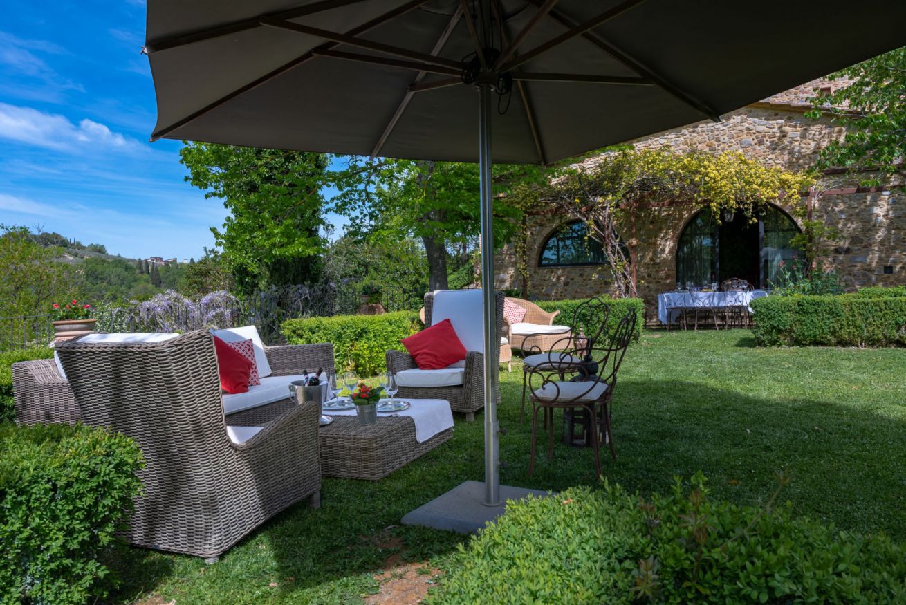 Tutta la proprietà è immersa in un grande spazio verde, arredato con numerose aree living esterne e che offre scorci mozzafiato dei borghi circostanti. La villa è dotata inoltre di una romantica veranda sotto la quale è possibile consumare memorabili pasti al fresco durante la stagione estiva.
