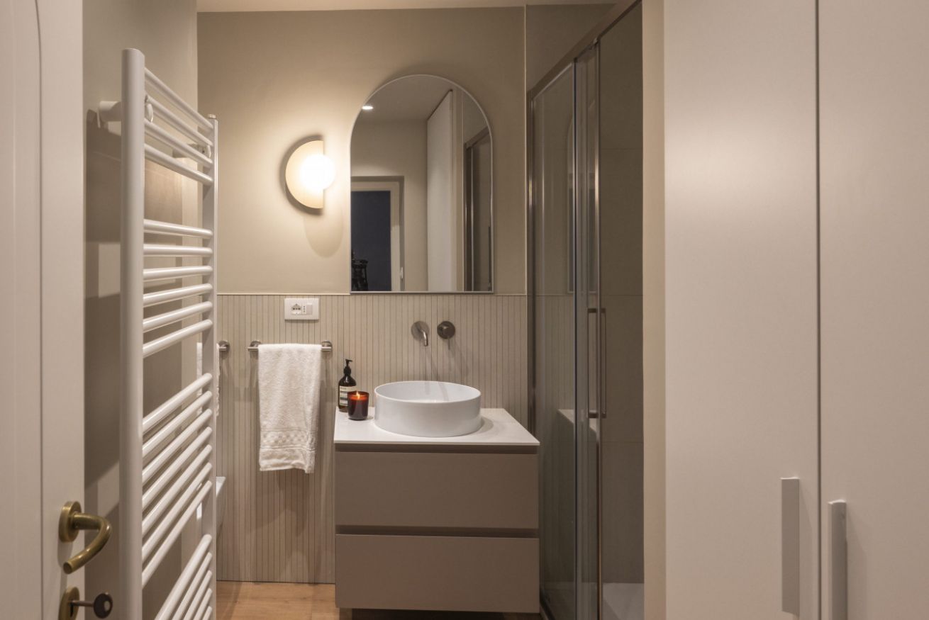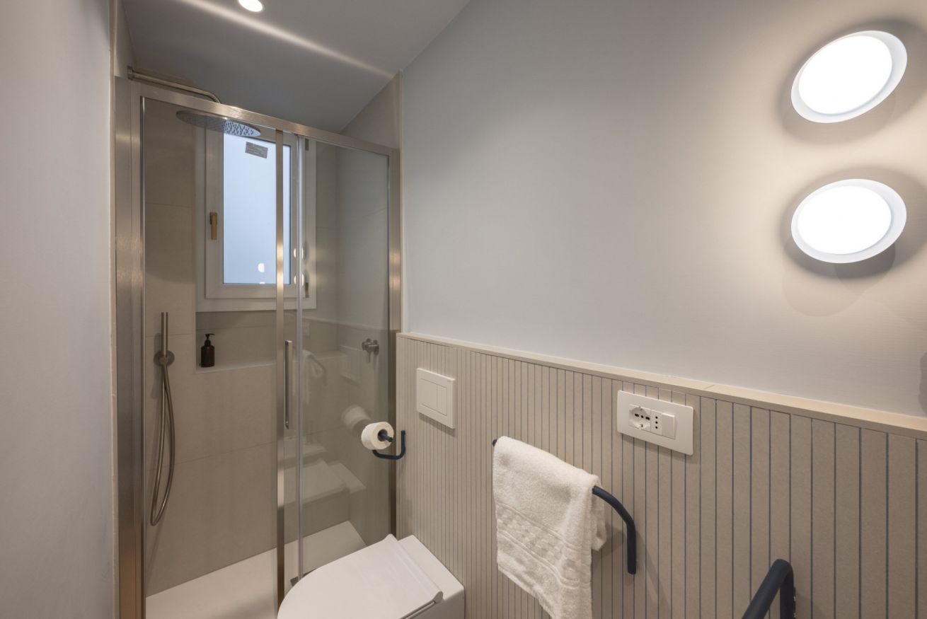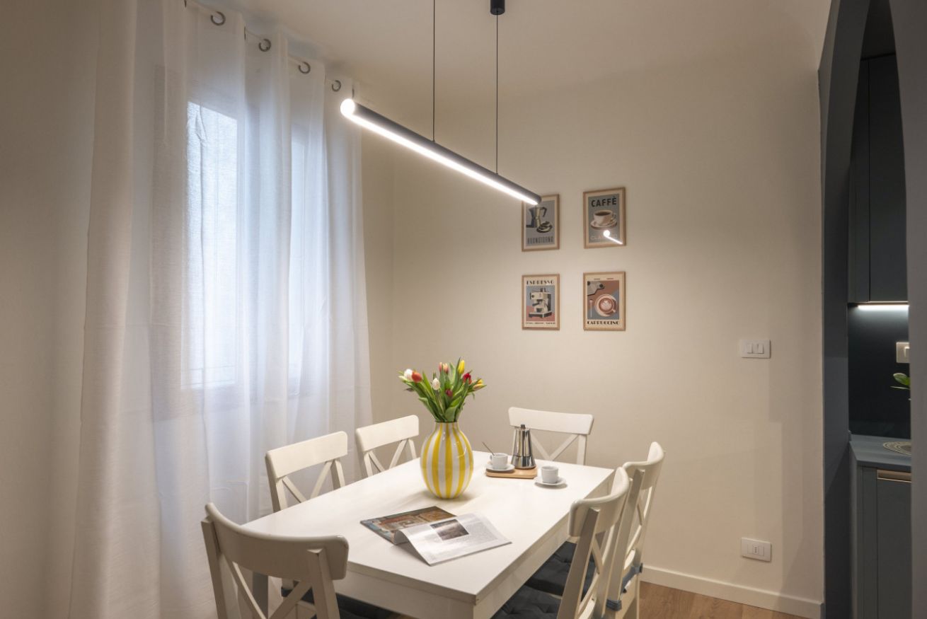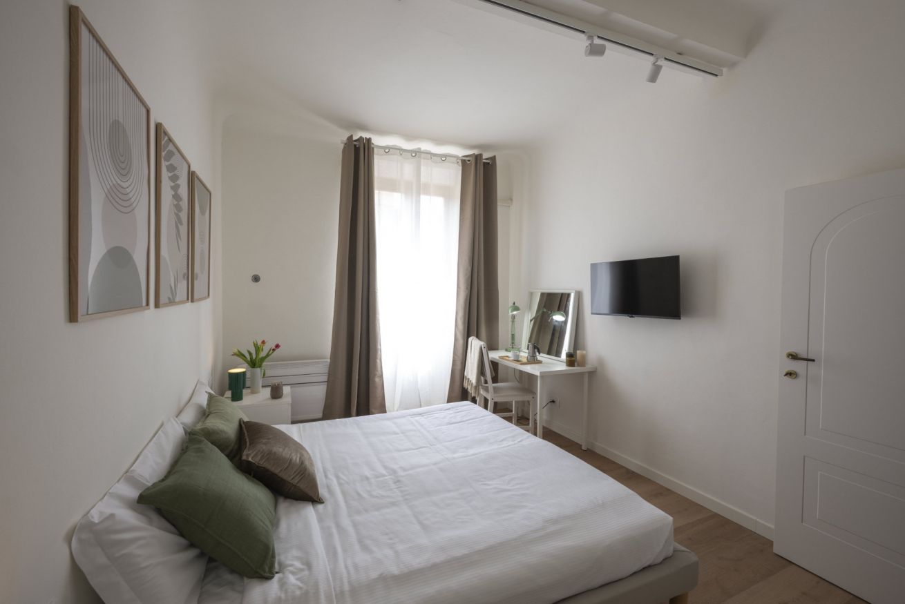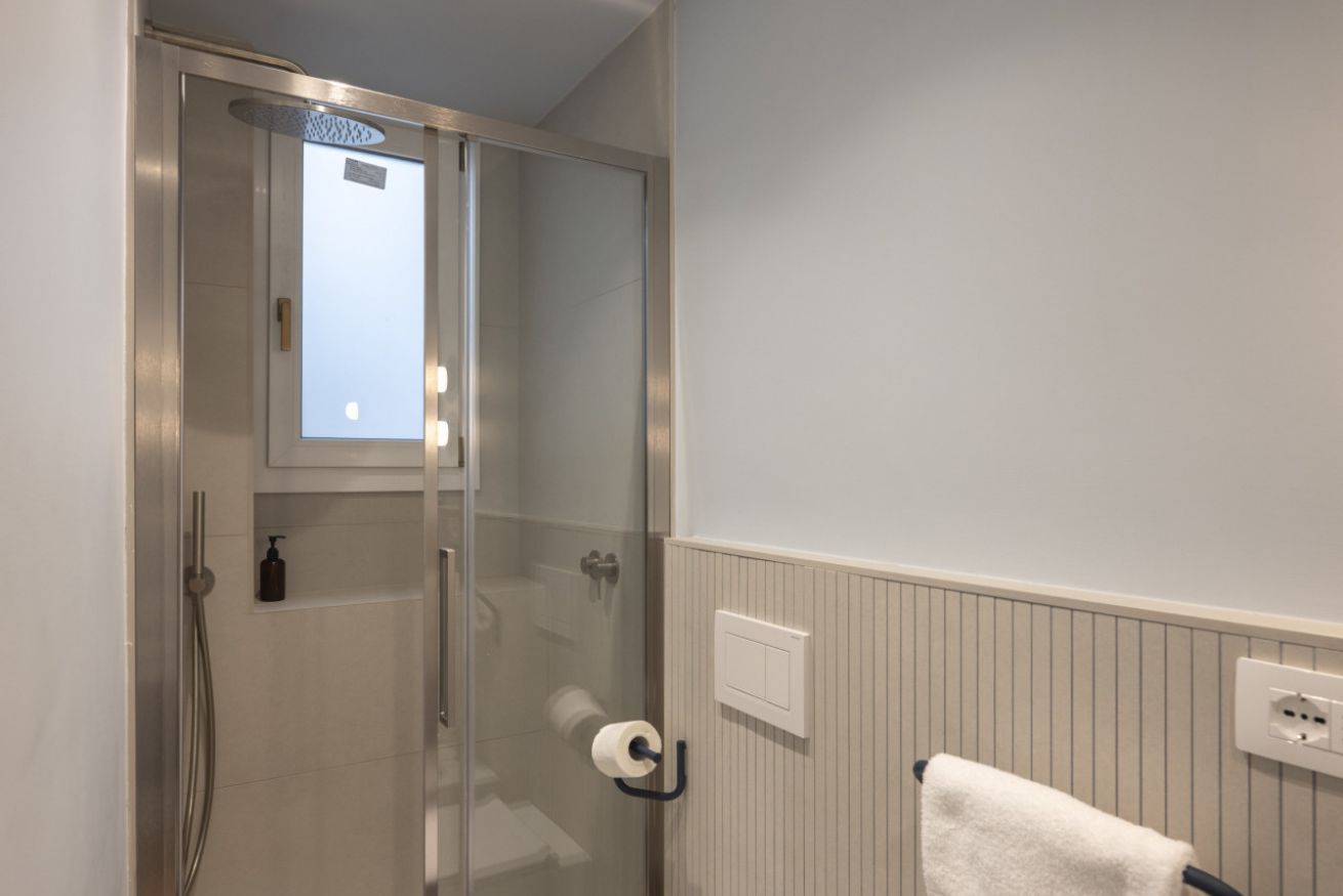 All'interno si apre in un confortevole soggiorno con divano letto singolo e televisore a schermo piatto. Proseguendo si entra nella sala da pranzo con annessa cucina, con tavolo da 6 persone, forno, lavastoviglie, lavatrice, 4 fuochi, forno a microonde e bollitore. Dalla cucina si prosegue lungo un corridoio sul quale si affacciano tre camere da letto doppie, dotate di due letti ciascuna con armadio, comodini e, in una di esse, una comoda scrivania. Dalle camere si può scorgere attraverso i tetti di Firenze una splendida vista della cupola del Duomo di Brunelleschi e del mercato centrale di San Lorenzo. I bagni sono dotati di tutti i confort necessari, entrambi finestrati, con box doccia.