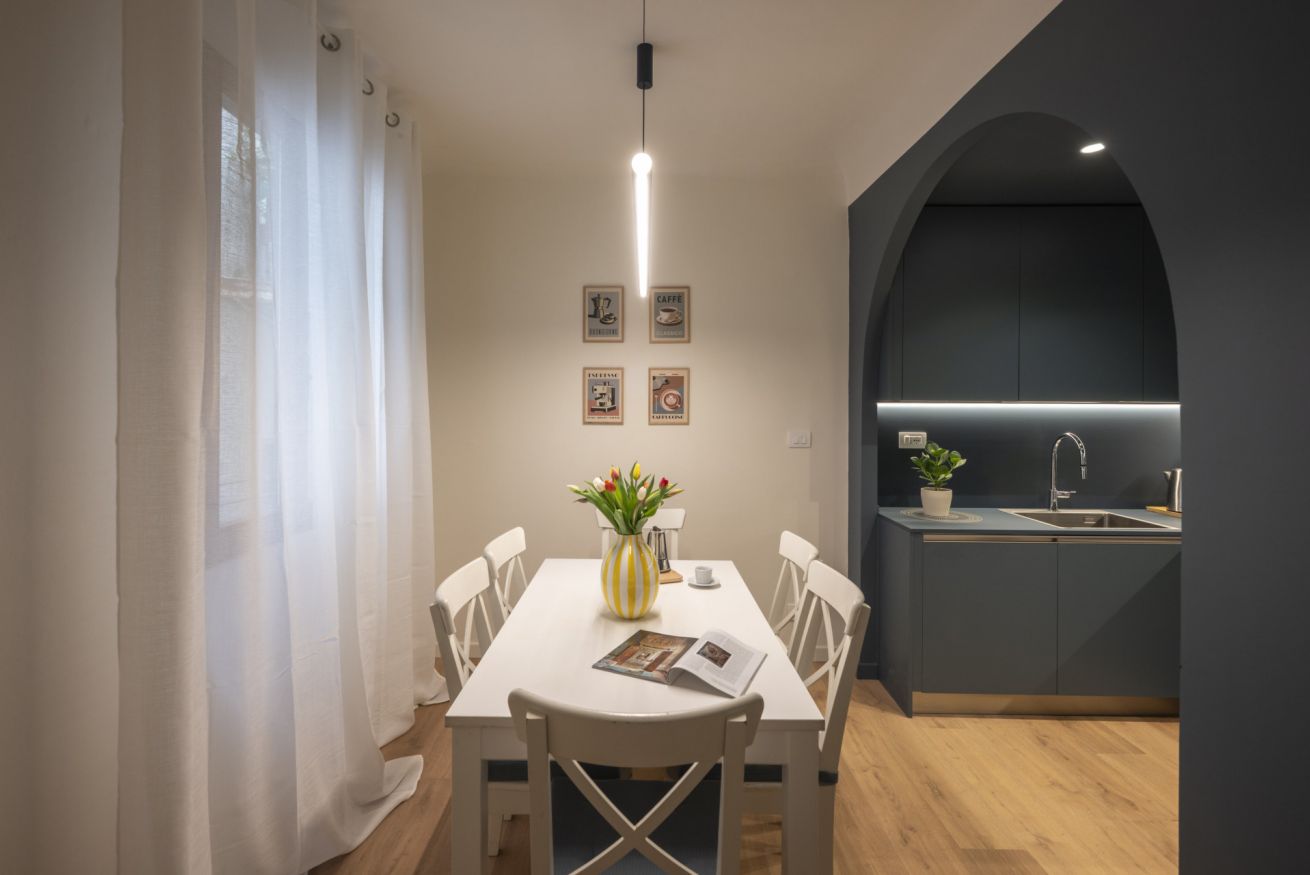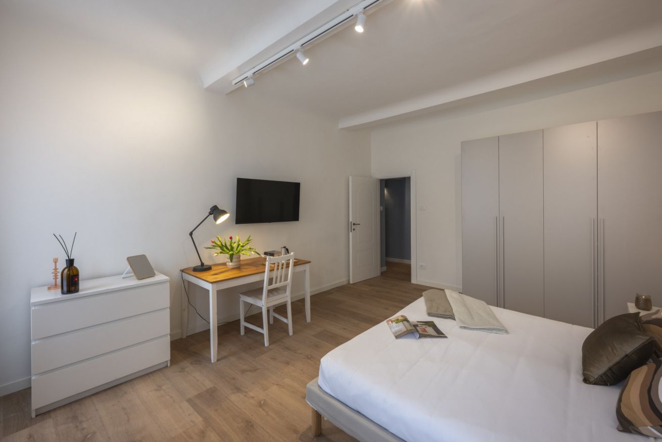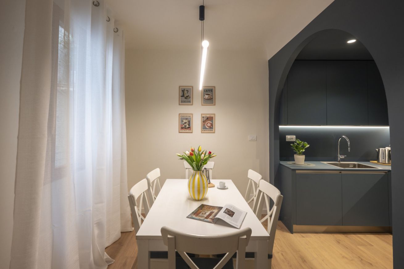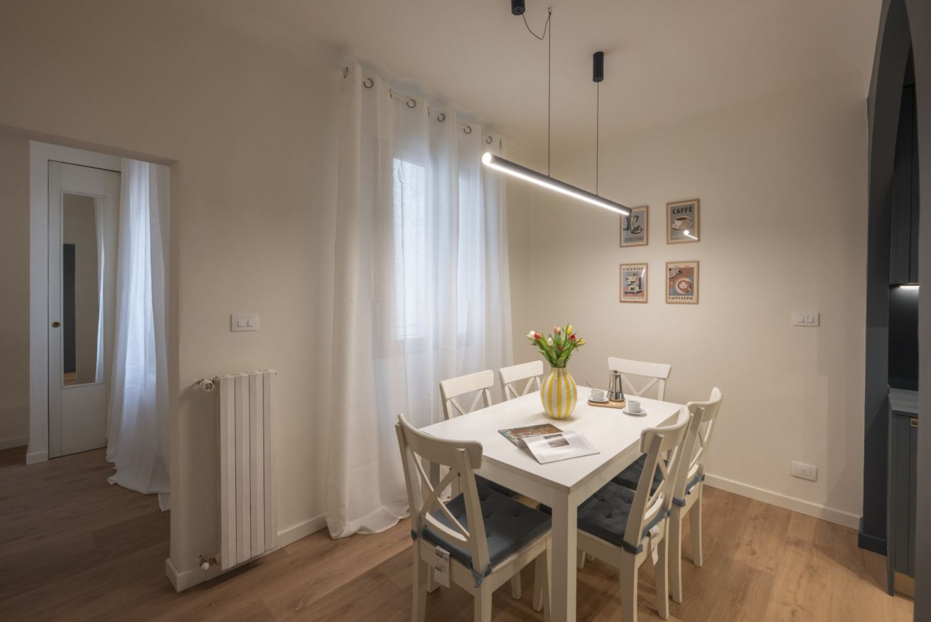 All'interno si apre in un confortevole soggiorno con divano letto singolo e televisore a schermo piatto. Proseguendo si entra nella sala da pranzo con annessa cucina, con tavolo da 6 persone, forno, lavastoviglie, lavatrice, 4 fuochi, forno a microonde e bollitore. Dalla cucina si prosegue lungo un corridoio sul quale si affacciano tre camere da letto doppie, dotate di due letti ciascuna con armadio, comodini e, in una di esse, una comoda scrivania. Dalle camere si può scorgere attraverso i tetti di Firenze una splendida vista della cupola del Duomo di Brunelleschi e del mercato centrale di San Lorenzo. I bagni sono dotati di tutti i confort necessari, entrambi finestrati, con box doccia.