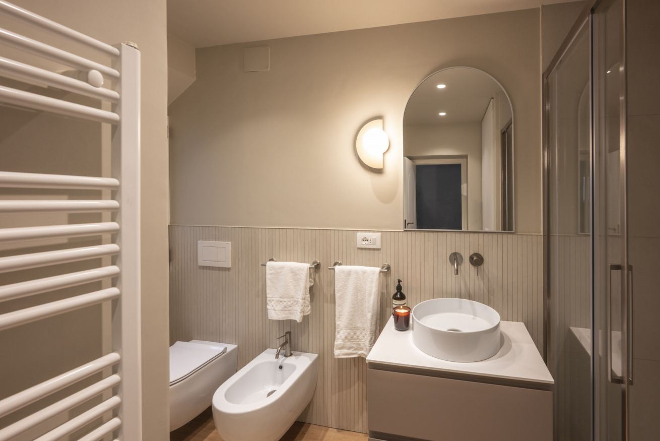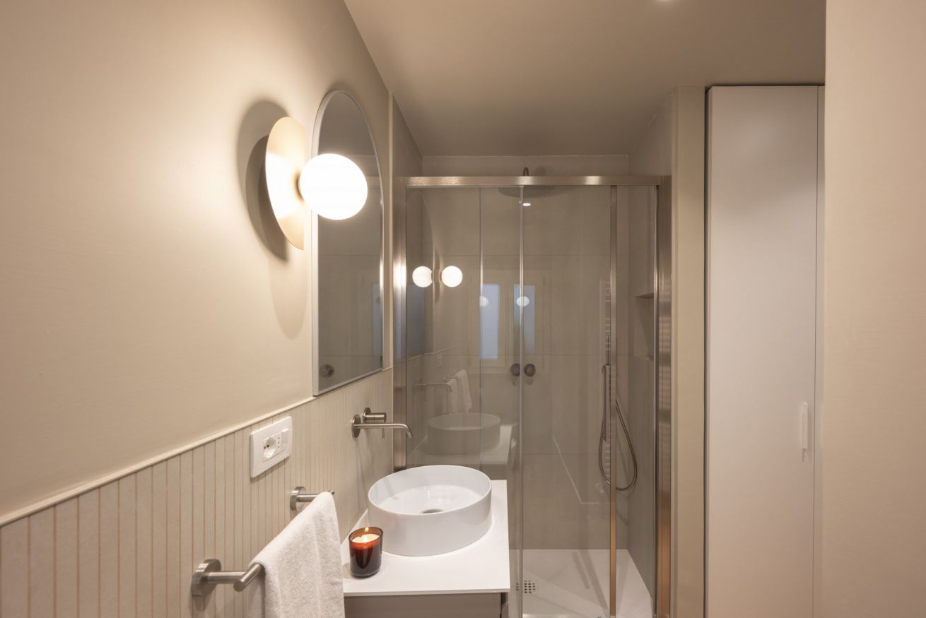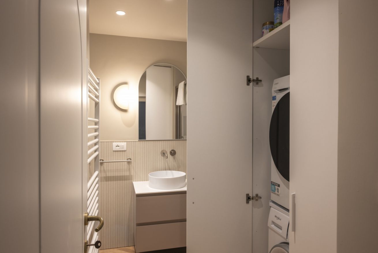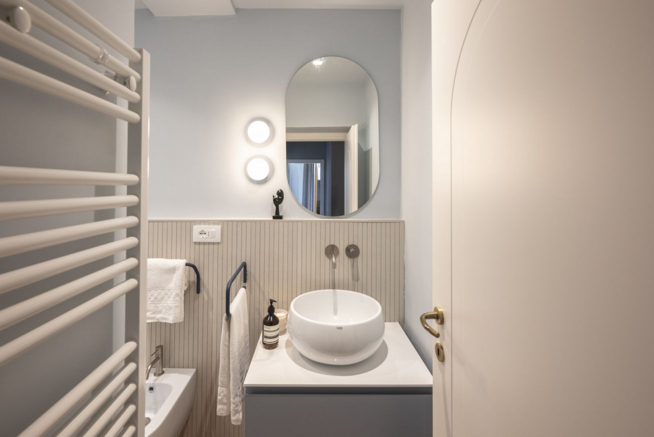 All'interno si apre in un confortevole soggiorno con divano letto singolo e televisore a schermo piatto. Proseguendo si entra nella sala da pranzo con annessa cucina, con tavolo da 6 persone, forno, lavastoviglie, lavatrice, 4 fuochi, forno a microonde e bollitore. Dalla cucina si prosegue lungo un corridoio sul quale si affacciano tre camere da letto doppie, dotate di due letti ciascuna con armadio, comodini e, in una di esse, una comoda scrivania. Dalle camere si può scorgere attraverso i tetti di Firenze una splendida vista della cupola del Duomo di Brunelleschi e del mercato centrale di San Lorenzo. I bagni sono dotati di tutti i confort necessari, entrambi finestrati, con box doccia.