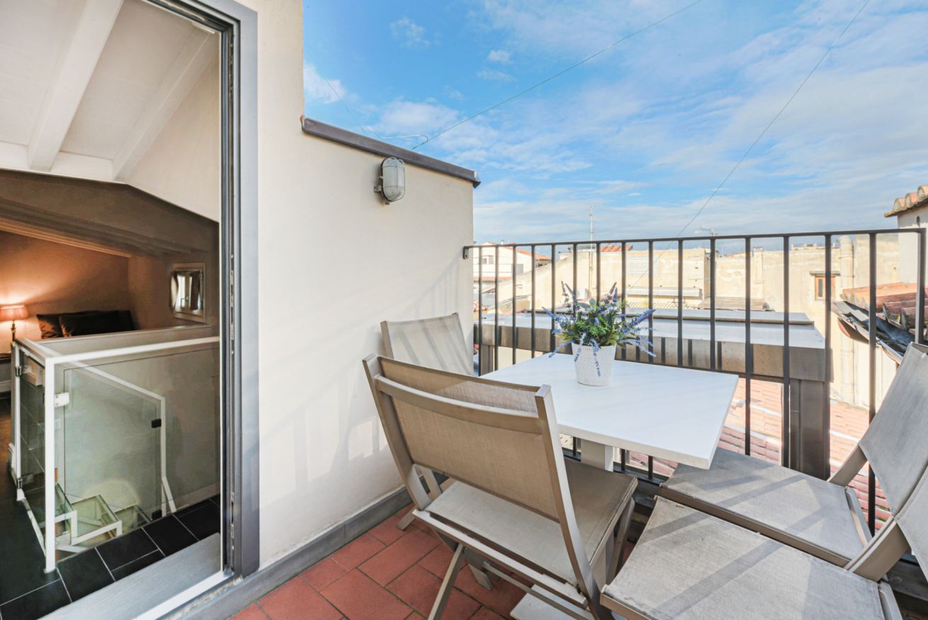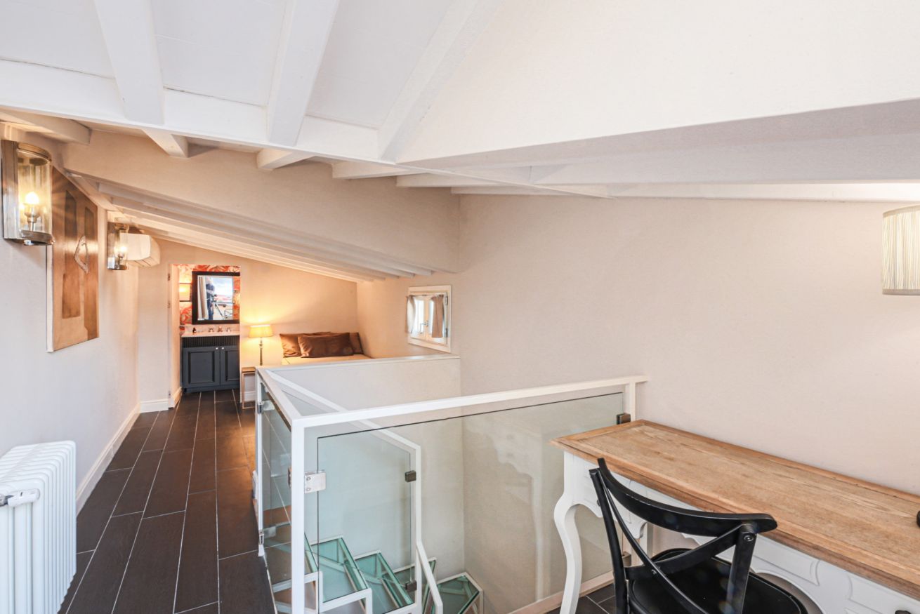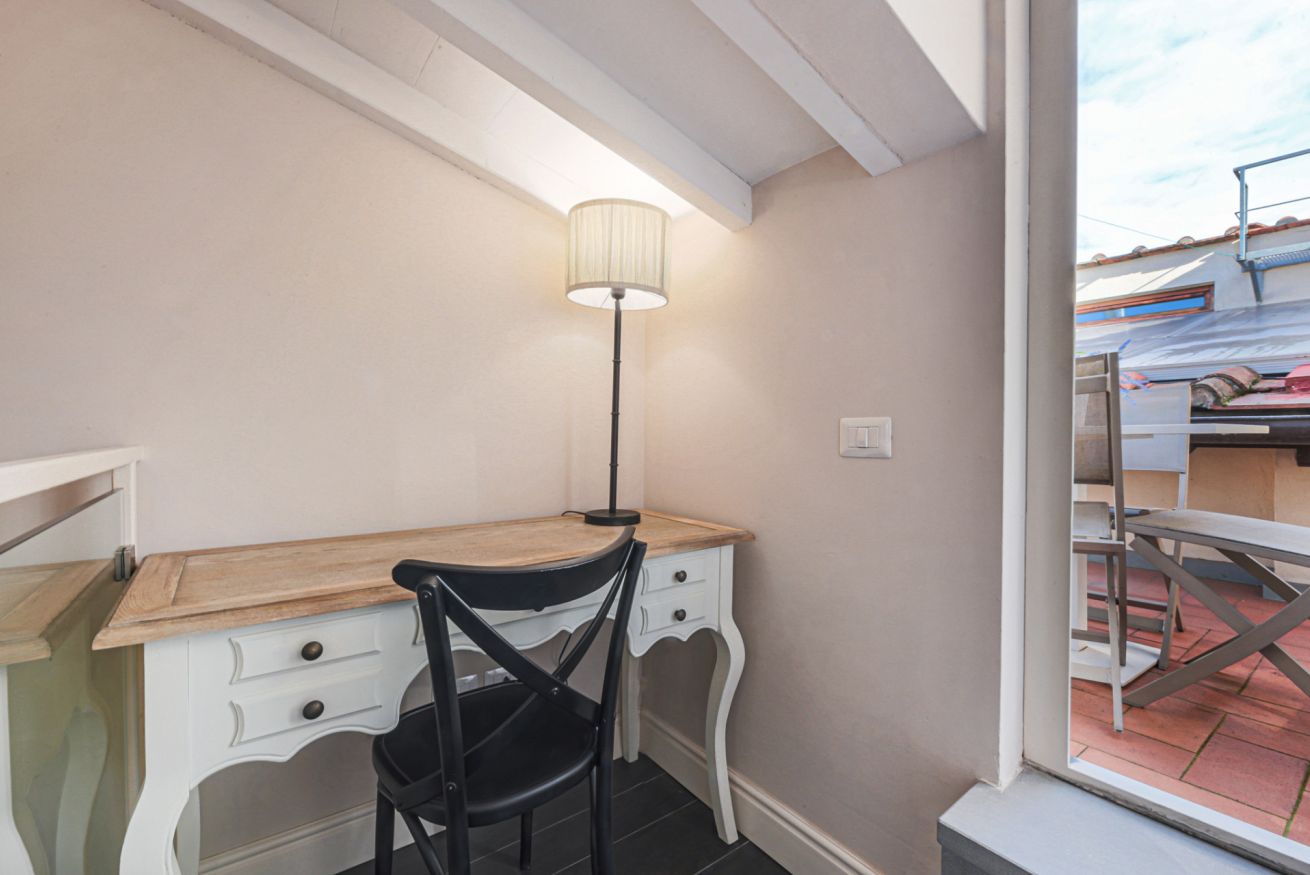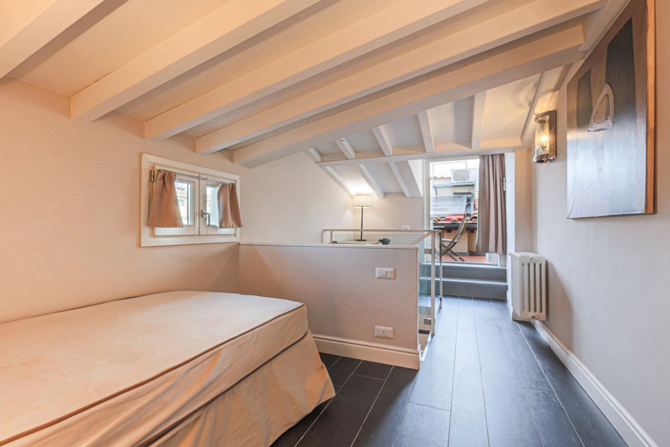 Un'elegante scala in vetro e metallo conduce al soppalco, dove si trova la camera da letto con soffitto in travi a vista. La stanza è arredata con un letto singolo, una scrivania ed un delizioso bagno en-suite. La camera è illuminata da una porta finestra che conduce ad un delizioso terrazzino a tasca dal romantico affaccio sui tetti fiorentini.