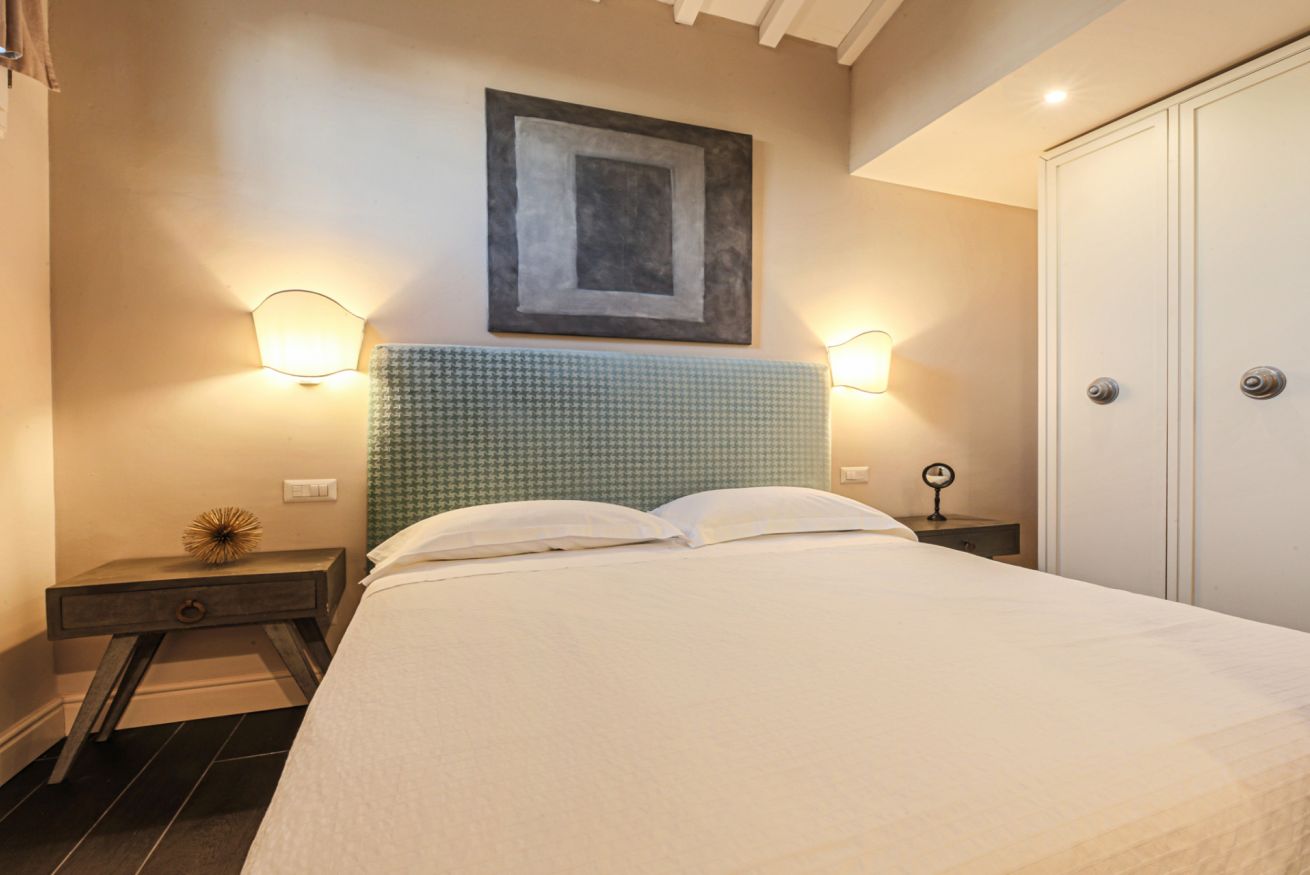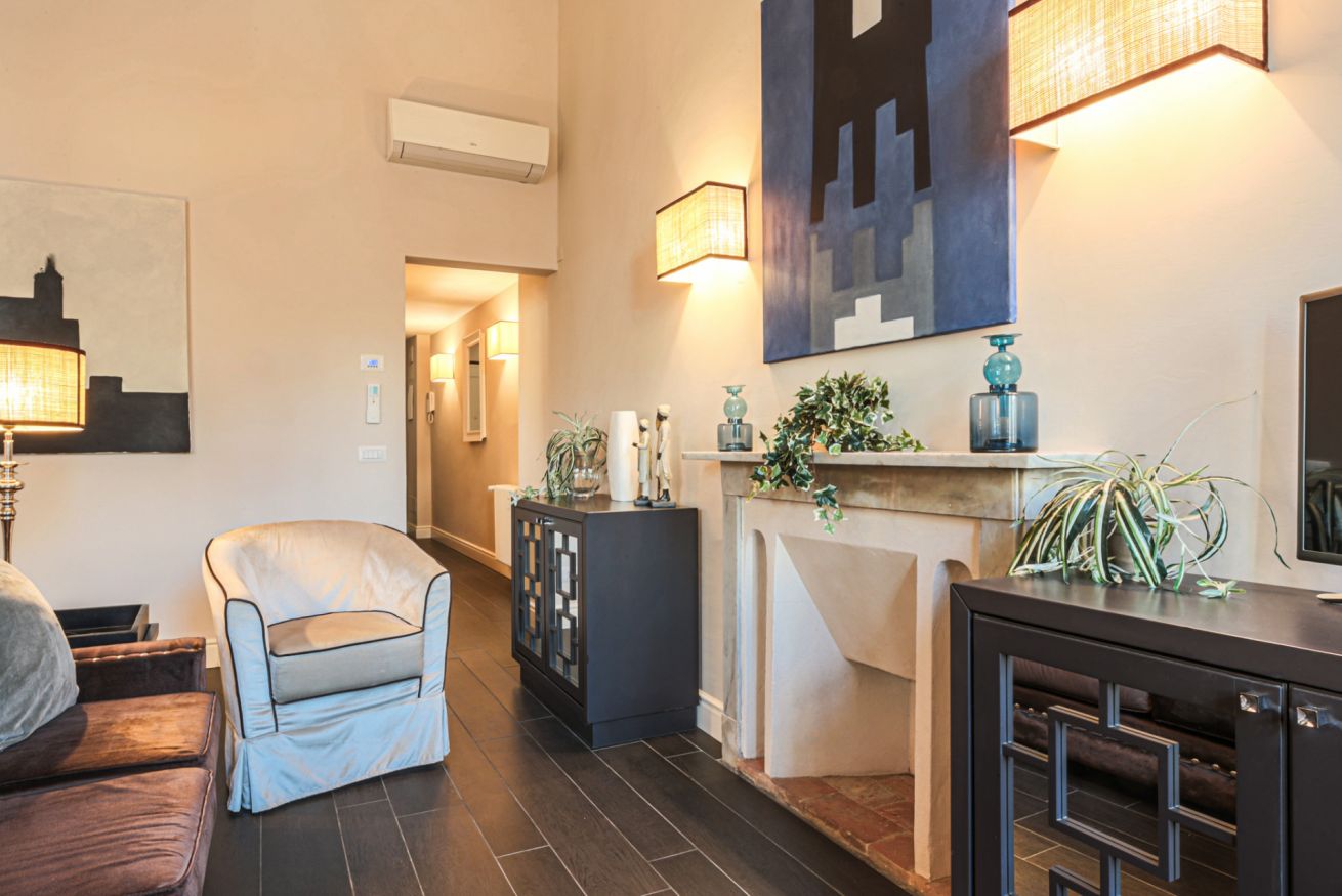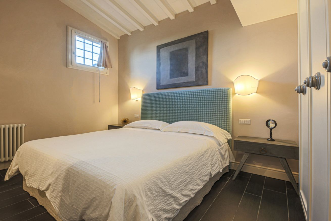 Un'elegante scala in vetro e metallo conduce al soppalco, dove si trova la camera da letto con soffitto in travi a vista. La stanza è arredata con un letto singolo, una scrivania ed un delizioso bagno en-suite. La camera è illuminata da una porta finestra che conduce ad un delizioso terrazzino a tasca dal romantico affaccio sui tetti fiorentini.
