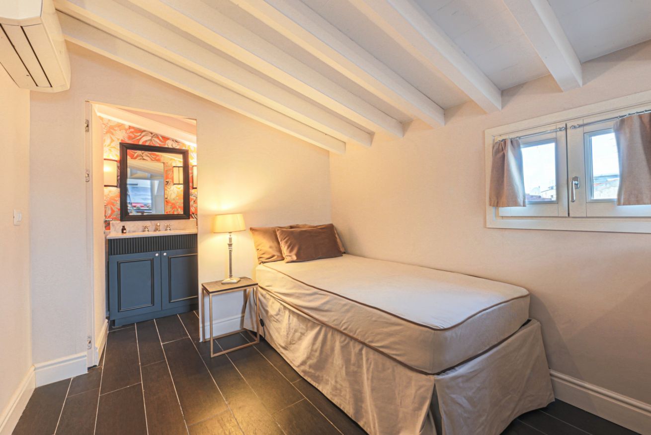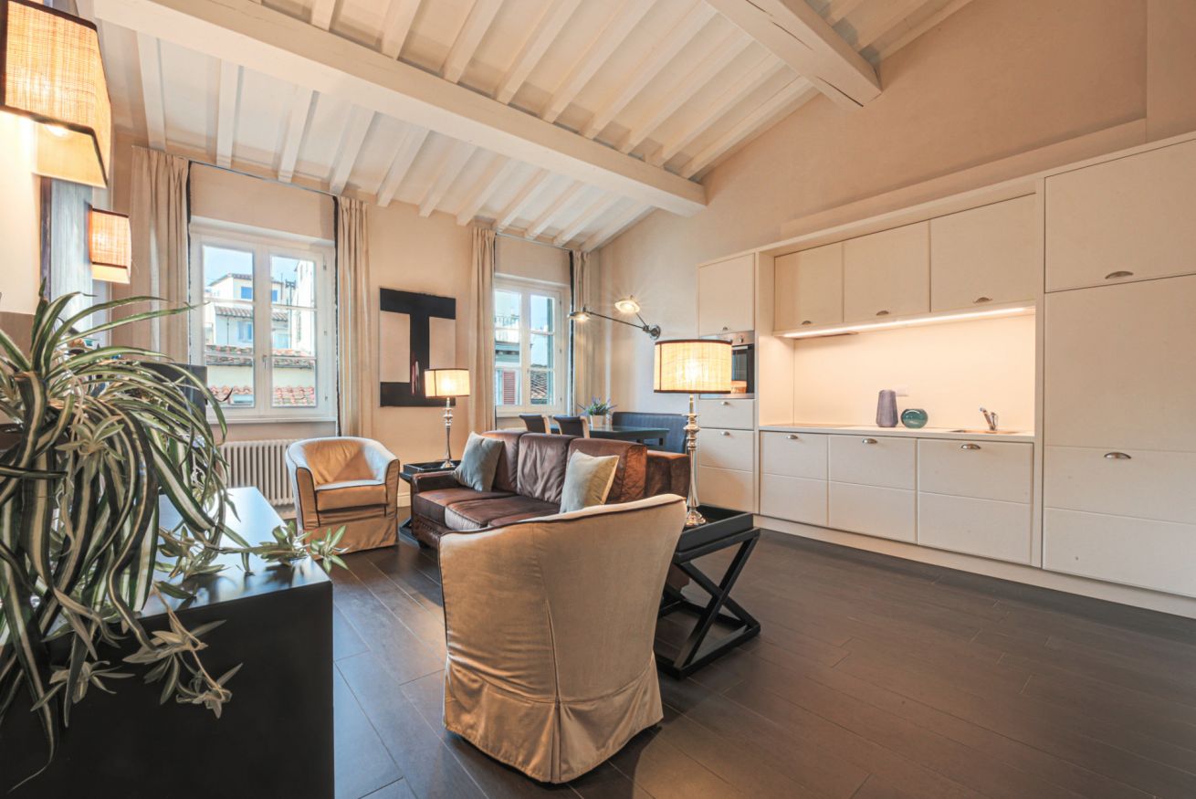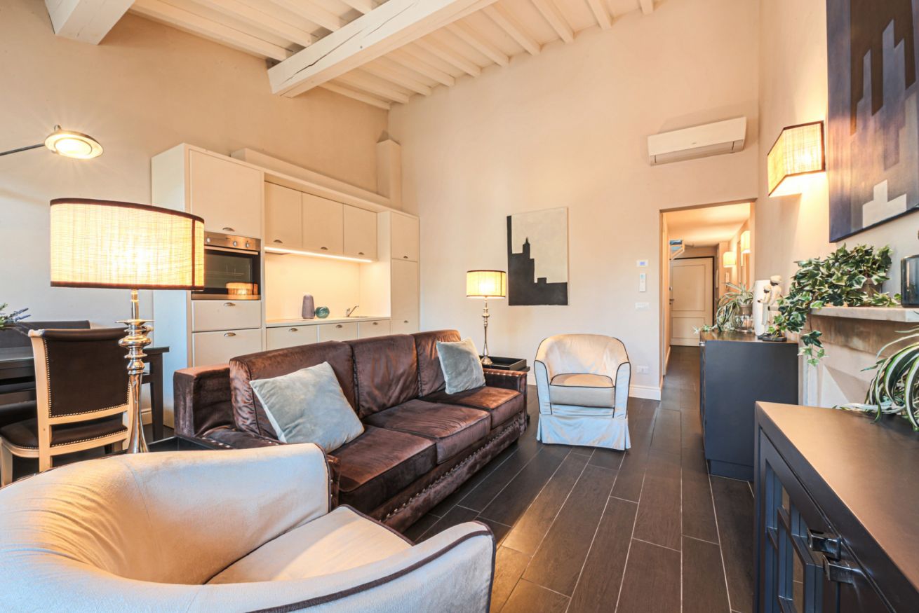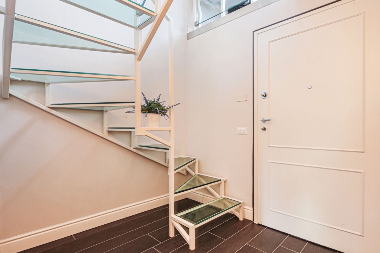 Un'elegante scala in vetro e metallo conduce al soppalco, dove si trova la camera da letto con soffitto in travi a vista. La stanza è arredata con un letto singolo, una scrivania ed un delizioso bagno en-suite. La camera è illuminata da una porta finestra che conduce ad un delizioso terrazzino a tasca dal romantico affaccio sui tetti fiorentini.