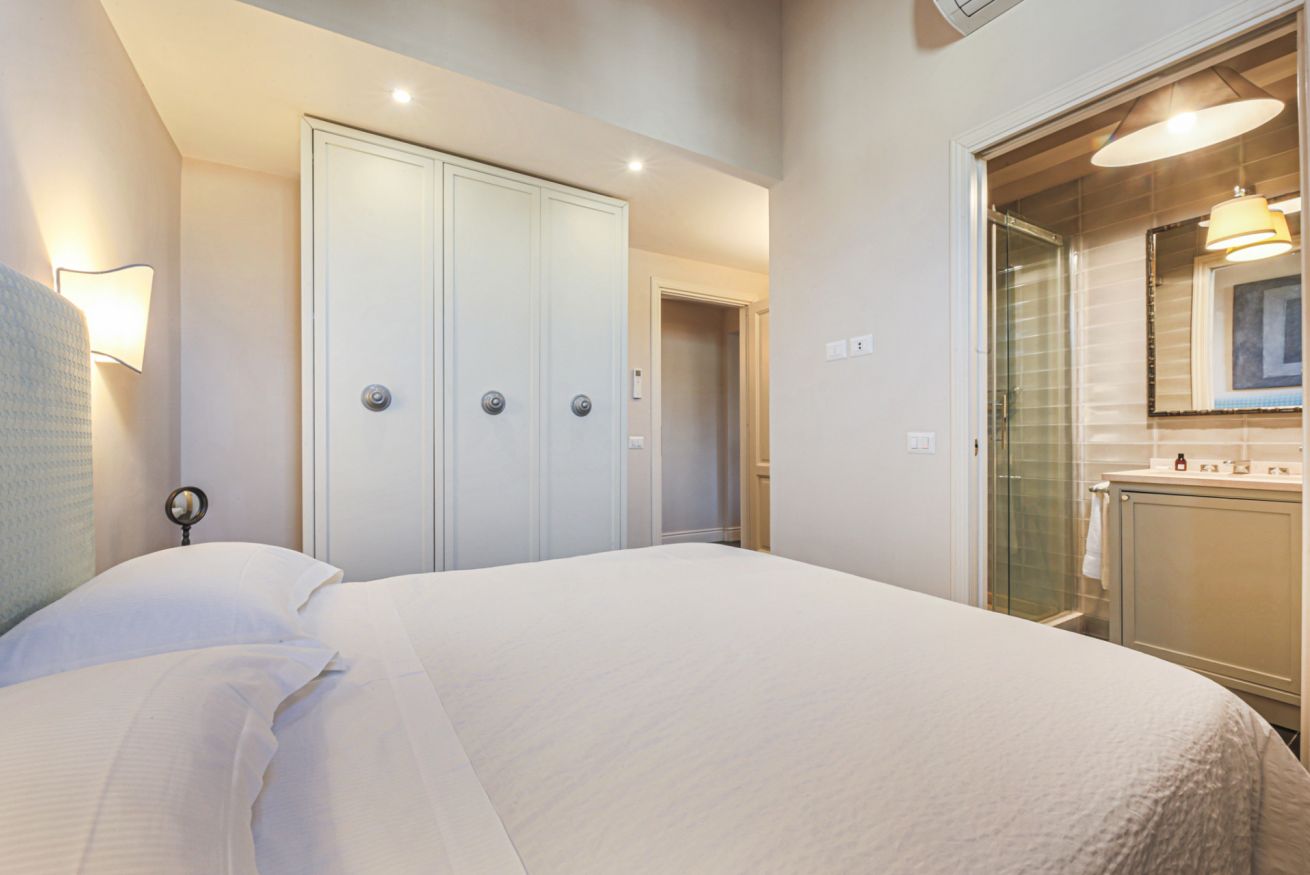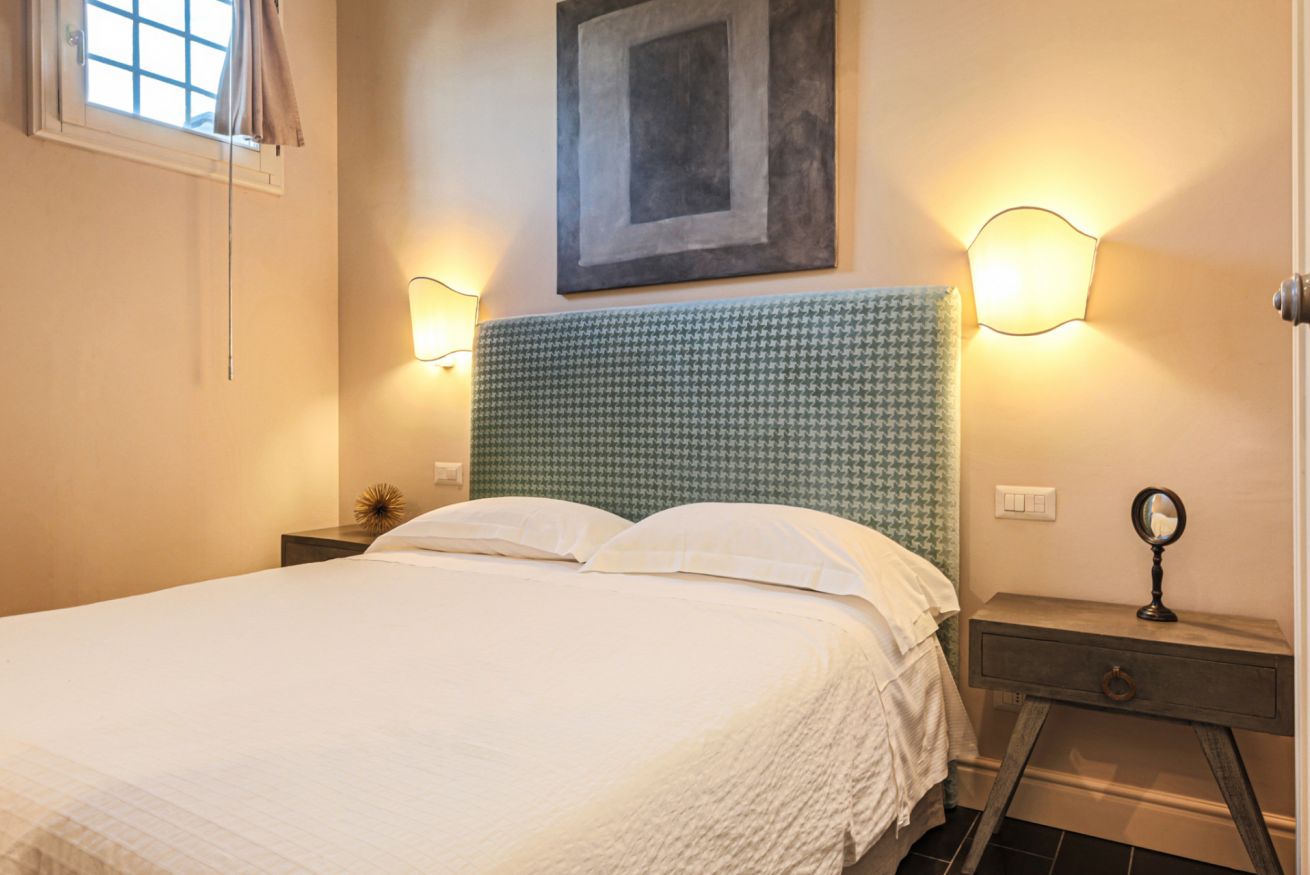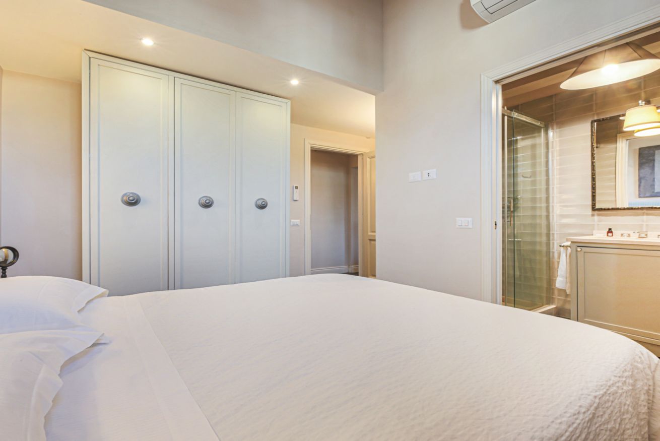 Sullo stesso piano si trova l'ampia camera matrimoniale, arredata con gusto e richiami geometrici, dotata di armadio e di un moderno bagno en-suite dalla doccia capiente.