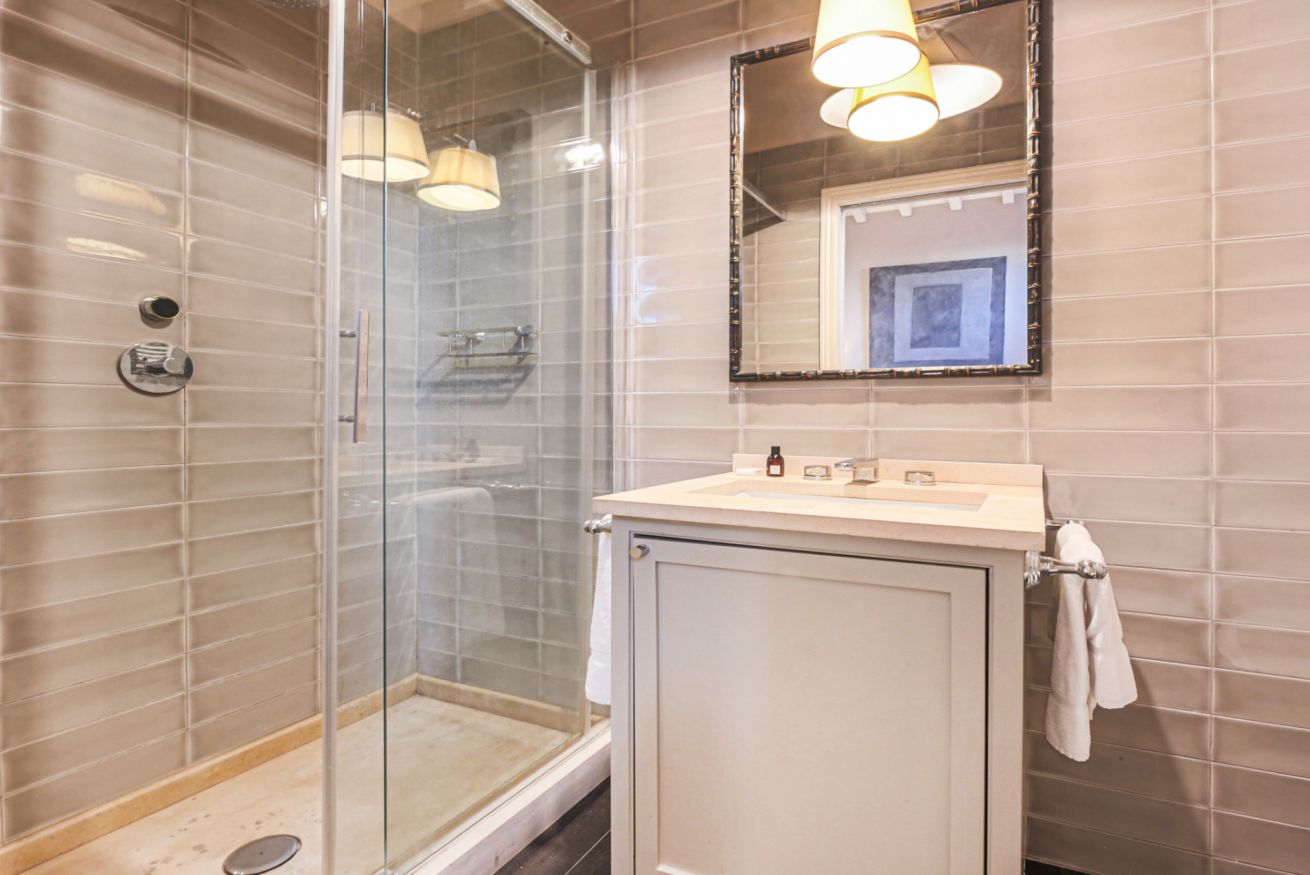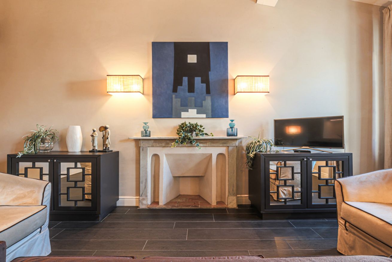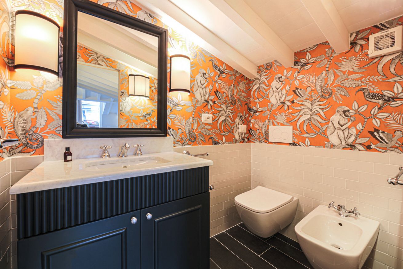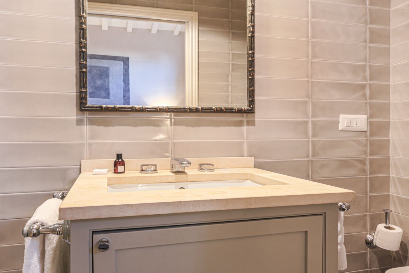 Sullo stesso piano si trova l'ampia camera matrimoniale, arredata con gusto e richiami geometrici, dotata di armadio e di un moderno bagno en-suite dalla doccia capiente.
