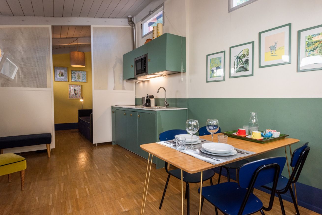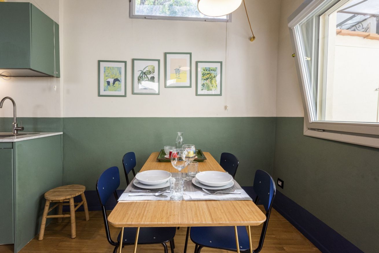Entrando nell'appartamento ci si trova nell'ampio corridoio che collega tutte le stanze. Dal cortile interno si accede direttamente nella zona pranzo composta da una moderna cucina color salvia totalmente attrezzata e con un ampio tavolo a 4 sedute illuminato da una grande finestra che dà sulla corte. Proseguendo, separato da un componente di arredo, lo spazio soggiorno con un comodo divano, TV e poltrone. Il corridoio termina con la camera da letto, arredata con fantasia e dallo spiccato gusto contemporaneo che si ritrova anche nel moderno bagno con doccia.