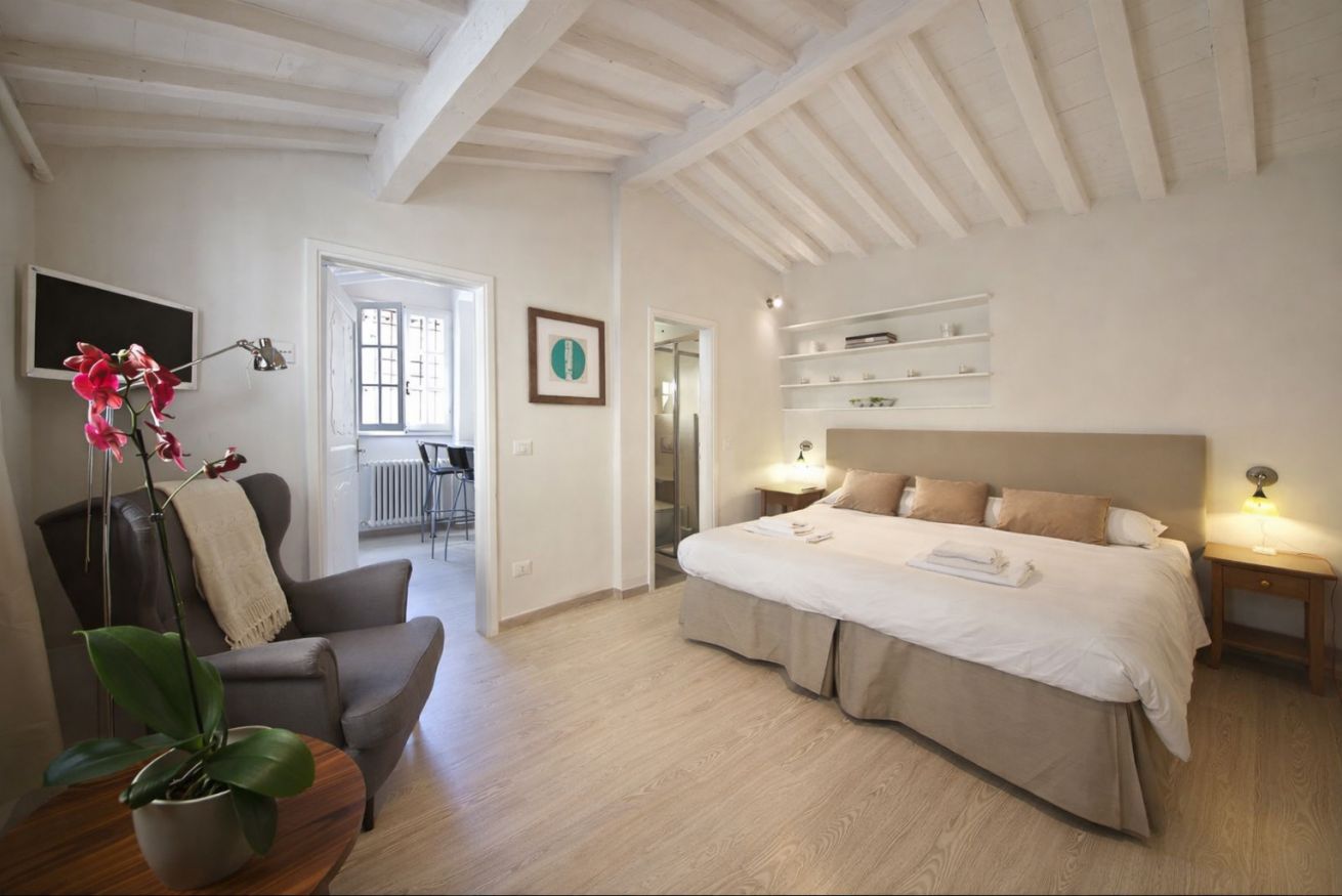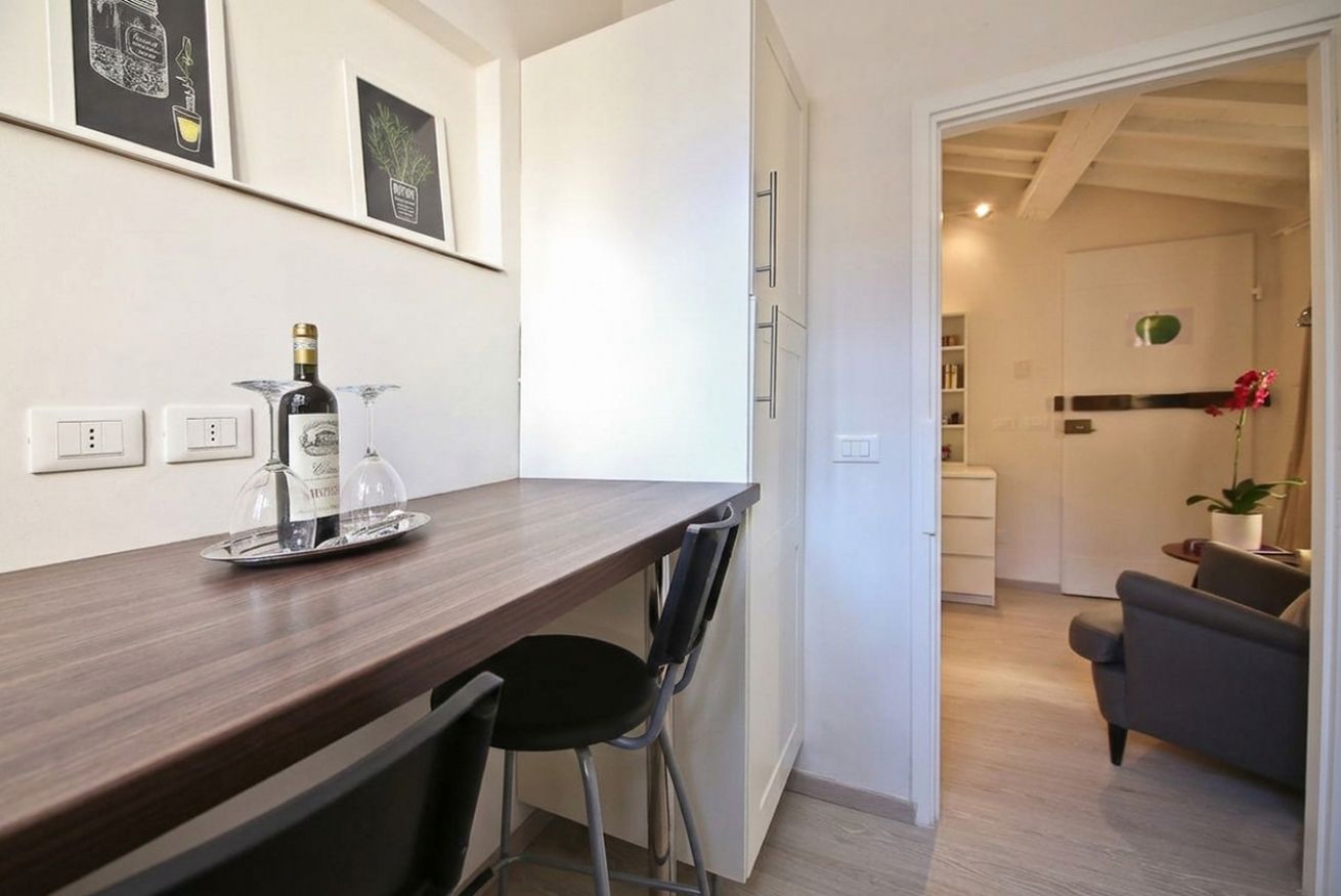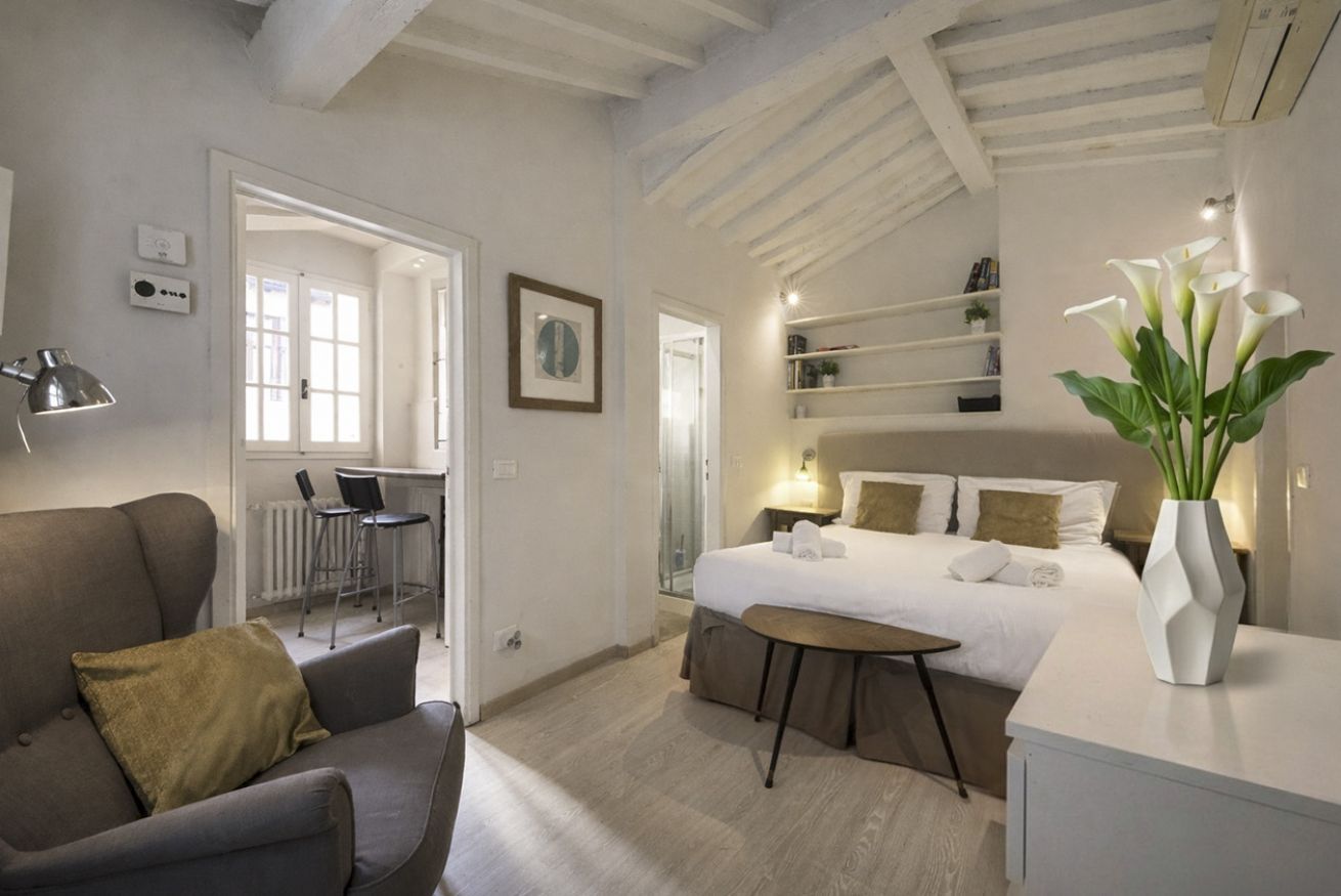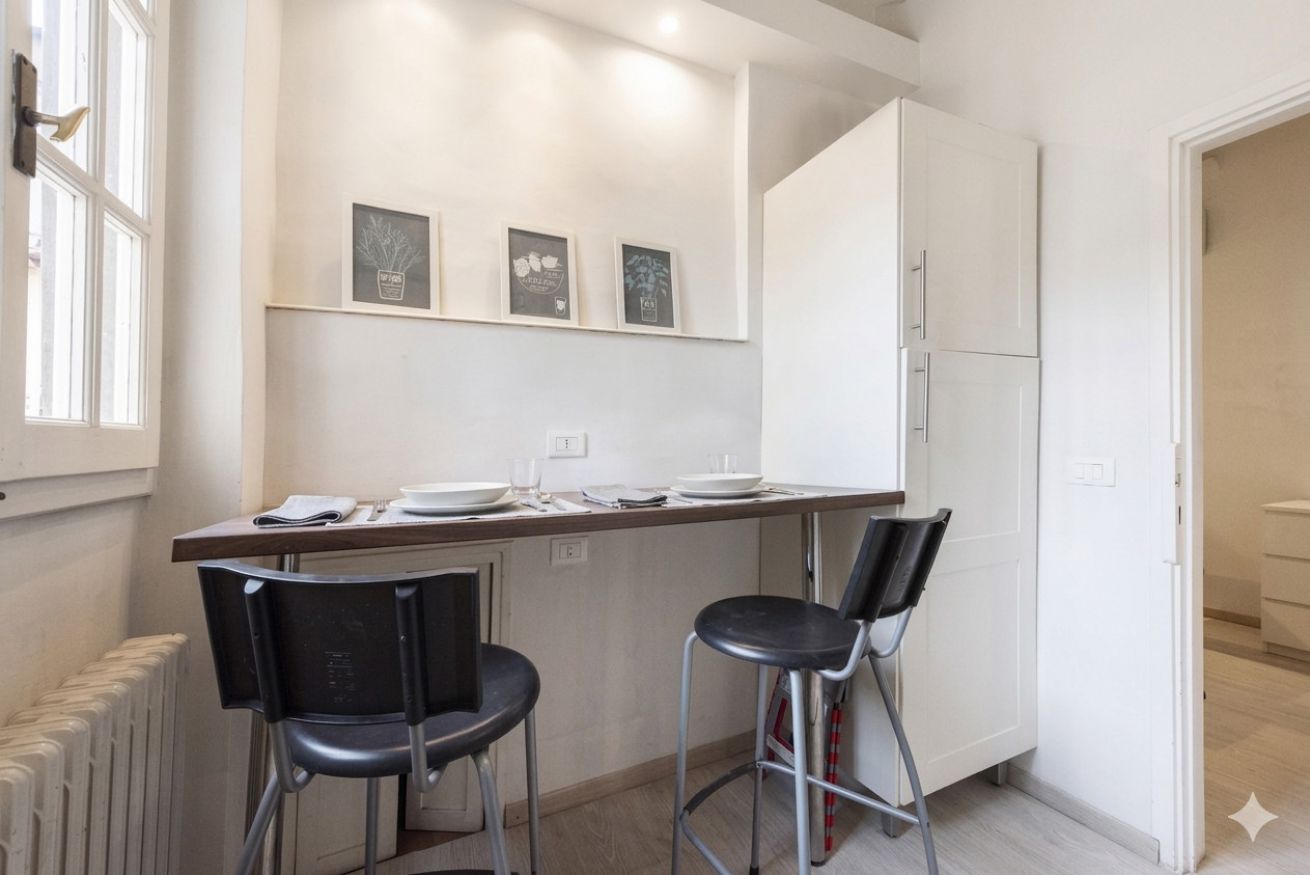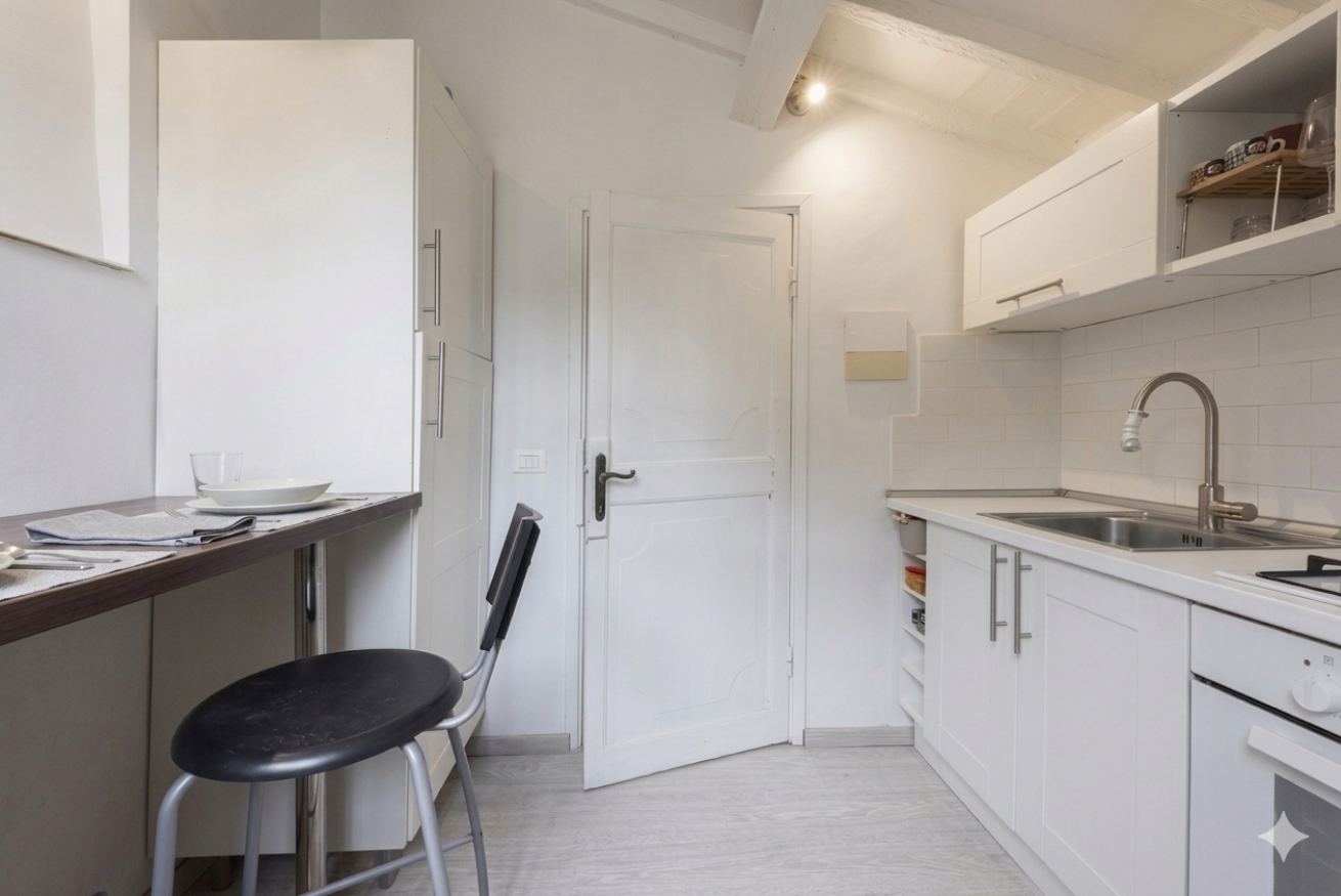 Don't let the small size fool you: everything you may need is at hand, and the space has a wonderfully rustic and welcoming feel thanks to the light wooden floors and the white-washed exposed wooden exposed beams in the ceilings. Many bright windows allow plenty of natural light to shine through the apartment. The kitchen is modern and fully equipped with every cooking facility you may need to cook your favorite Italian pasta while in Florence, plus a comfortable dining counter/table for two. The spacious bedroom features a large queen-size bed, dresser, and a lovely, relaxed corner with a cozy armchair, coffee table, and flat-screen TV. The bathroom, also newly redone, features a nice walk-in shower.