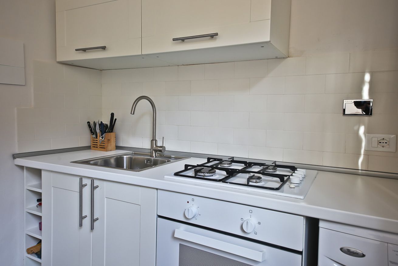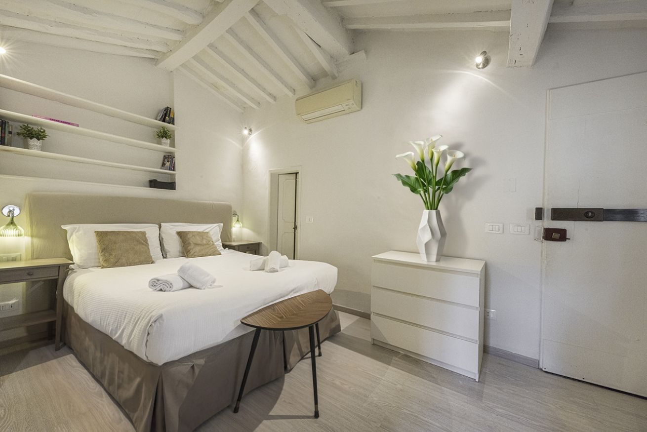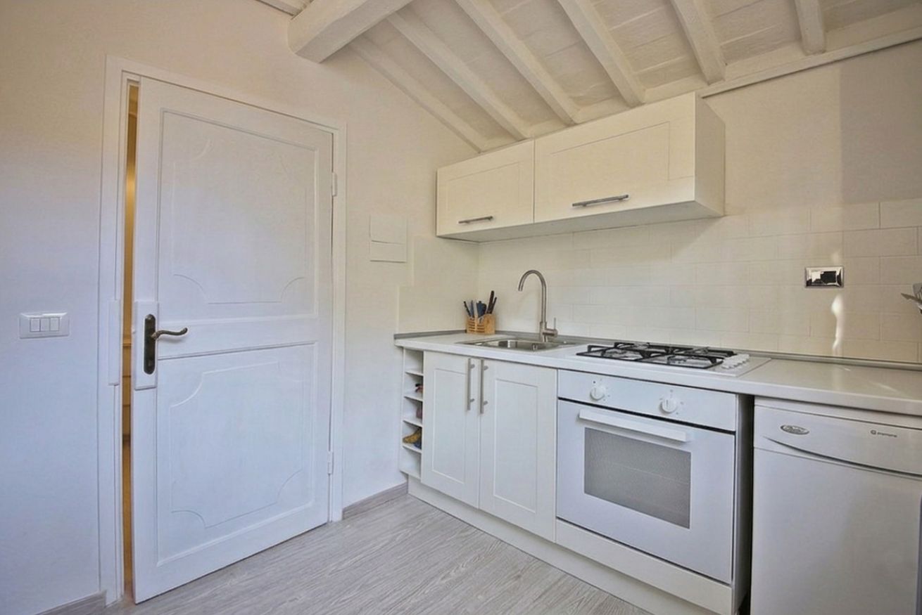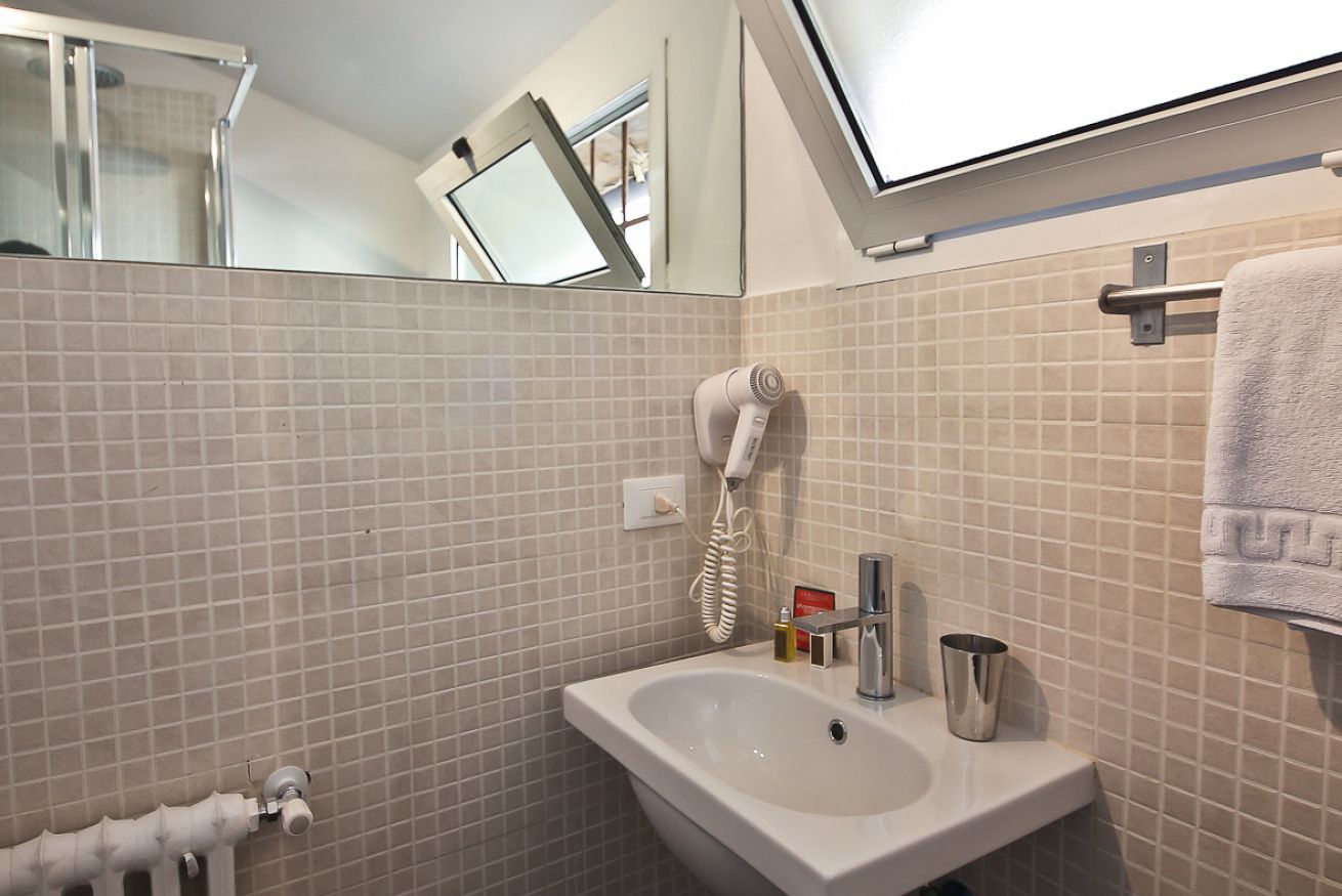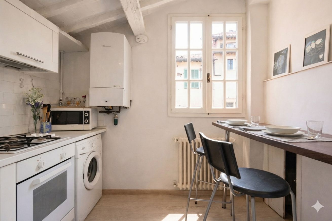 Don't let the small size fool you: everything you may need is at hand, and the space has a wonderfully rustic and welcoming feel thanks to the light wooden floors and the white-washed exposed wooden exposed beams in the ceilings. Many bright windows allow plenty of natural light to shine through the apartment. The kitchen is modern and fully equipped with every cooking facility you may need to cook your favorite Italian pasta while in Florence, plus a comfortable dining counter/table for two. The spacious bedroom features a large queen-size bed, dresser, and a lovely, relaxed corner with a cozy armchair, coffee table, and flat-screen TV. The bathroom, also newly redone, features a nice walk-in shower.