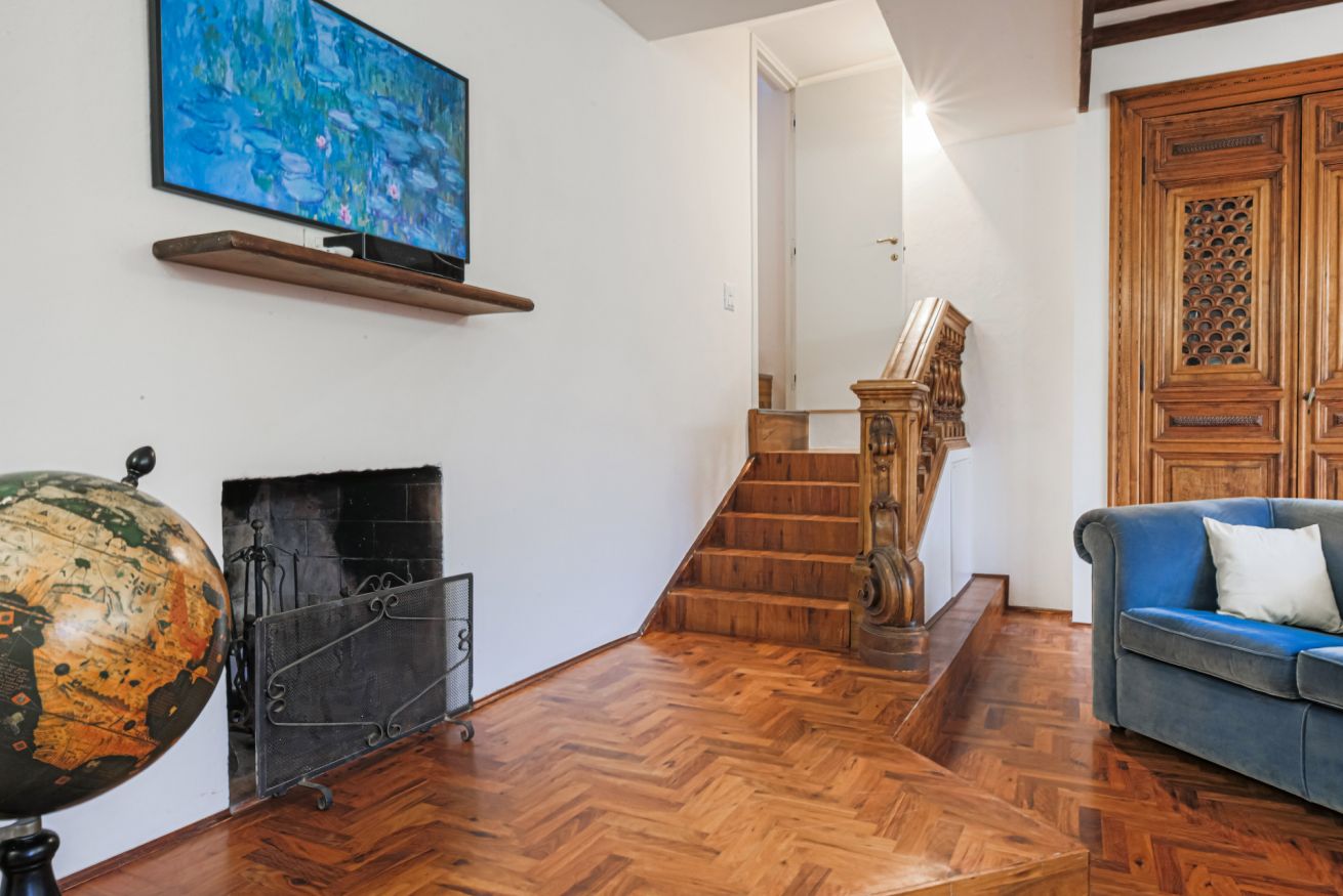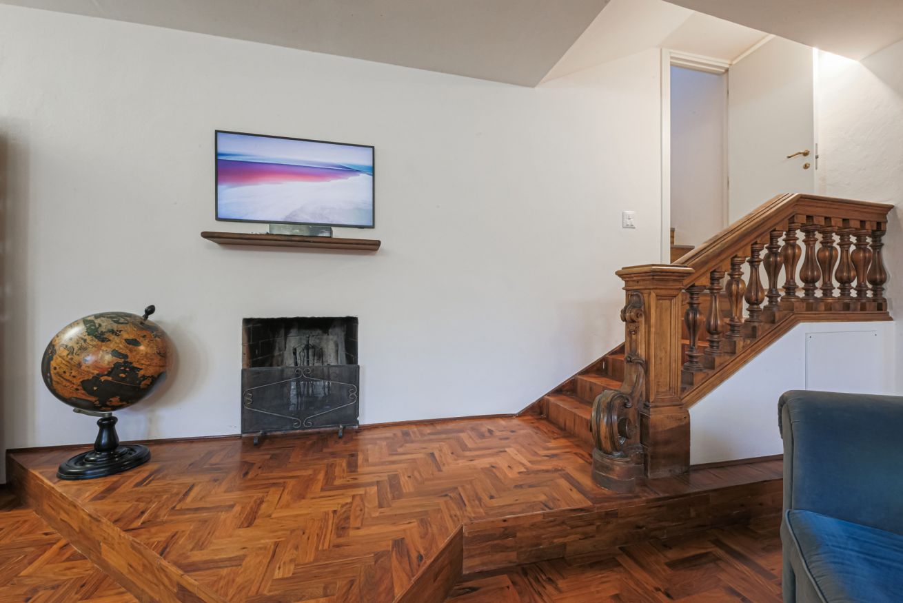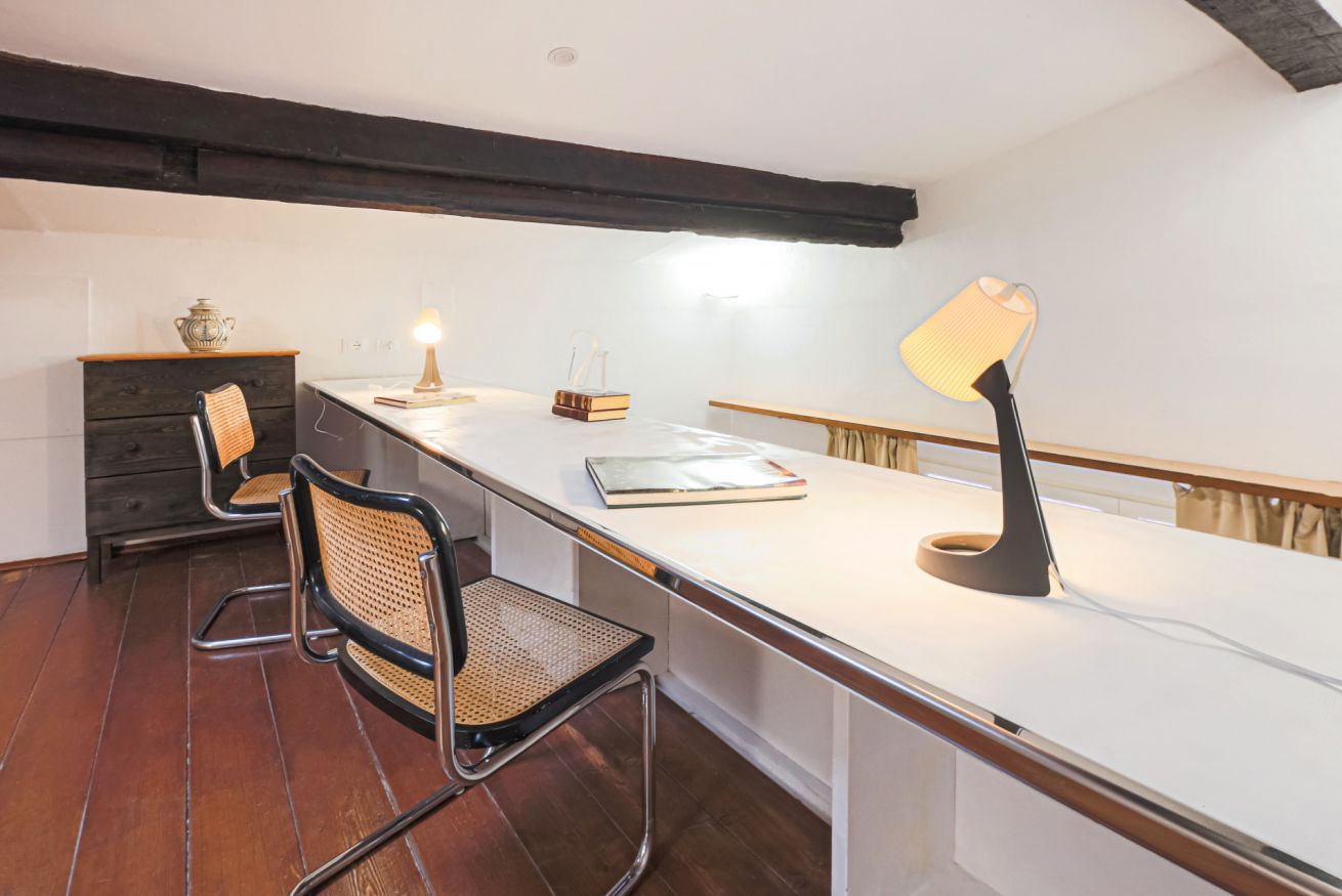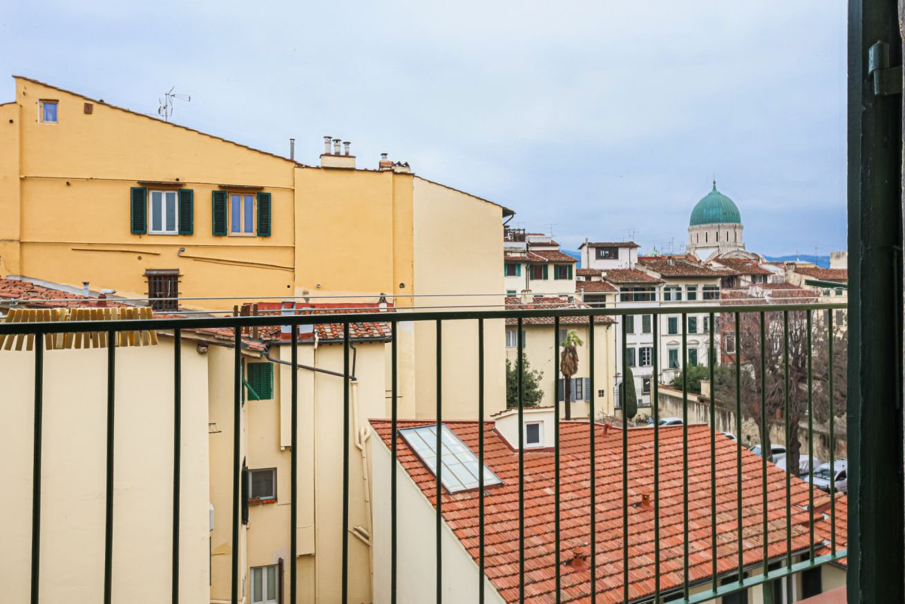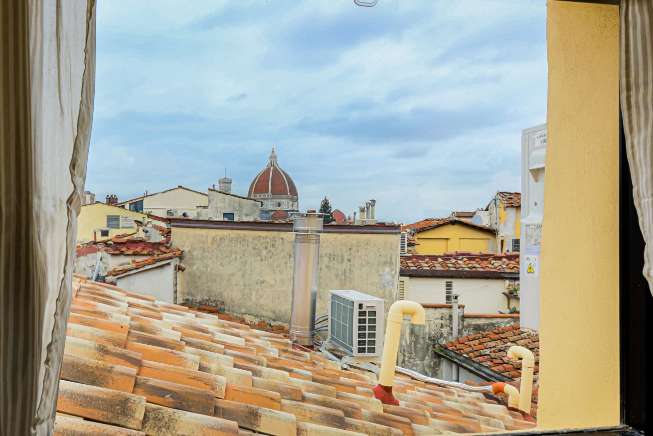 From the entrance to the left, there is the impressive living room, furnished with a double sofa, TV and decorative fireplace. Exposed beams and preciously decorated doors help create a warm and welcoming atmosphere. A convenient staircase leads to a very bright bedroom with 2 single beds (joinable) and a pleasant study corner. From this room, with en-suite bathroom with shower, one can enjoy a breathtaking view of Florence Cathedral.