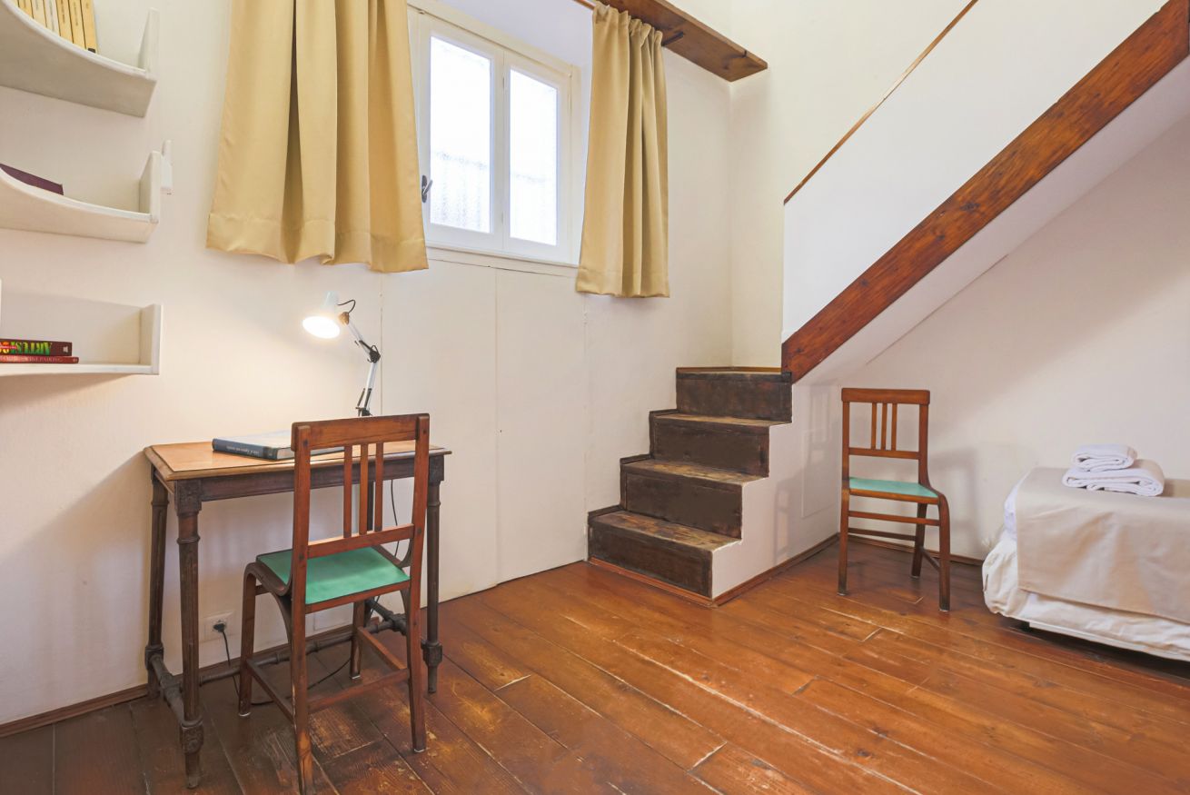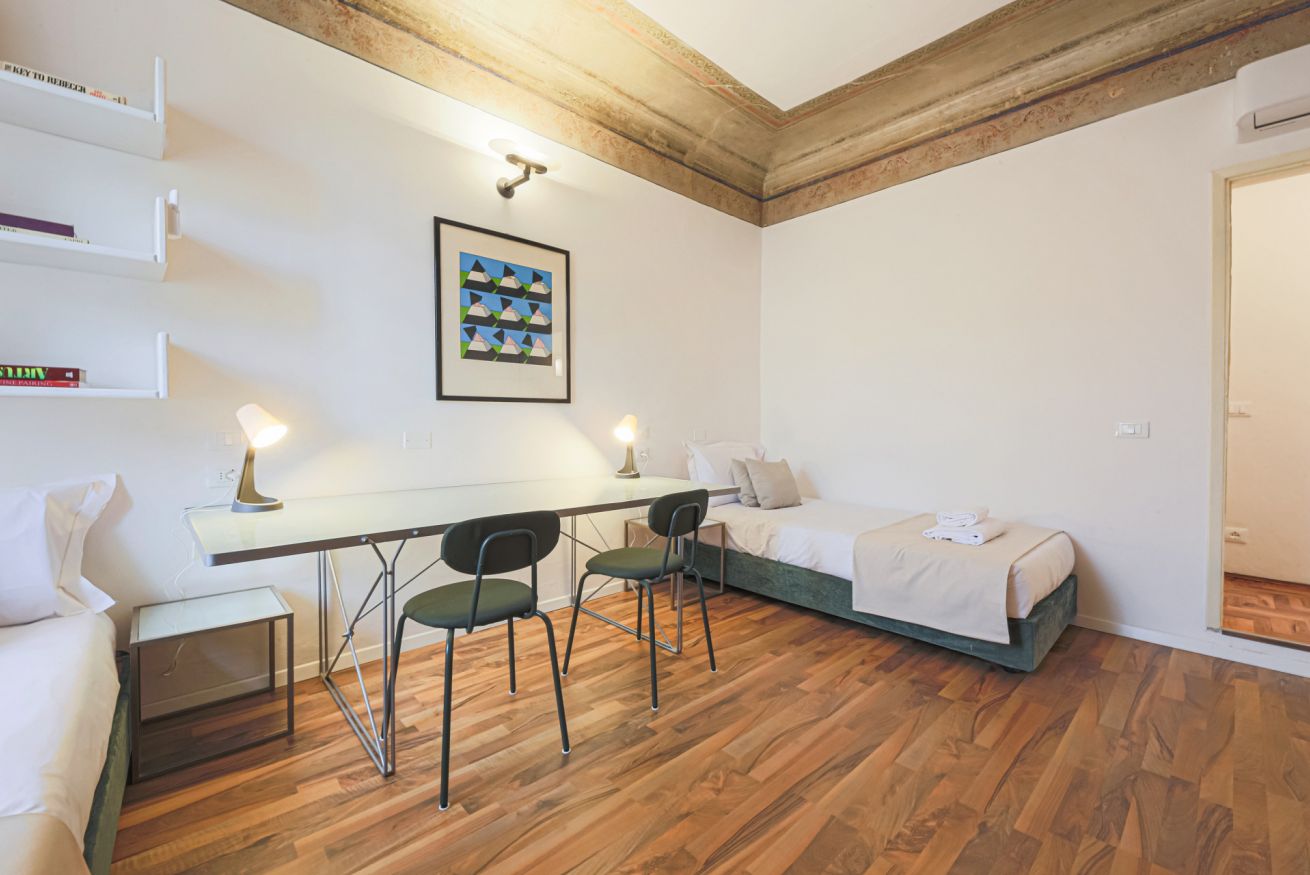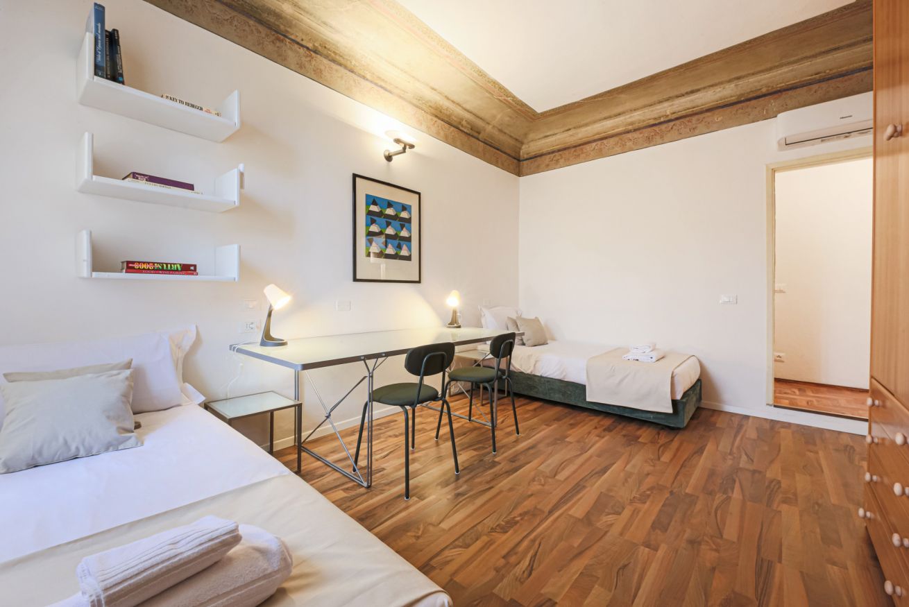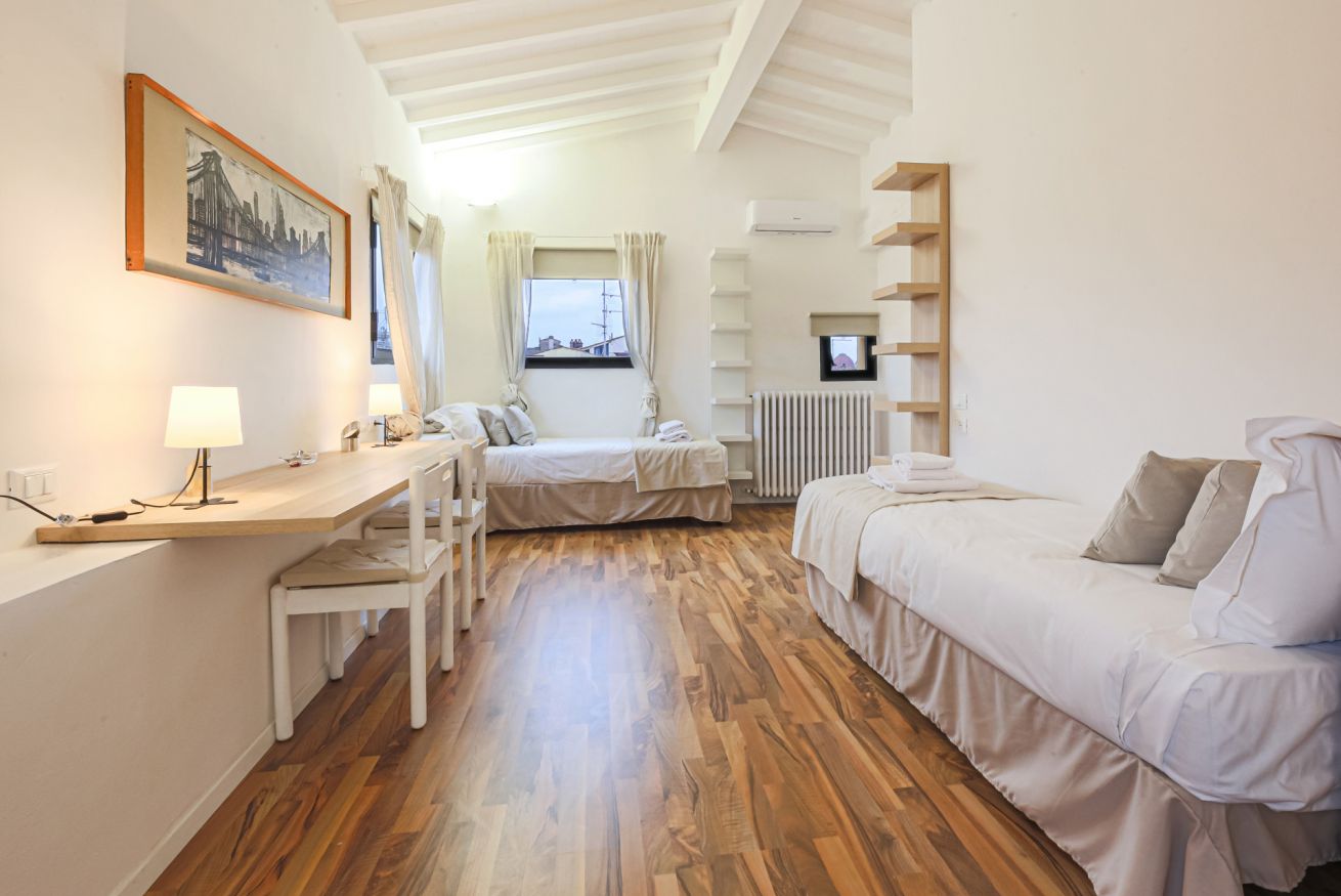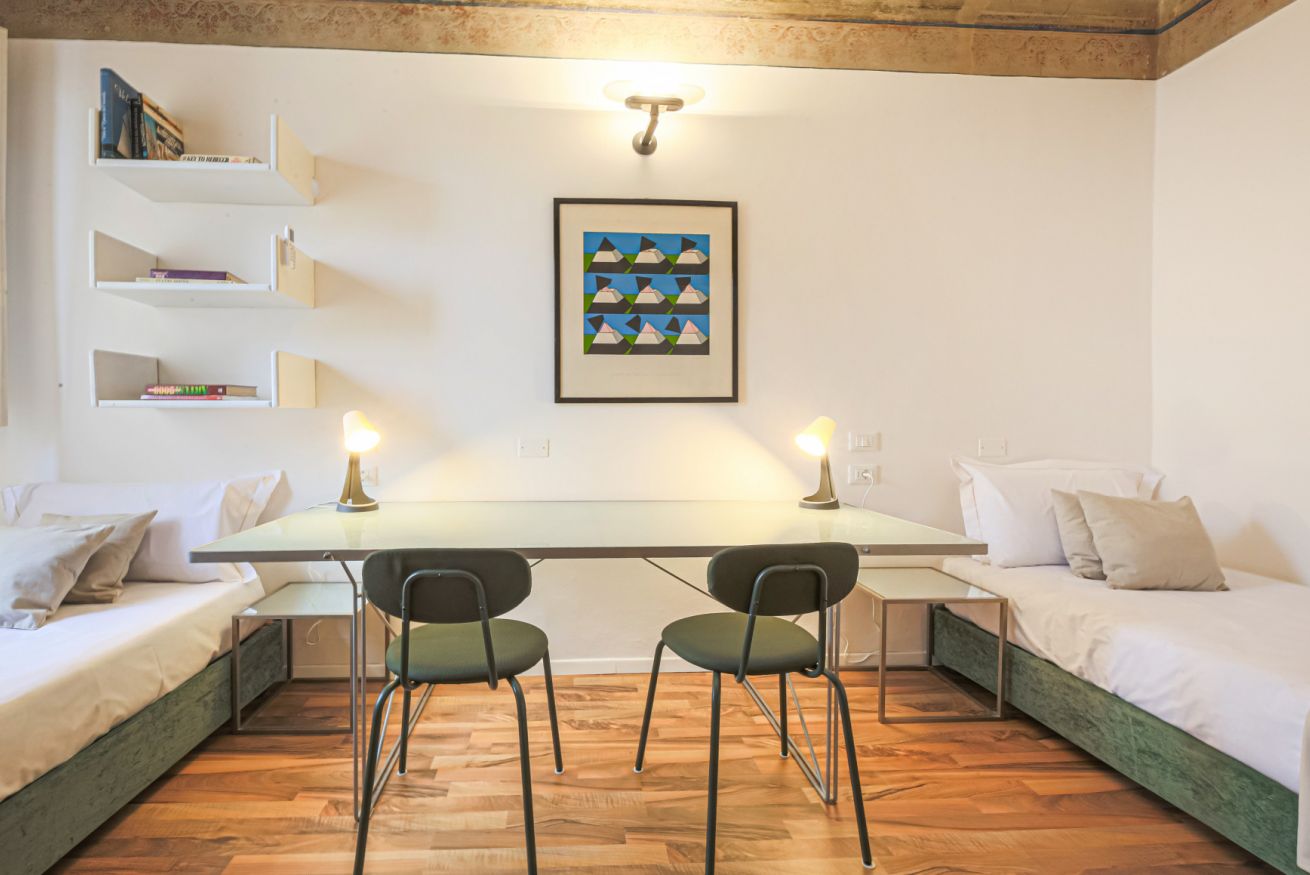 On the right wing of the apartment there are the 3 bedrooms all located along a corridor. The first two bedrooms with single beds share the same bathroom with shower. Each room is furnished differently and has study/work spaces that make Canto dei Ciompi an ideal place to stay. Continuing to the end of the hallway is the last bedroom with a single bed and spacious built-in closets. This single bedroom has a pleasant loft that houses another single bed, a nice large desk and the en-suite bathroom with shower.