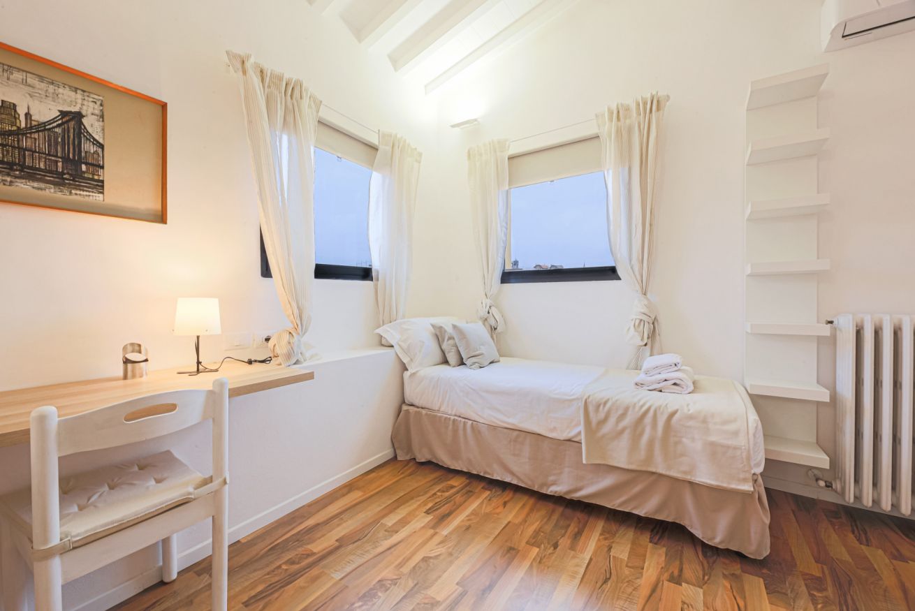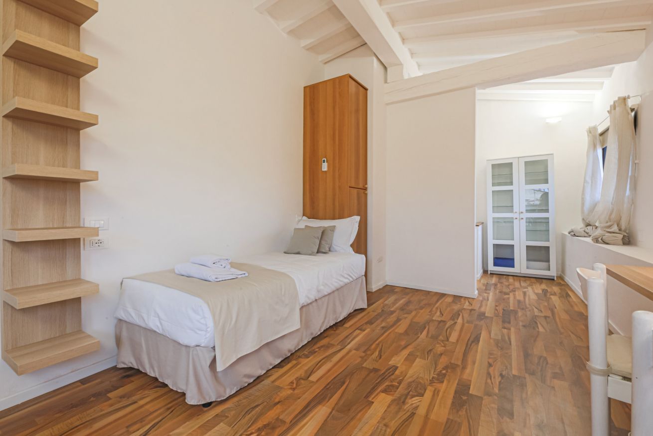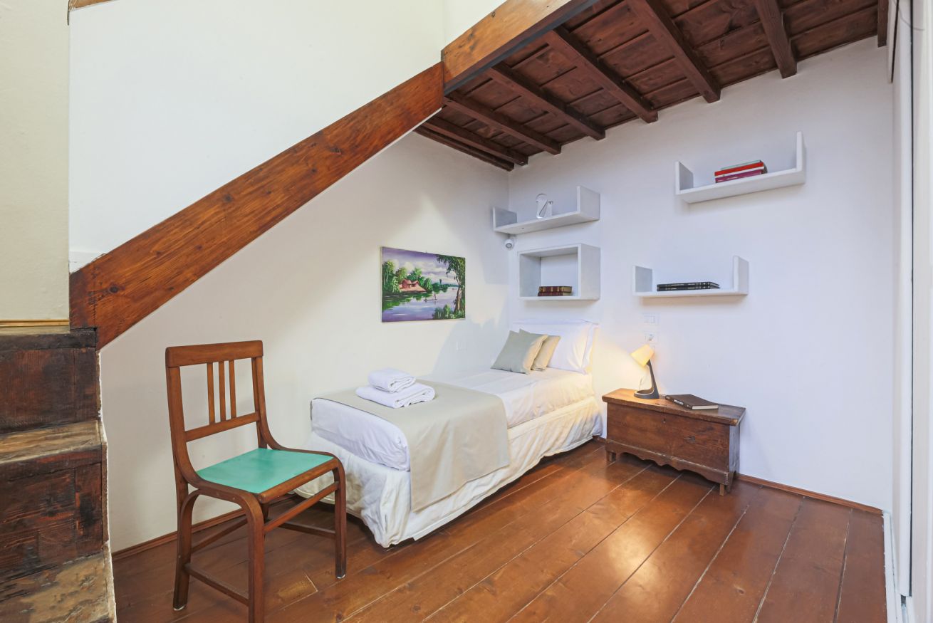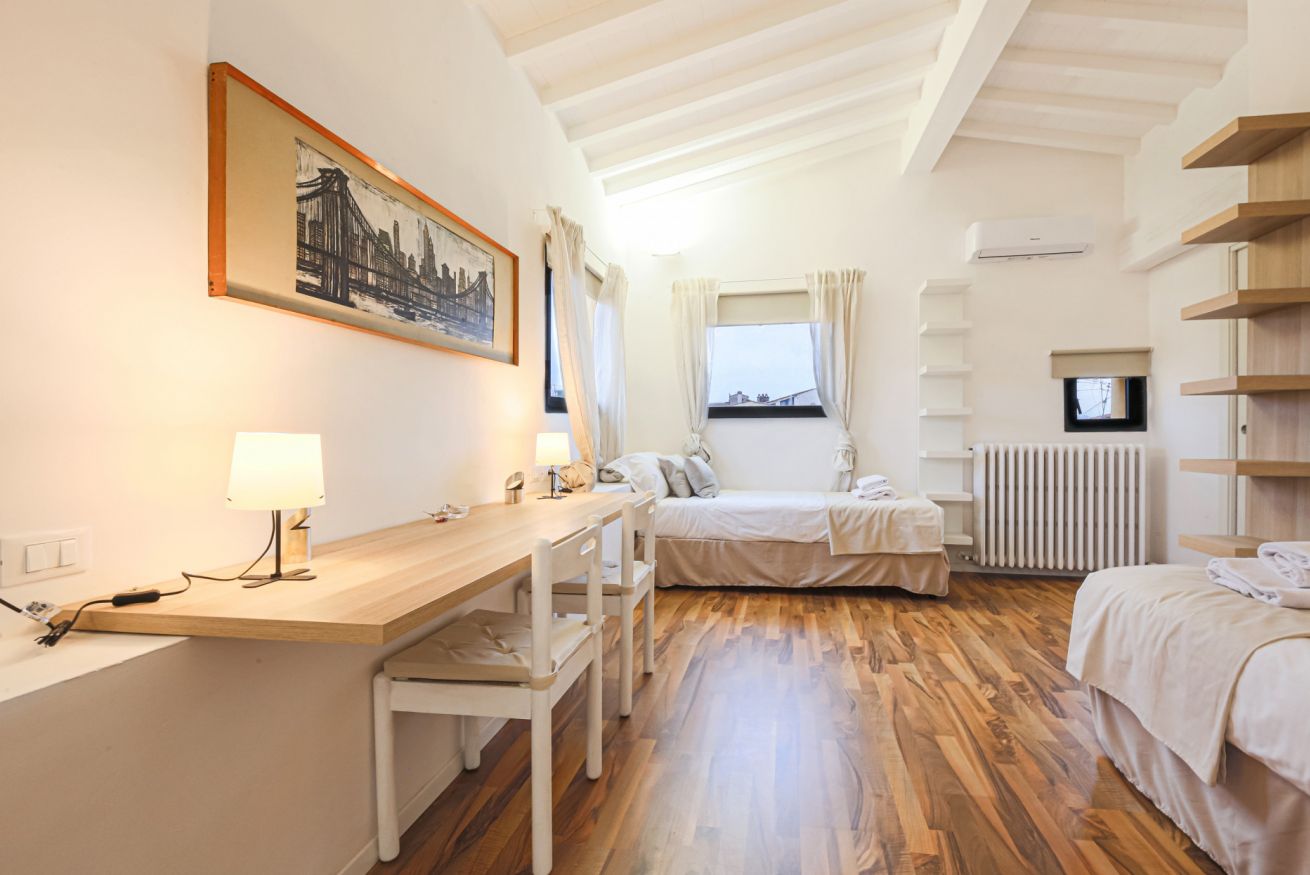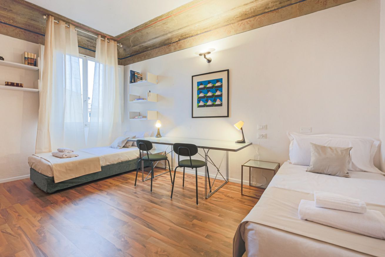 On the right wing of the apartment there are the 3 bedrooms all located along a corridor. The first two bedrooms with single beds share the same bathroom with shower. Each room is furnished differently and has study/work spaces that make Canto dei Ciompi an ideal place to stay. Continuing to the end of the hallway is the last bedroom with a single bed and spacious built-in closets. This single bedroom has a pleasant loft that houses another single bed, a nice large desk and the en-suite bathroom with shower.