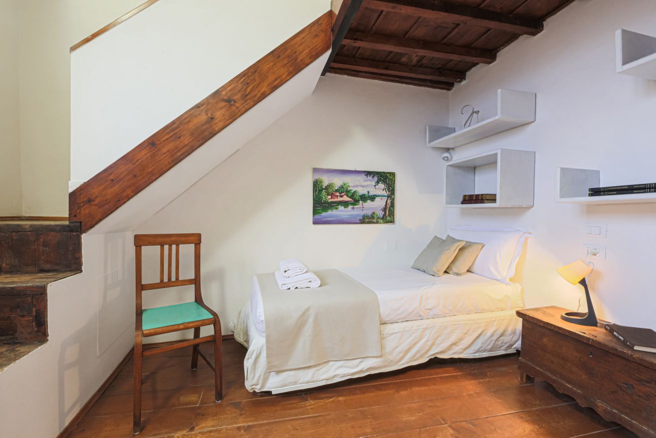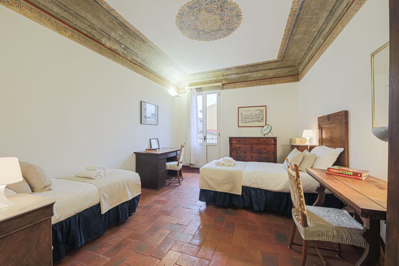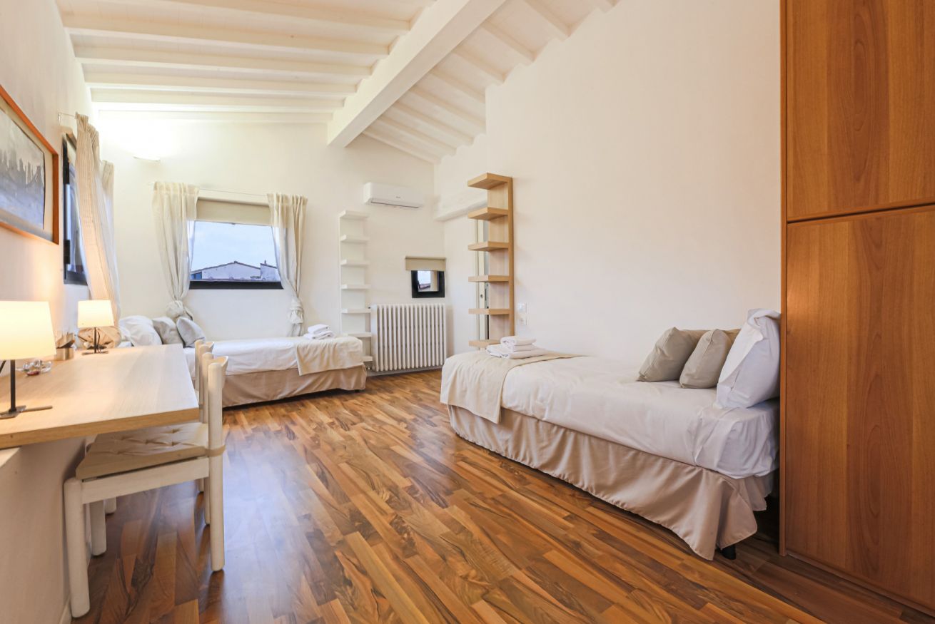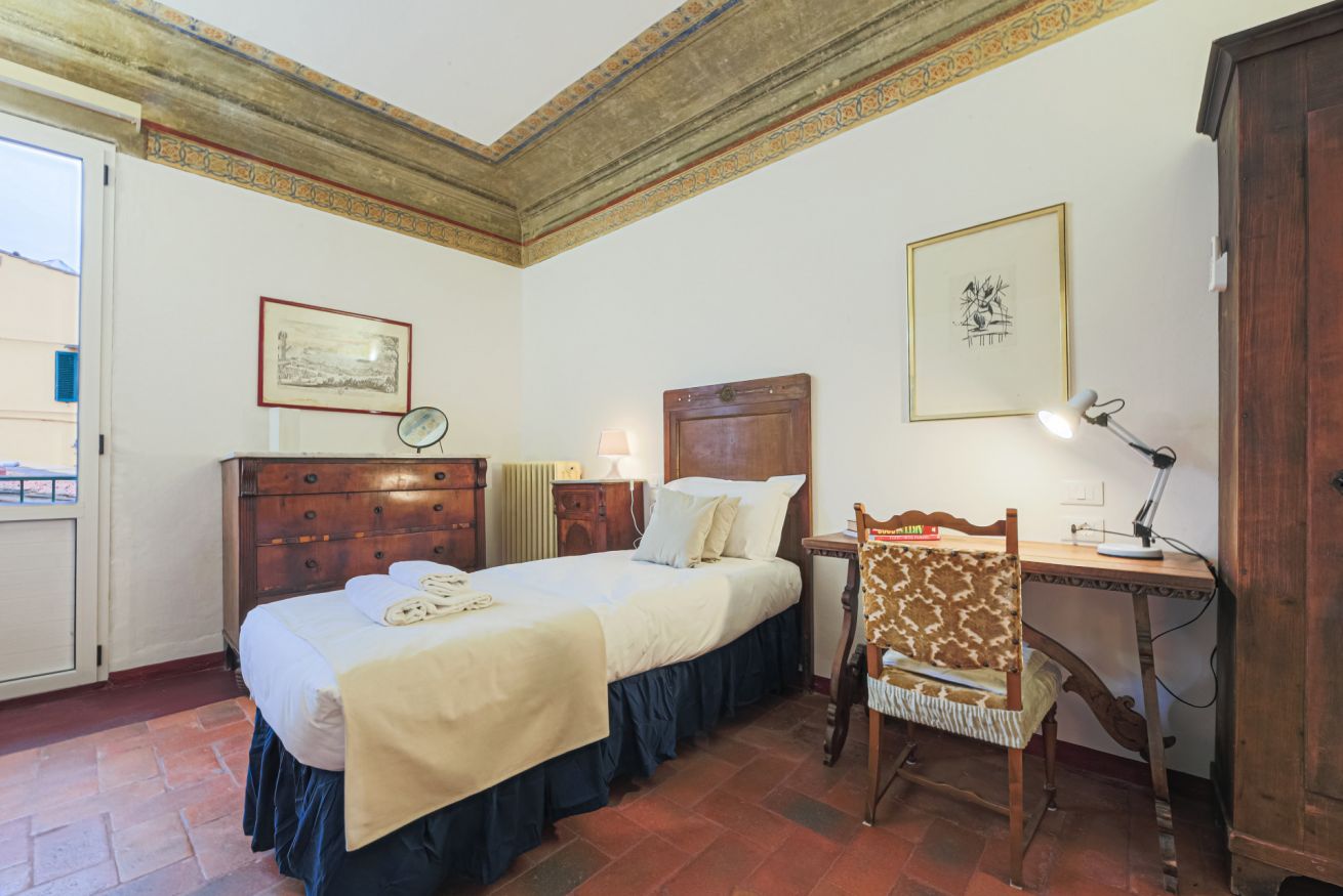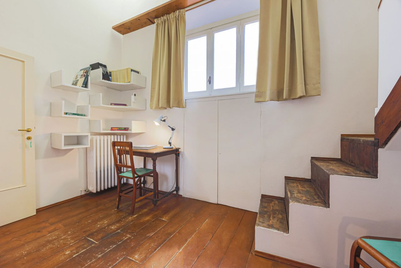 On the right wing of the apartment there are the 3 bedrooms all located along a corridor. The first two bedrooms with single beds share the same bathroom with shower. Each room is furnished differently and has study/work spaces that make Canto dei Ciompi an ideal place to stay. Continuing to the end of the hallway is the last bedroom with a single bed and spacious built-in closets. This single bedroom has a pleasant loft that houses another single bed, a nice large desk and the en-suite bathroom with shower.