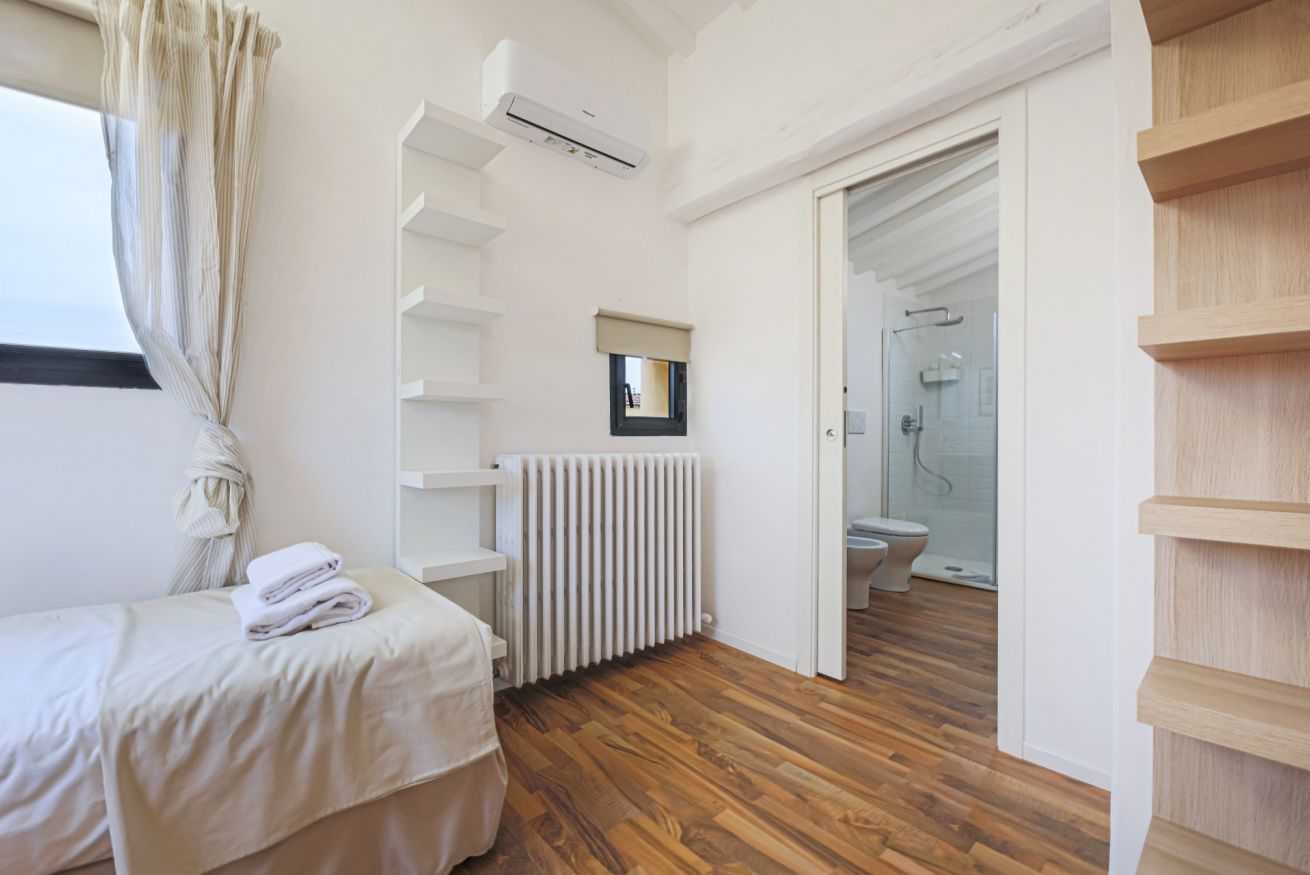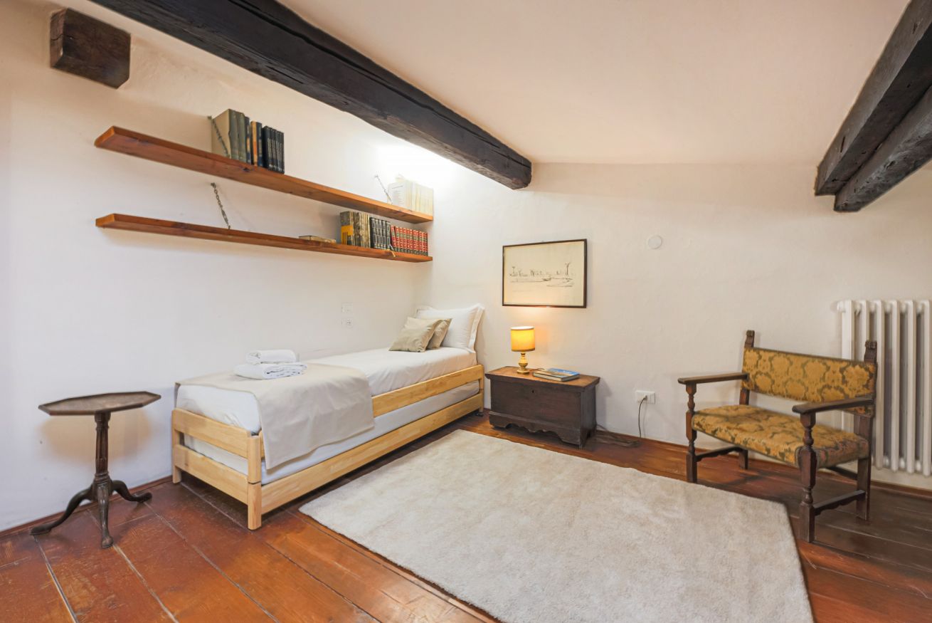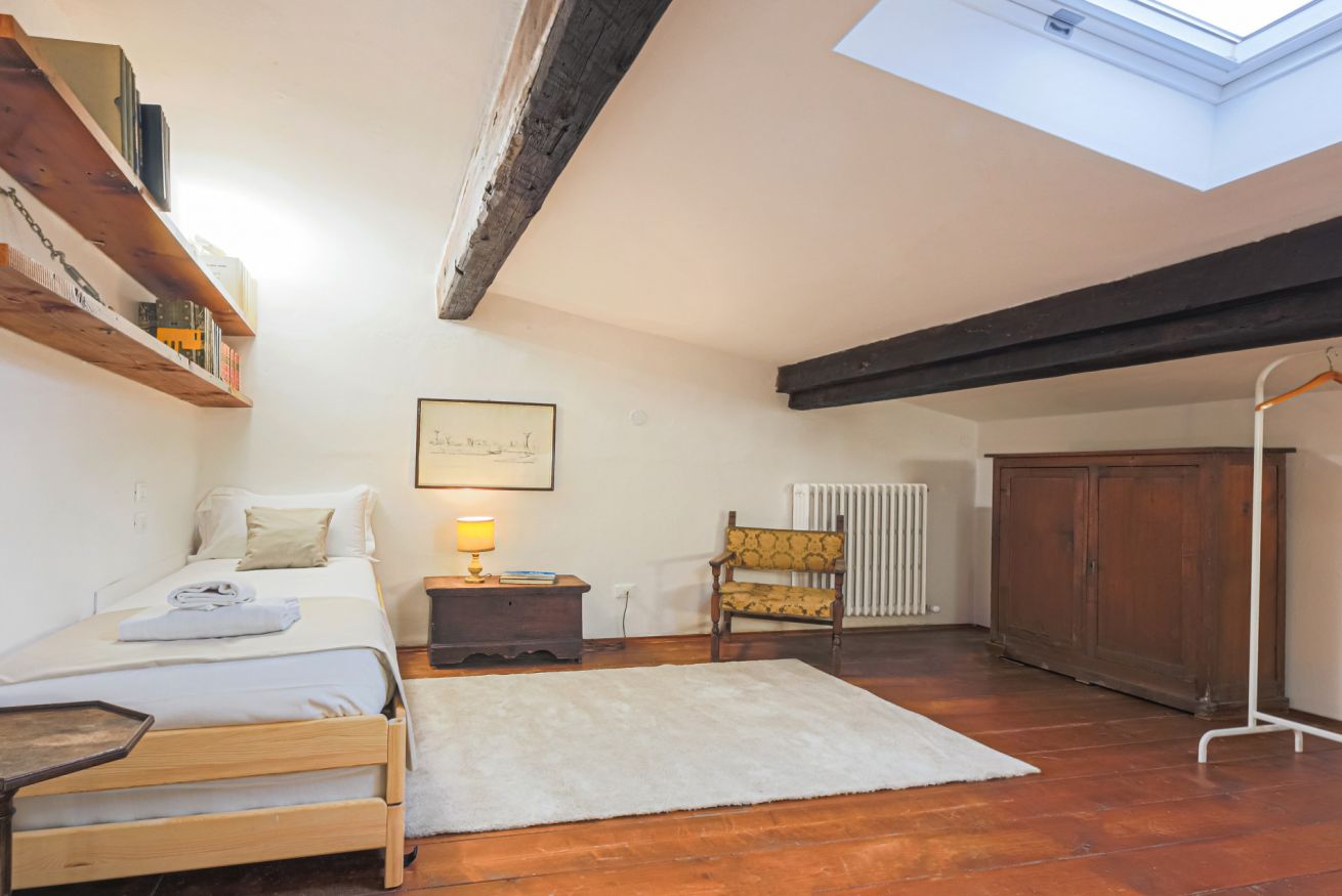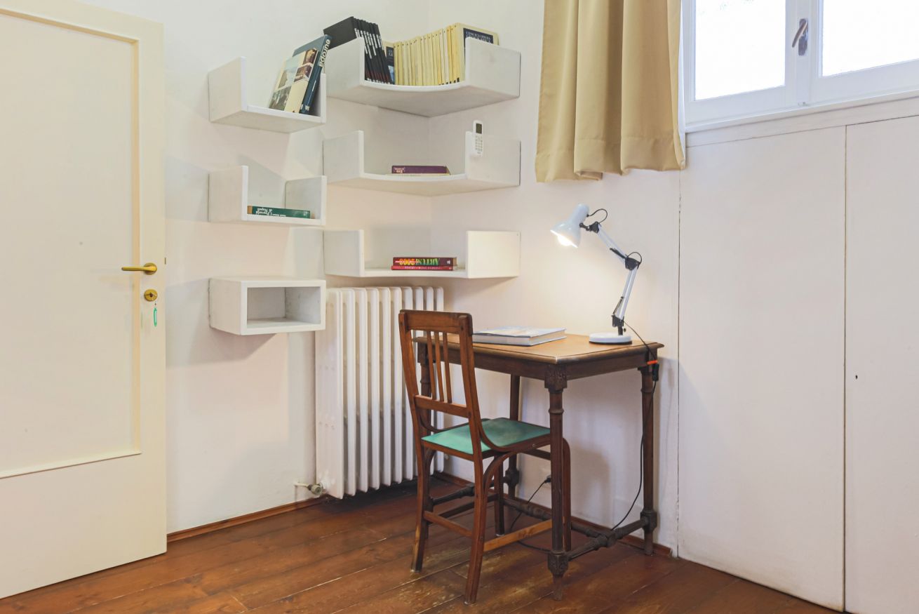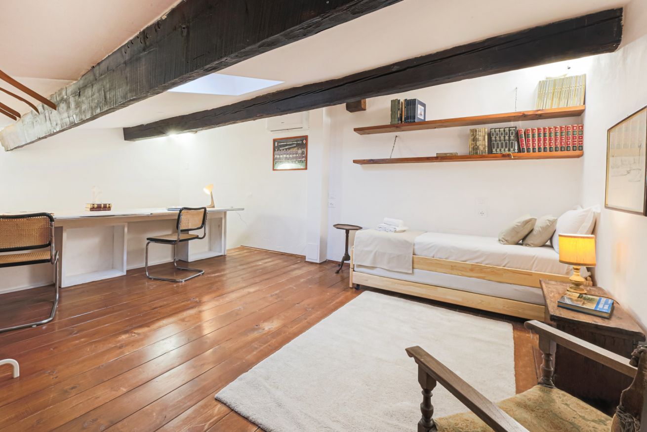 On the right wing of the apartment there are the 3 bedrooms all located along a corridor. The first two bedrooms with single beds share the same bathroom with shower. Each room is furnished differently and has study/work spaces that make Canto dei Ciompi an ideal place to stay. Continuing to the end of the hallway is the last bedroom with a single bed and spacious built-in closets. This single bedroom has a pleasant loft that houses another single bed, a nice large desk and the en-suite bathroom with shower.