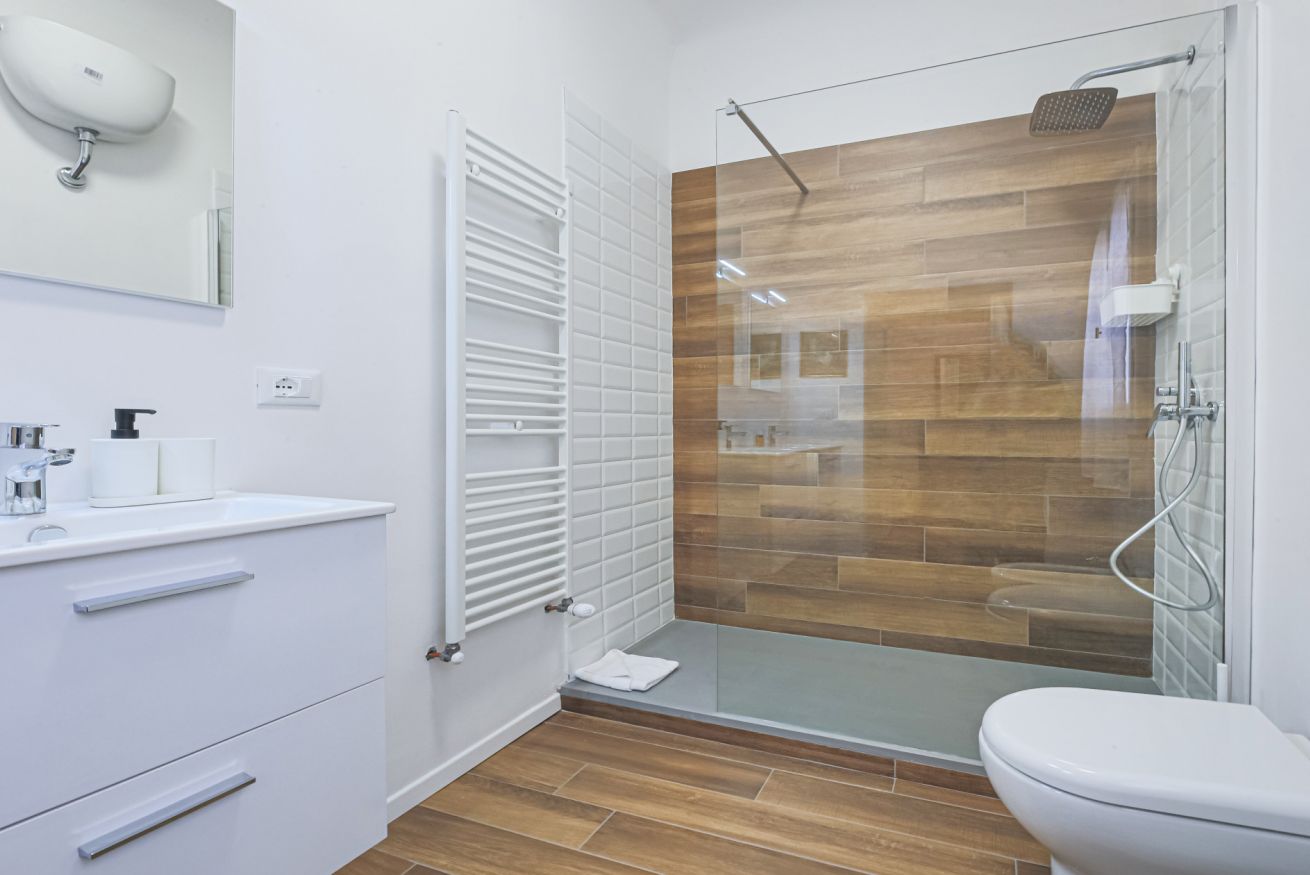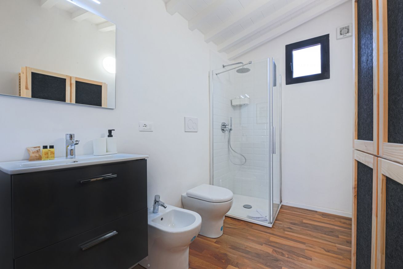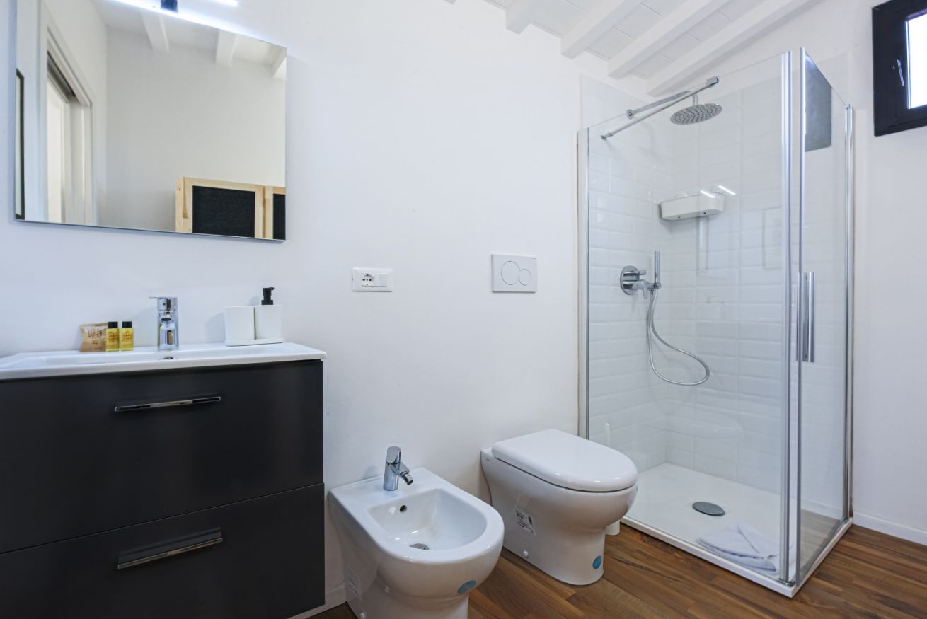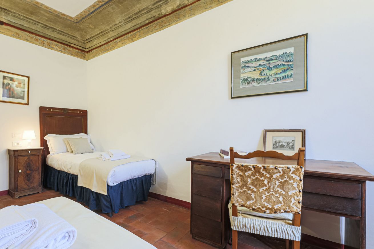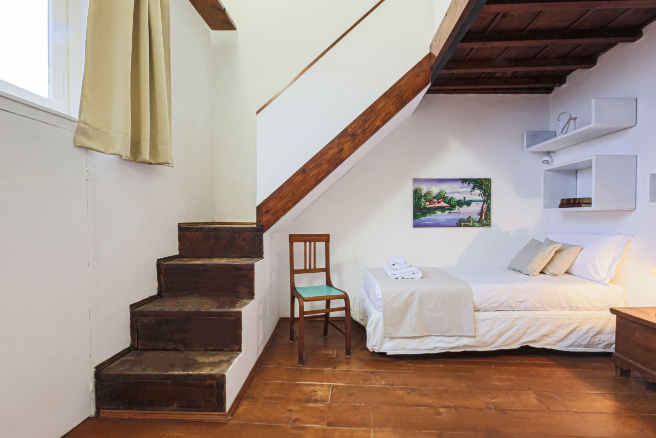 On the right wing of the apartment there are the 3 bedrooms all located along a corridor. The first two bedrooms with single beds share the same bathroom with shower. Each room is furnished differently and has study/work spaces that make Canto dei Ciompi an ideal place to stay. Continuing to the end of the hallway is the last bedroom with a single bed and spacious built-in closets. This single bedroom has a pleasant loft that houses another single bed, a nice large desk and the en-suite bathroom with shower.