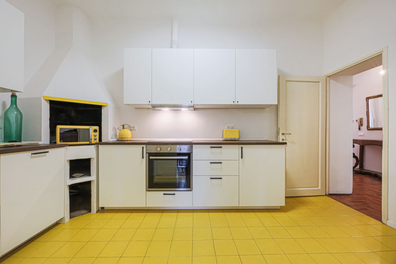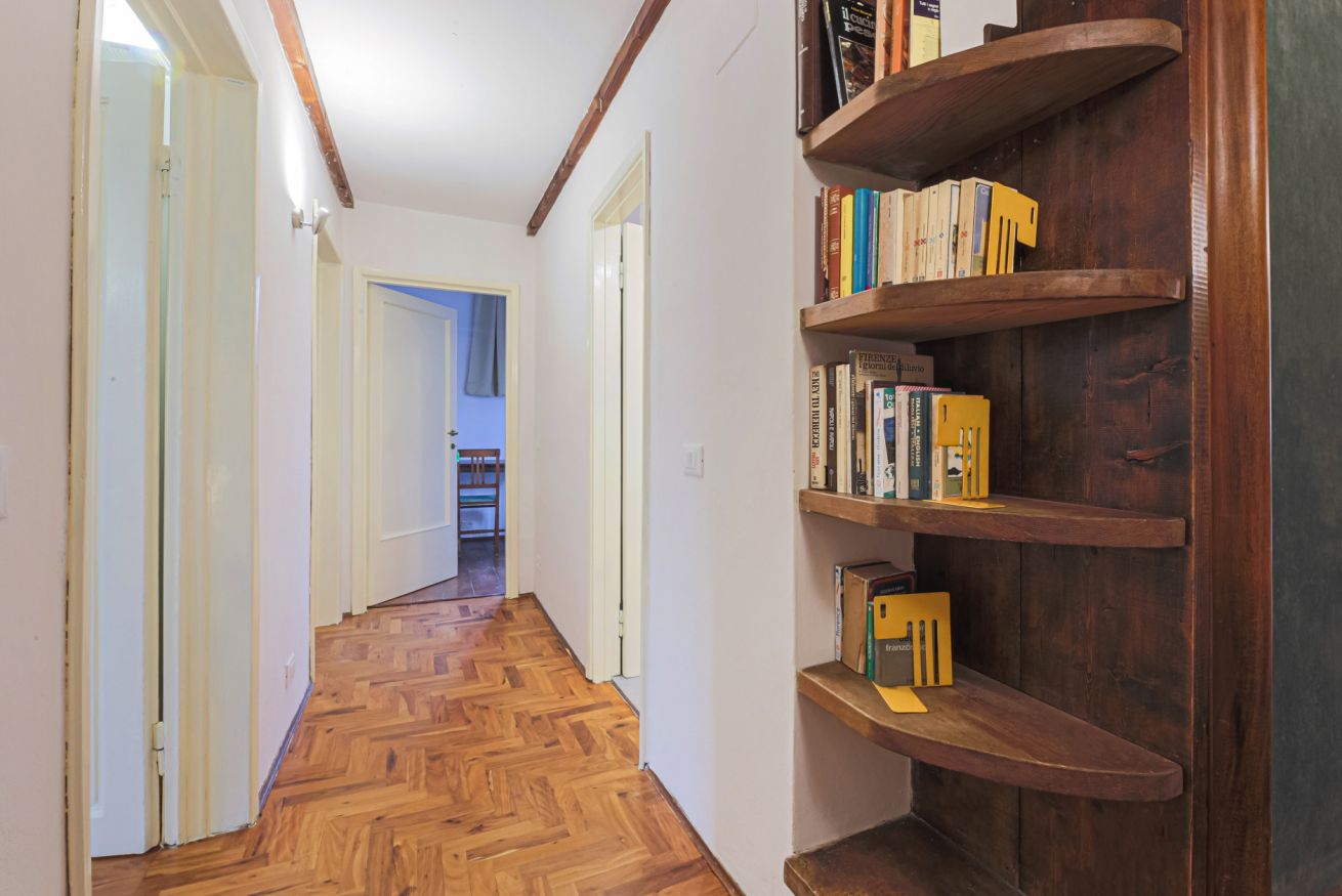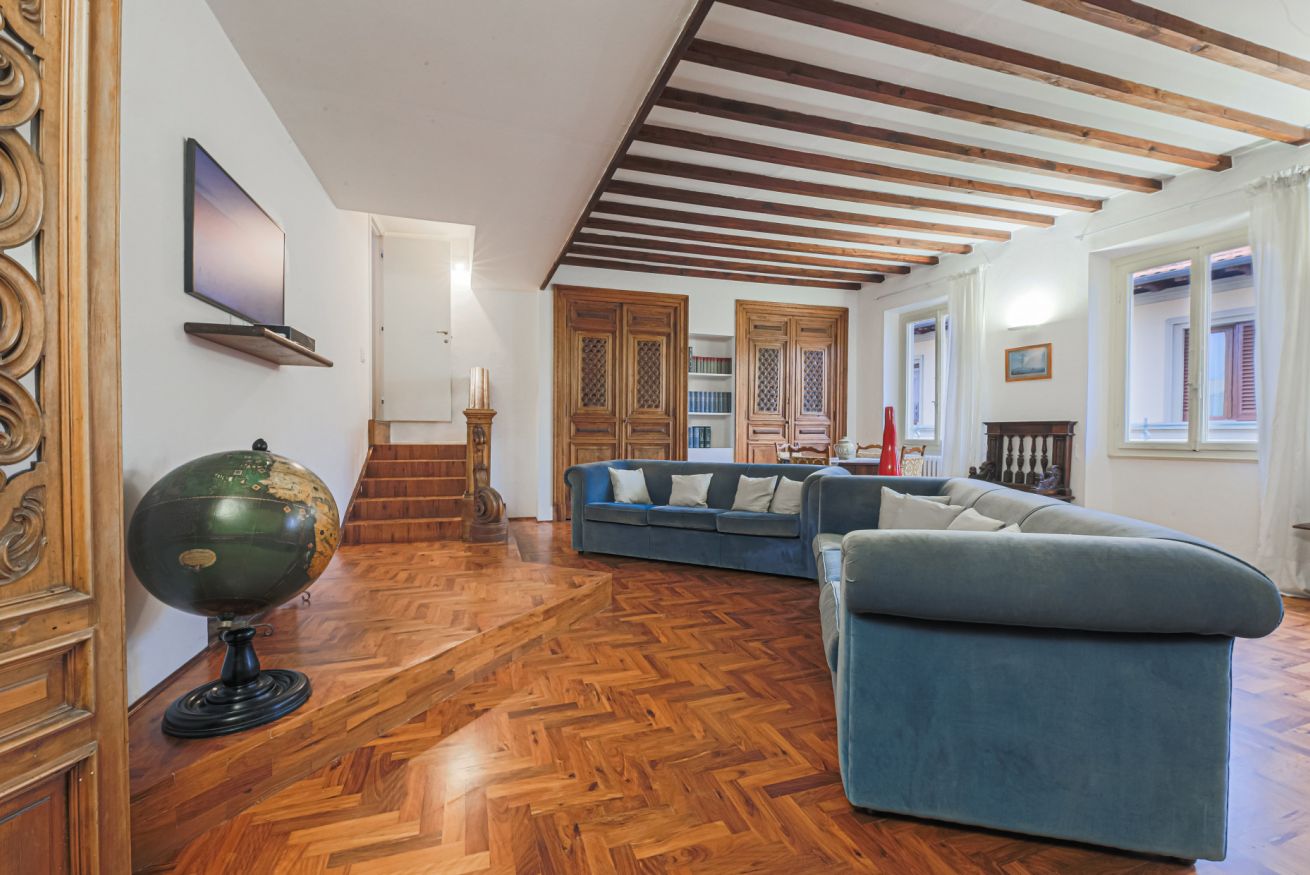 Canti dei Ciompi is a sizeable apartment that is spread over several levels in a horseshoe shape. Upon entering you are greeted by a practical hallway that acts as a watershed between the living and sleeping areas.