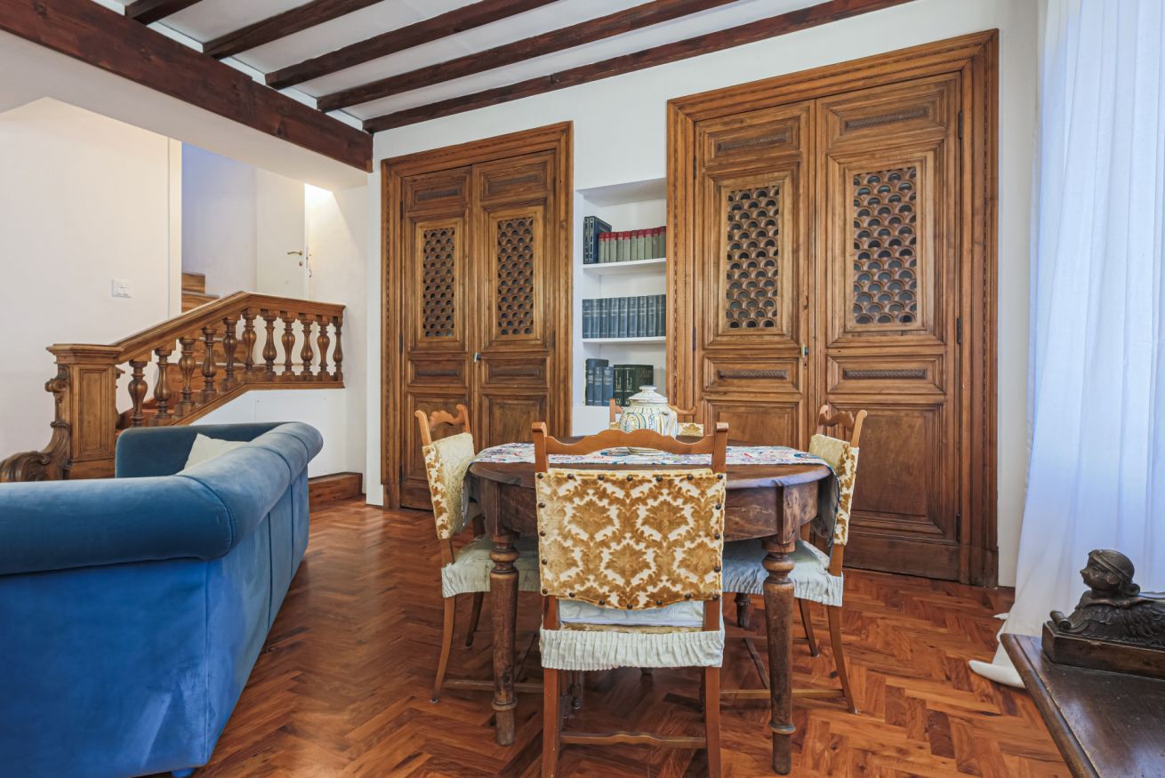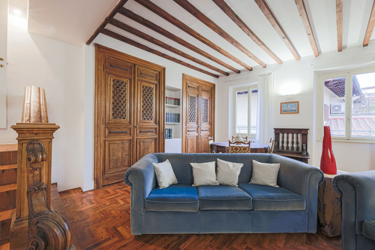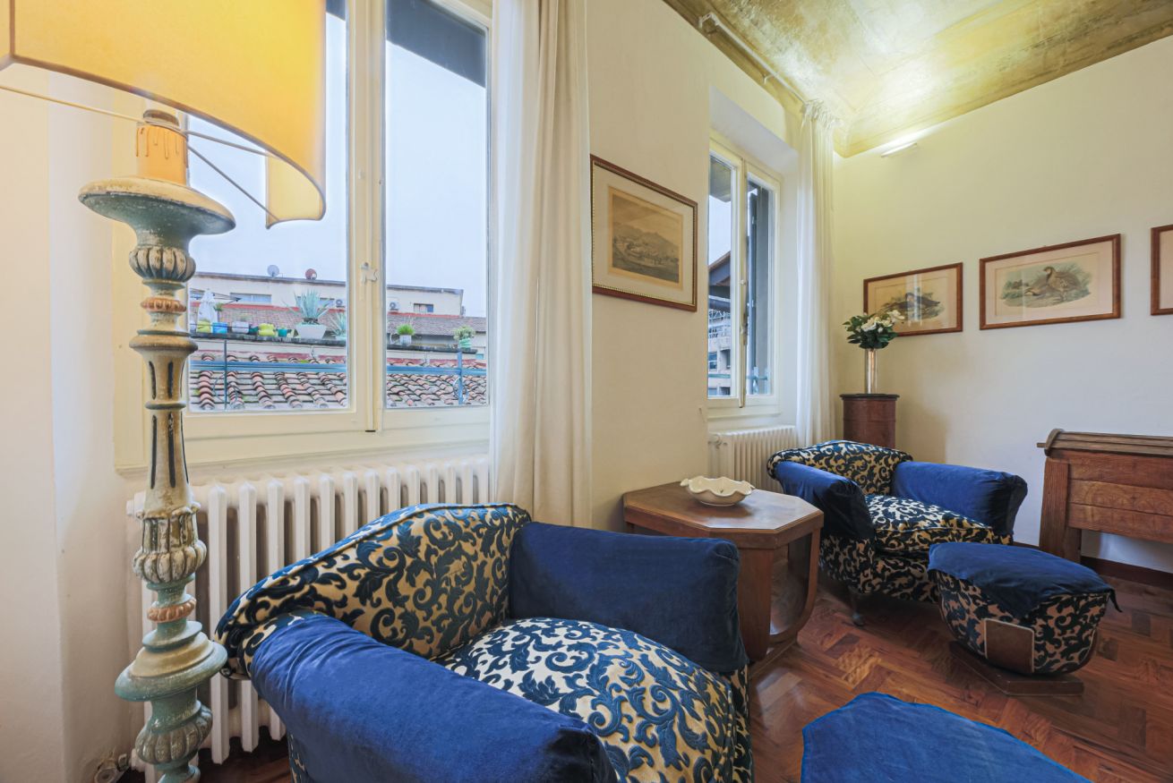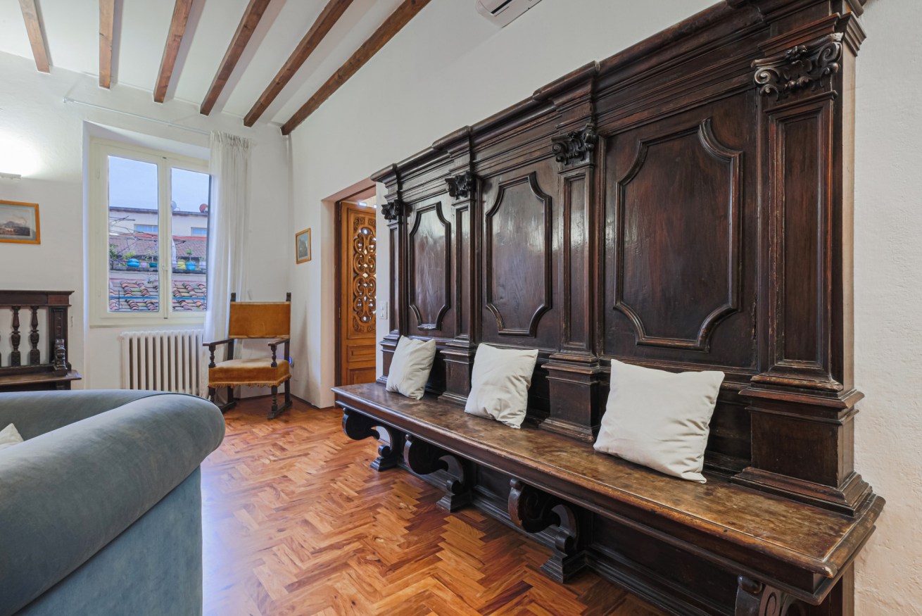 The apartment is located on the third floor of the building with elevator and was recently renovated. Furnished in the traditional Tuscan style with original elements of Florentine craftsmanship, Canto dei Ciompi is enriched with contemporary solutions due to the renovation. Flooded with natural light, this apartment stands out for its large spaces and enjoys special views. Parquet floors, exposed beams and ornate ceilings give the space an old-world charm.