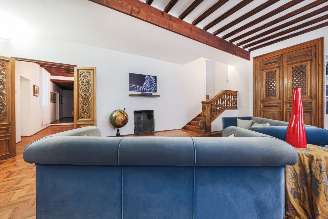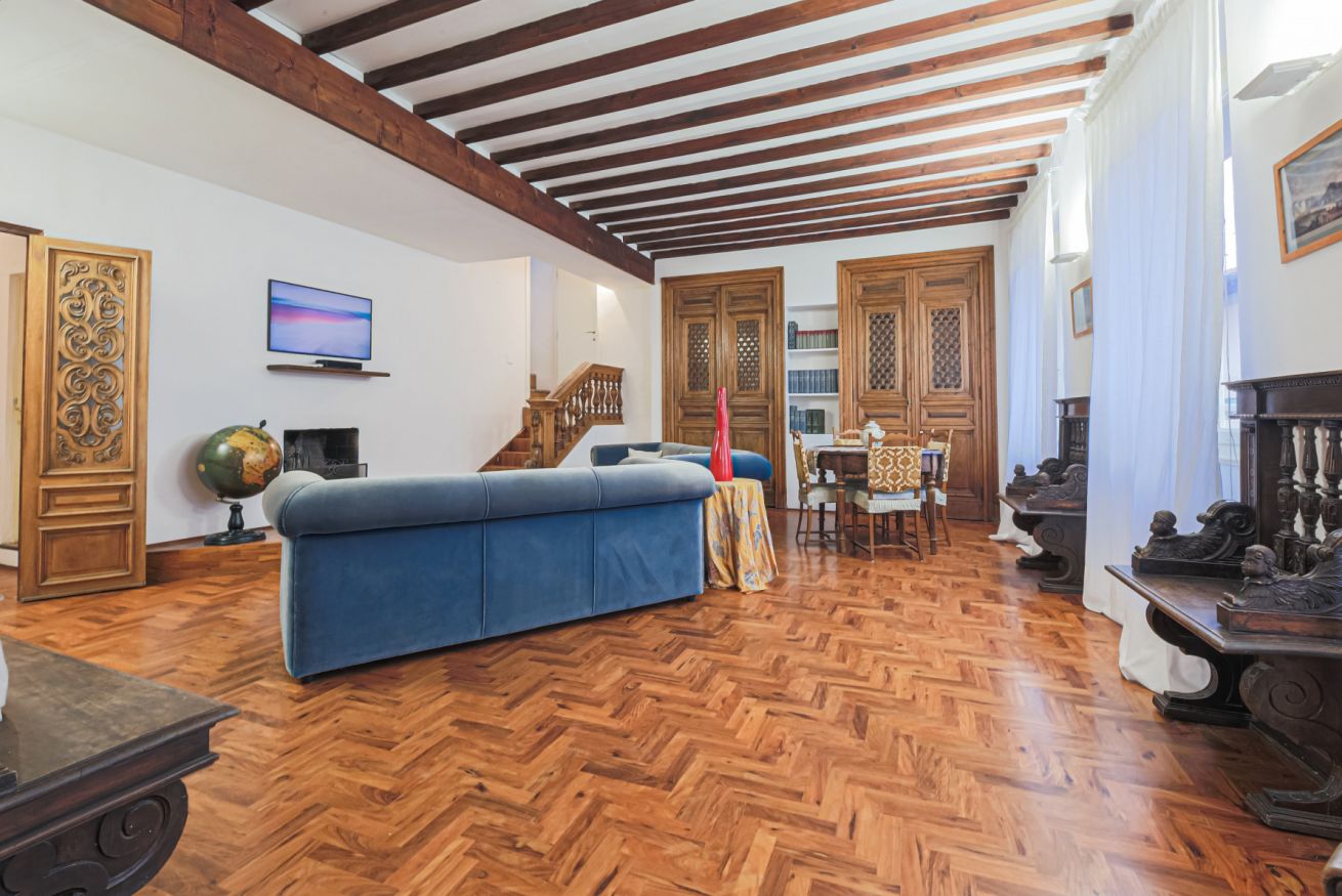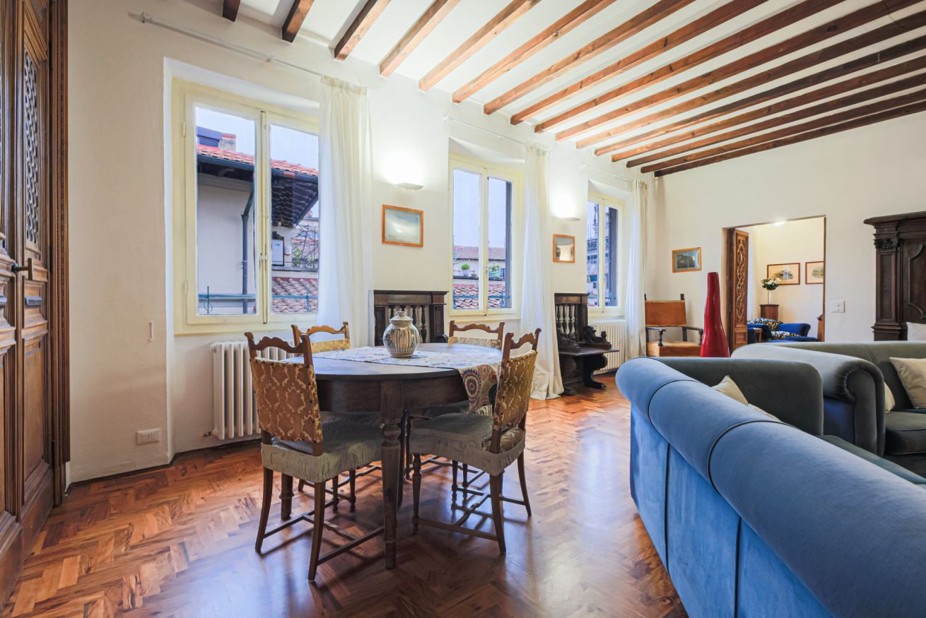 The apartment is located on the third floor of the building with elevator and was recently renovated. Furnished in the traditional Tuscan style with original elements of Florentine craftsmanship, Canto dei Ciompi is enriched with contemporary solutions due to the renovation. Flooded with natural light, this apartment stands out for its large spaces and enjoys special views. Parquet floors, exposed beams and ornate ceilings give the space an old-world charm.