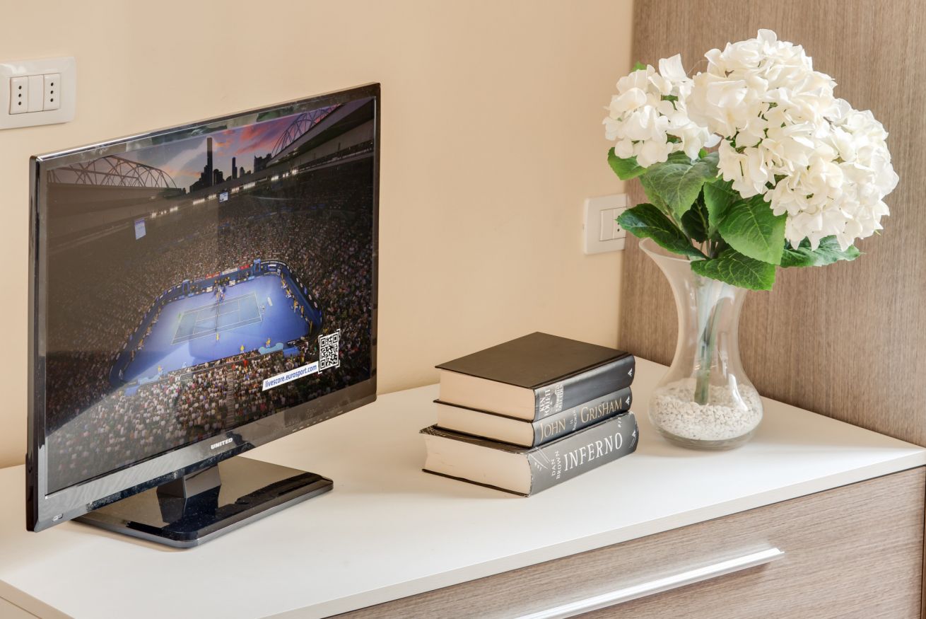 The apartment has been recently renovated and has a fully equipped kitchen & bathroom. Master bedroom with double bed and living room with double sofa bed. There is an open floor plan so you can enjoy cooking, dining, and relaxing all in the same space. The apartment is located on the 2nd floor (EU) of a residential building. This apartment is suitable for single travelers, couples, and families. For larger parties, this apartment can be combined with our Ginevra one-bedroom apartment located next door. There is an adjoining door that opens up to create a two-bedroom apartment. It is also available for short & long-term rentals, please inquire with our booking team for additional information.