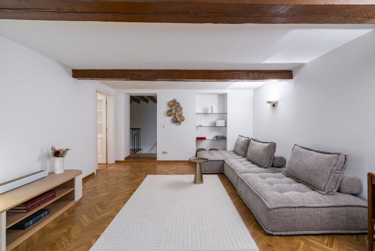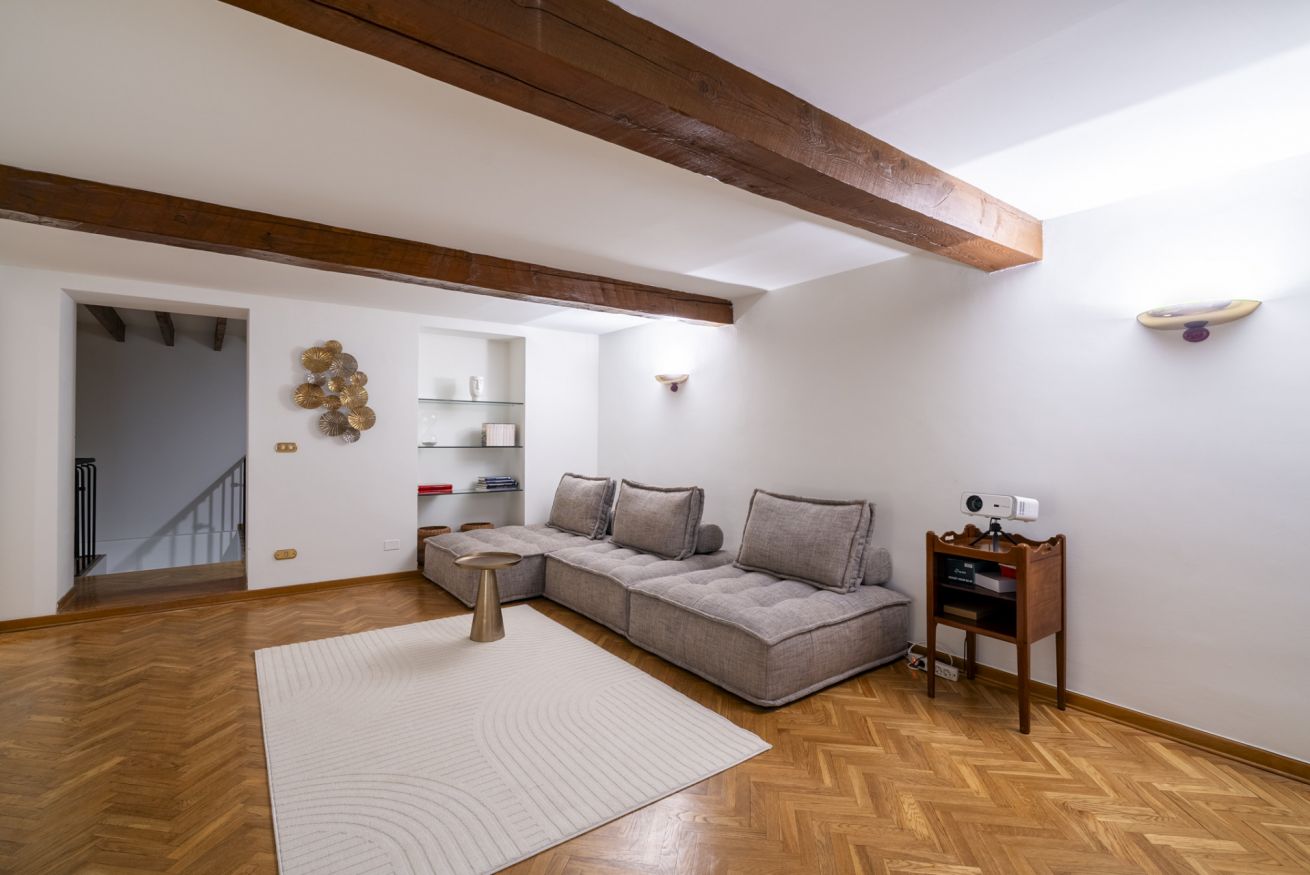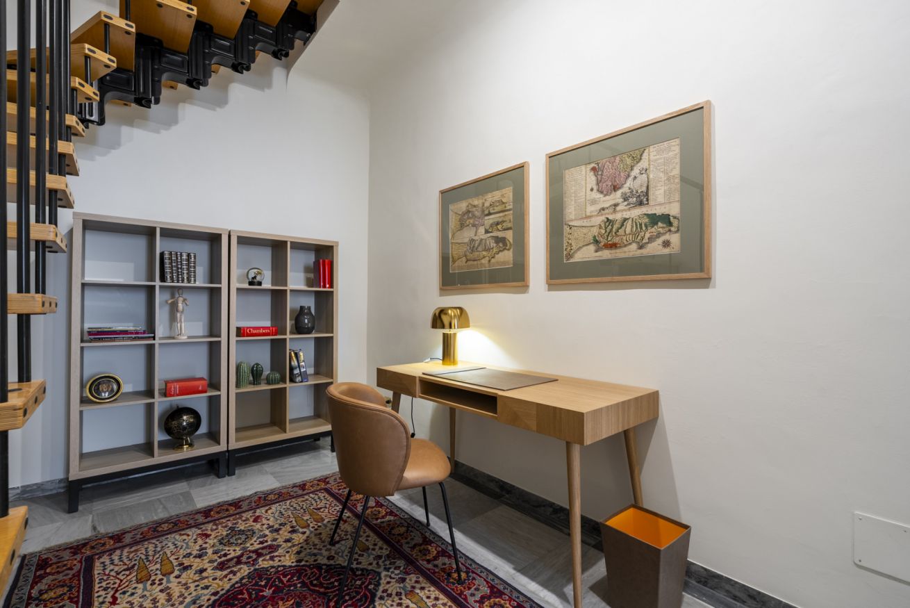 An elegant internal staircase leads to the lower level, which hosts the living area and the fourth bedroom. The staircase opens onto an anteroom thoughtfully furnished as a home office/workspace, which flows directly into the refined living room featuring precious and elegant furnishings. The room is enhanced by a beautiful decorative fireplace.