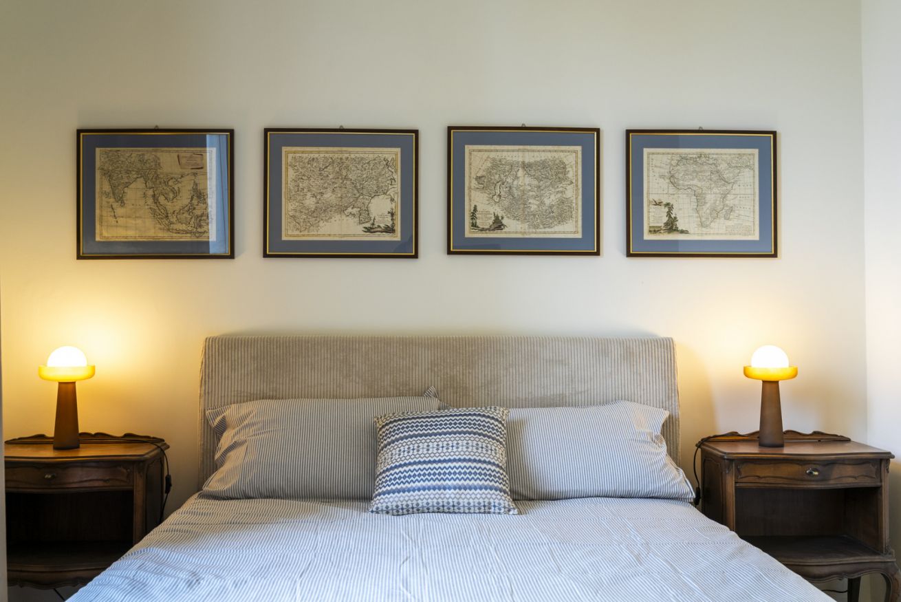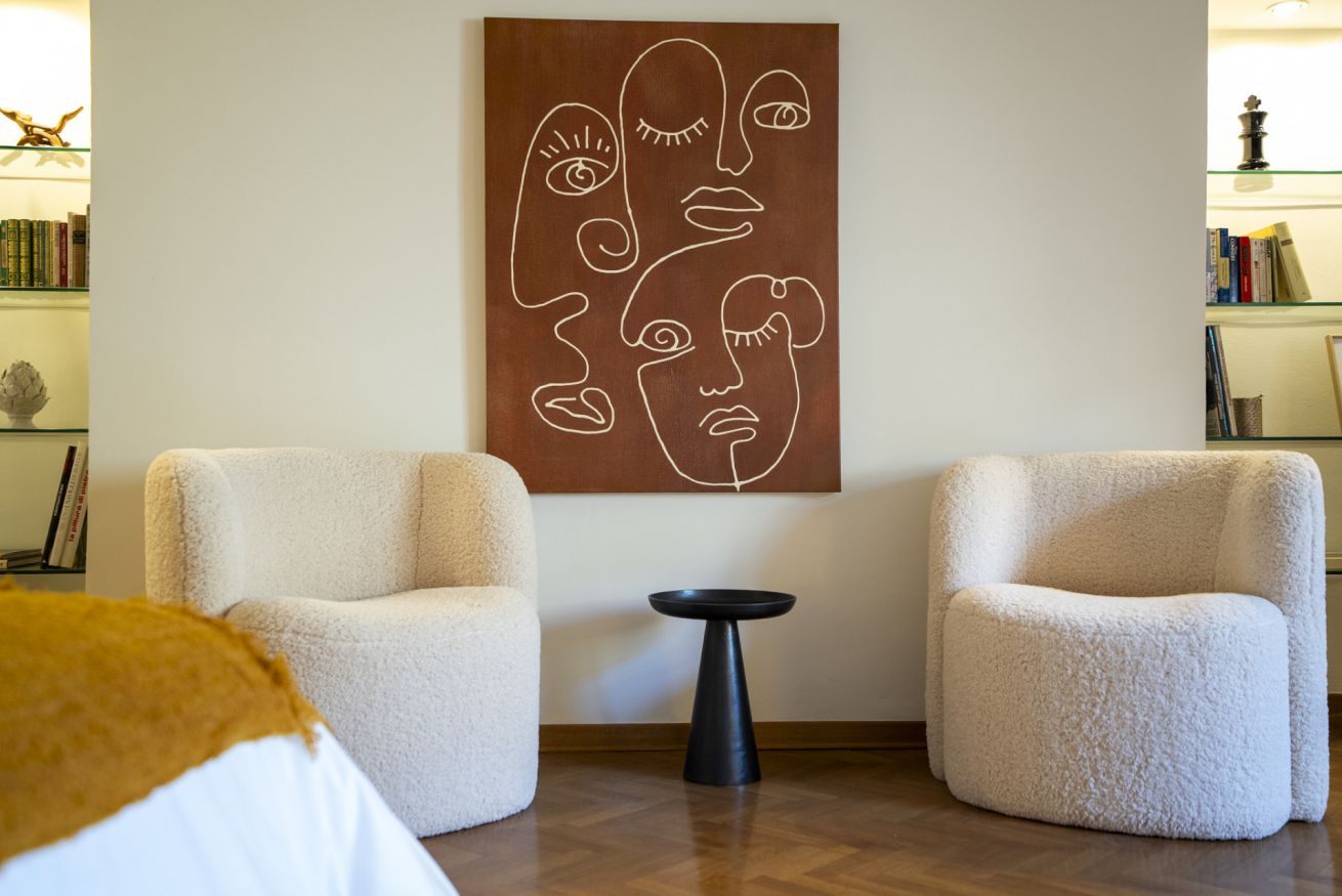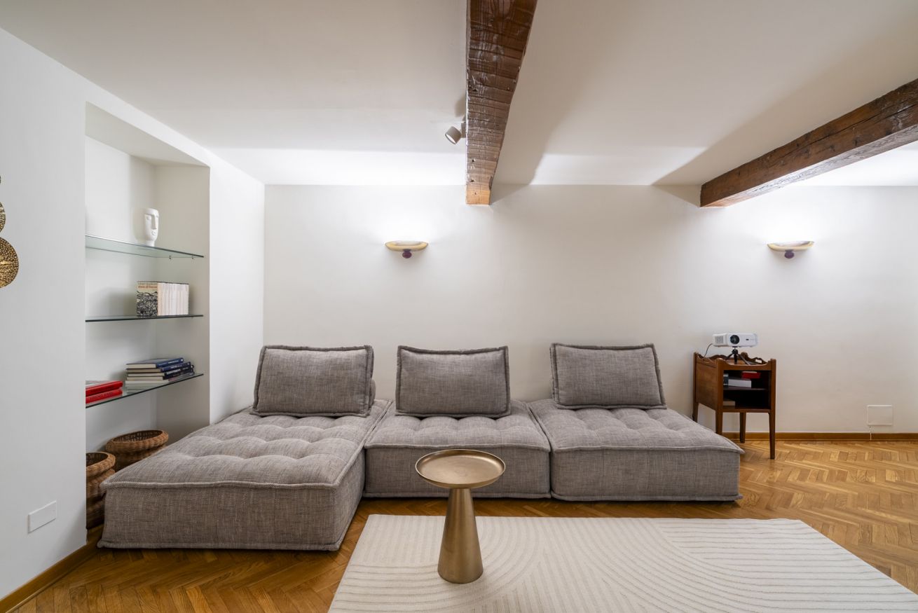 An elegant internal staircase leads to the lower level, which hosts the living area and the fourth bedroom. The staircase opens onto an anteroom thoughtfully furnished as a home office/workspace, which flows directly into the refined living room featuring precious and elegant furnishings. The room is enhanced by a beautiful decorative fireplace.