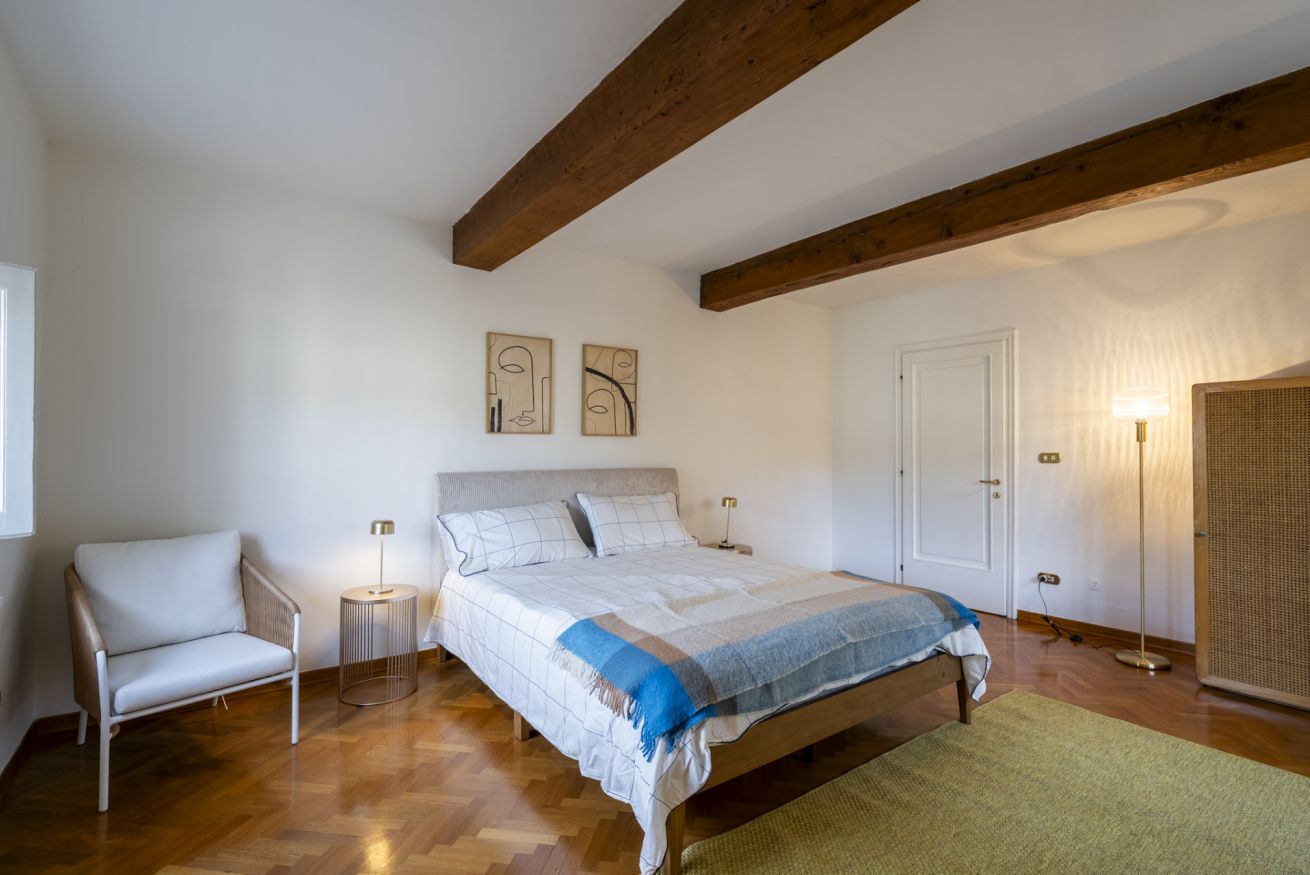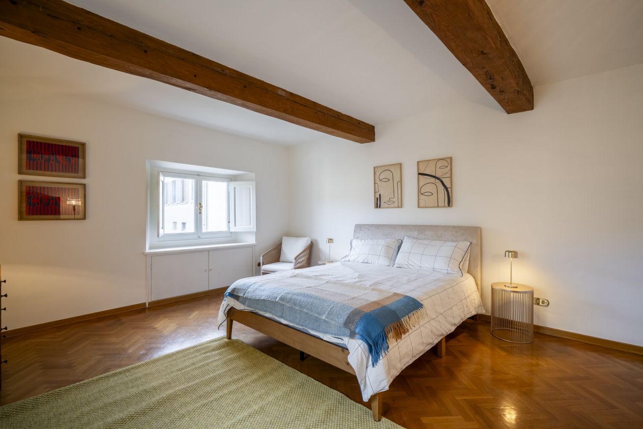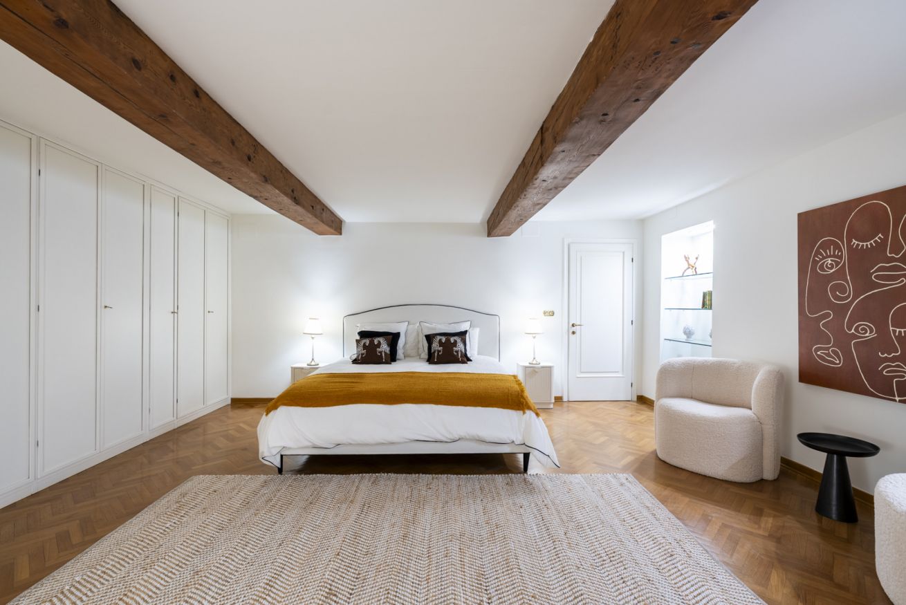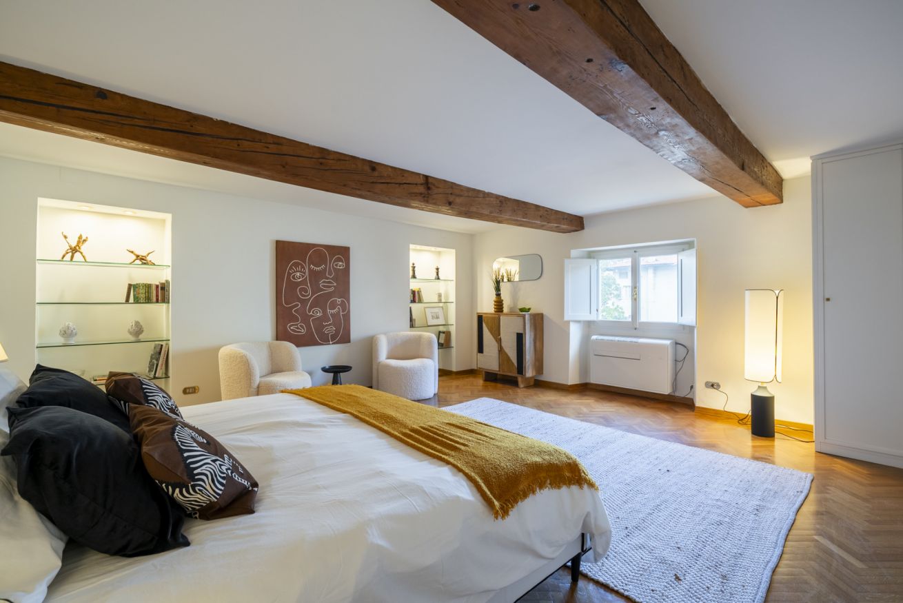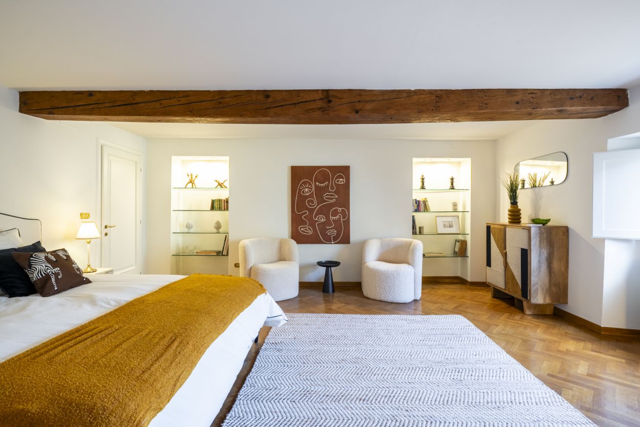 Framed by charming exposed beams and furnished in a refined yet minimalist style, the master bedroom is a true suite, complete with a pleasant sitting area and a large built-in wardrobe. The spacious en-suite master bathroom includes both a separate bathtub and shower.