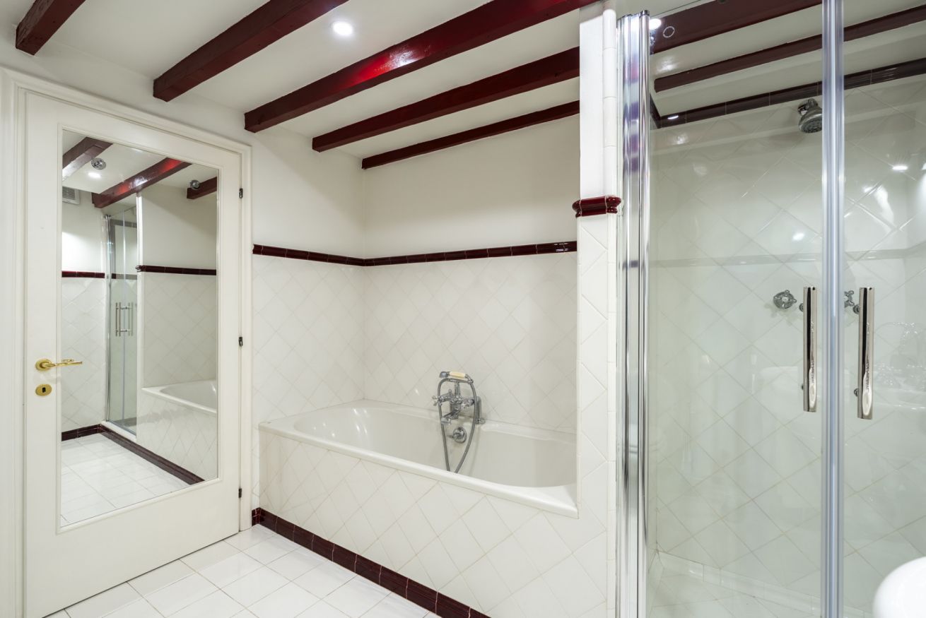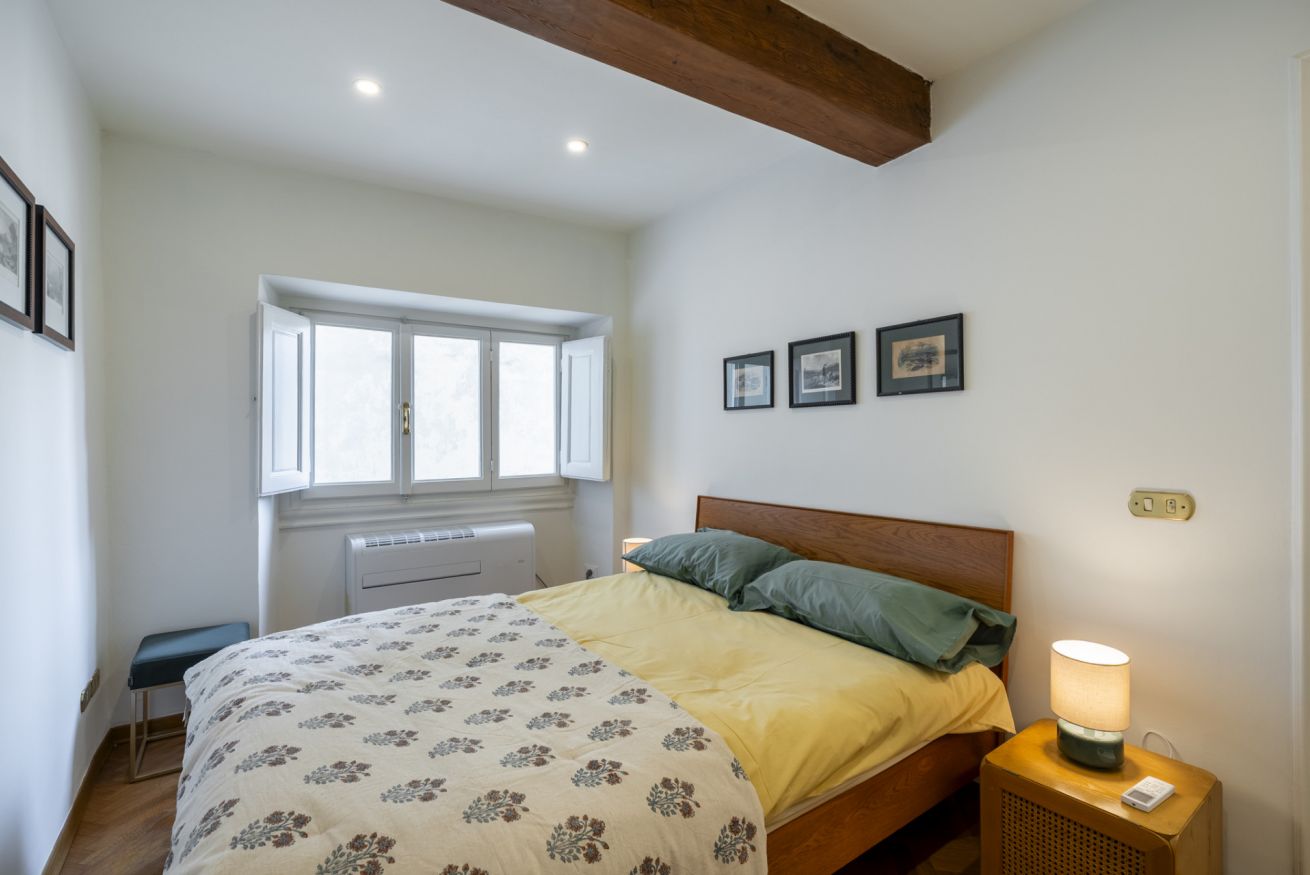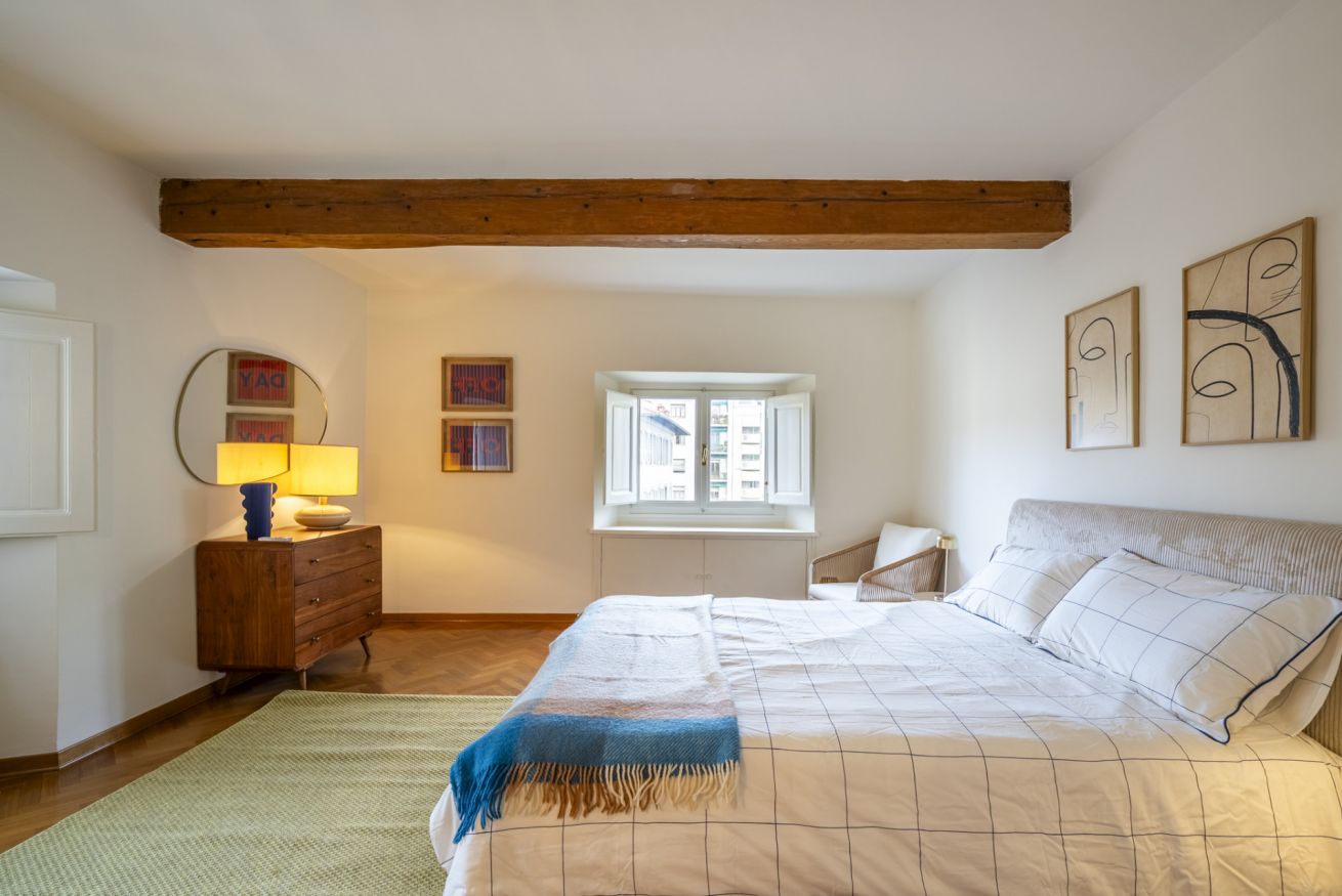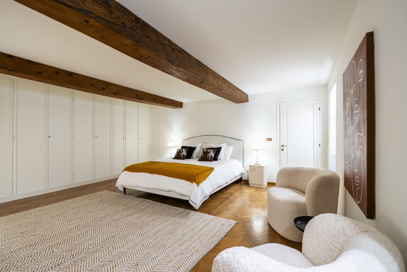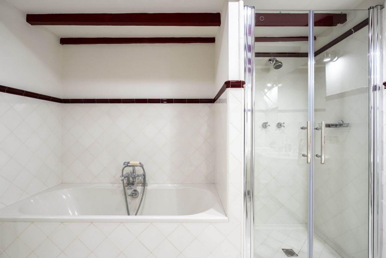Framed by charming exposed beams and furnished in a refined yet minimalist style, the master bedroom is a true suite, complete with a pleasant sitting area and a large built-in wardrobe. The spacious en-suite master bathroom includes both a separate bathtub and shower.