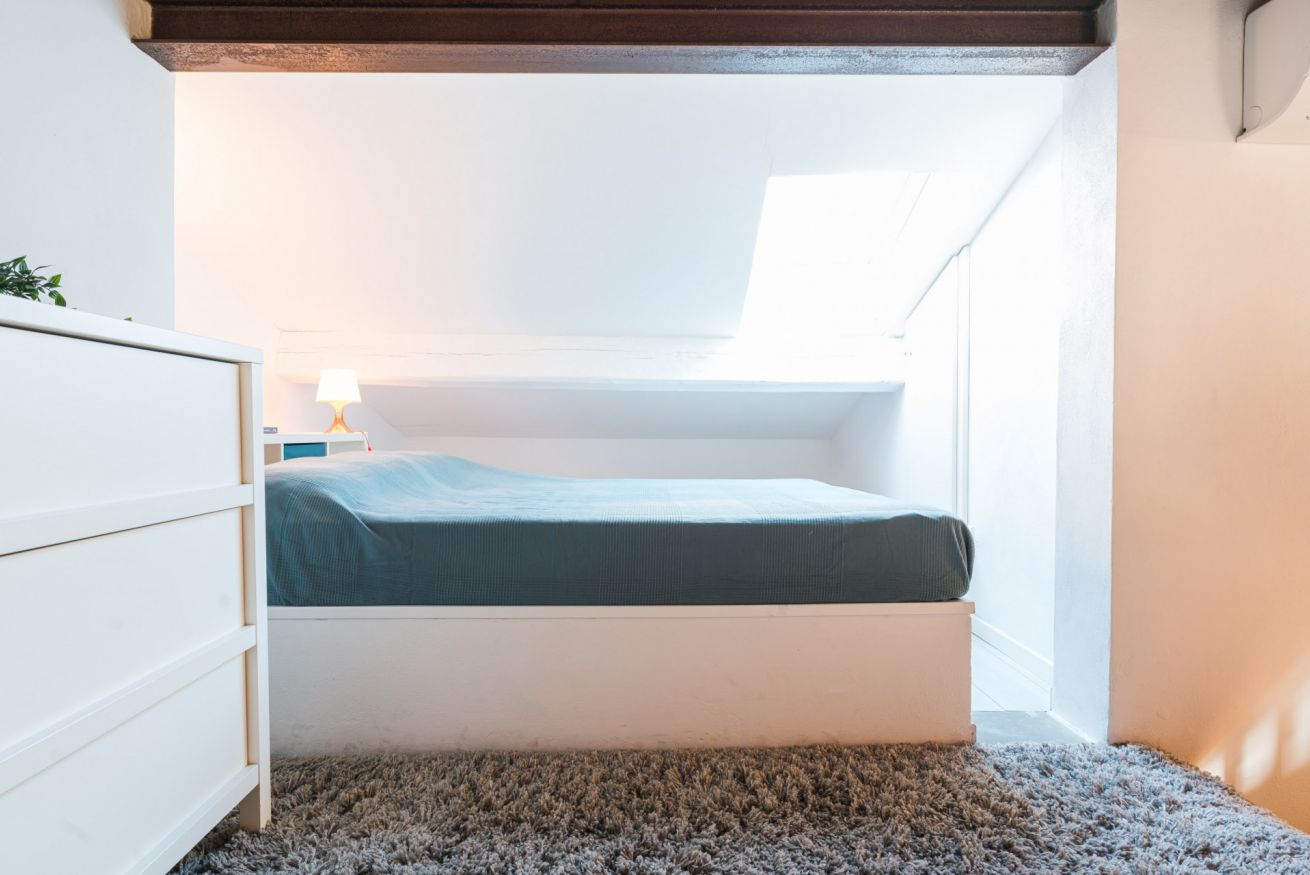 From the bedroom, a staircase leads to the mezzanine level, which hosts the second double bedroom and a cozy study/work corner.